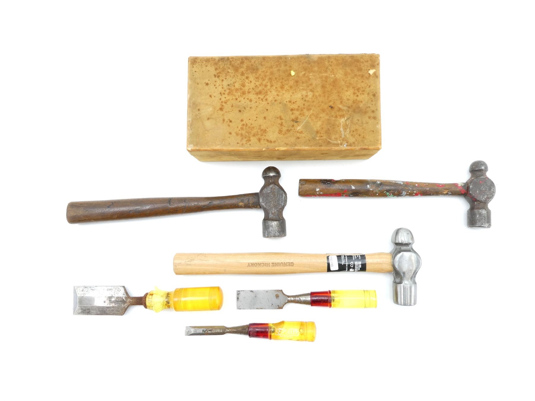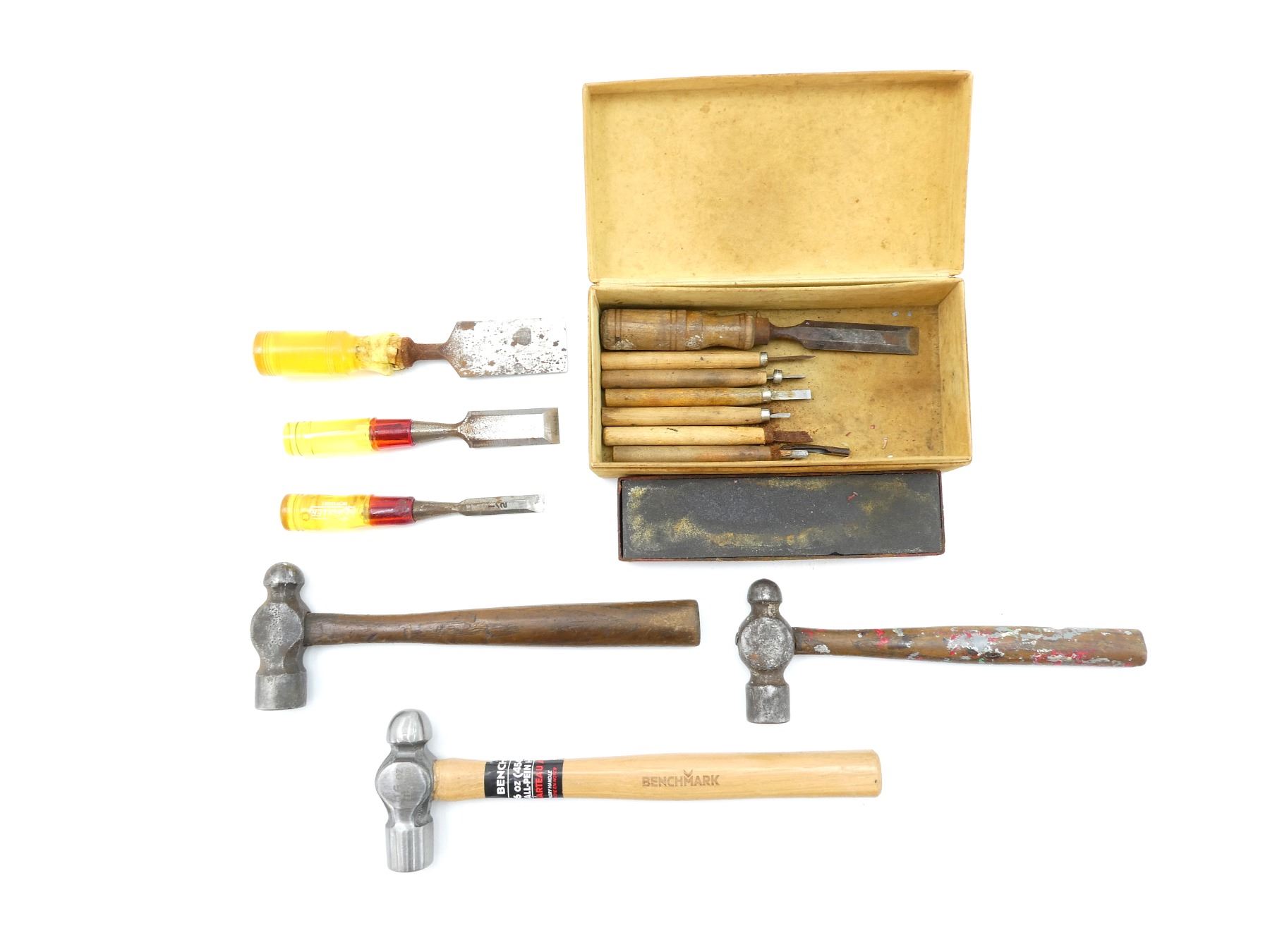 LOT INCLUDES; (1) BENCHMARK HAMMER, 16OZ, OVERALL LENGTH APPROX. 12.5", SHOWS WEAR & TEAR / USE MARKS, (2) UNKNOWN HAMMERS, UNMARKED, OALS APPROX. 10" & 11 5/8", SHOWS WEAR & TEAR / USE MARKS & (1) CHISEL SET, VARIOUS SIZES & ANGLES, SHOWS WEAR & TEAR / USE MARKS, ETC. SEE PHOTOS.