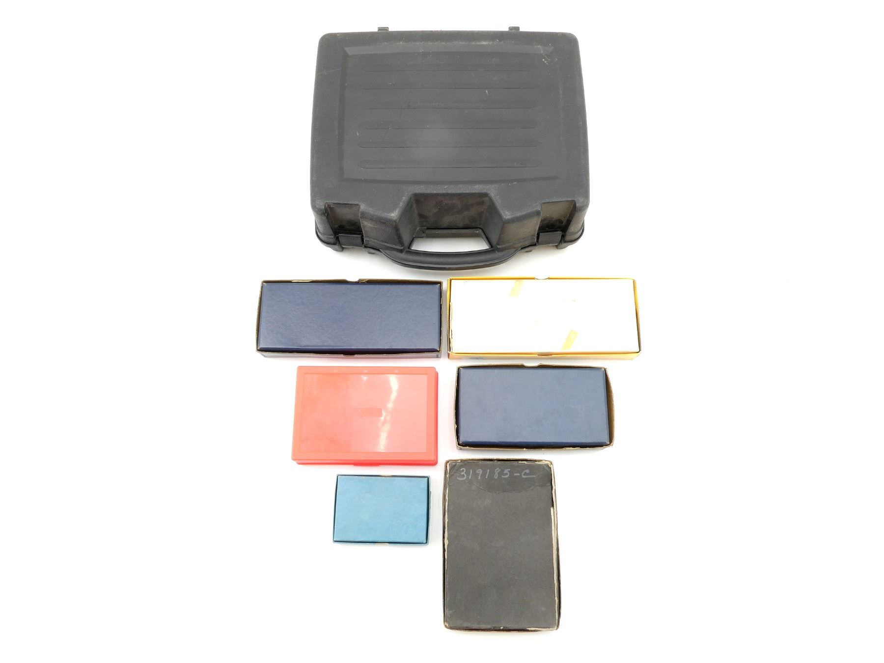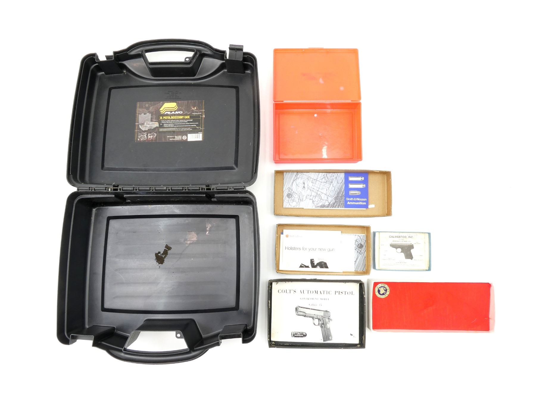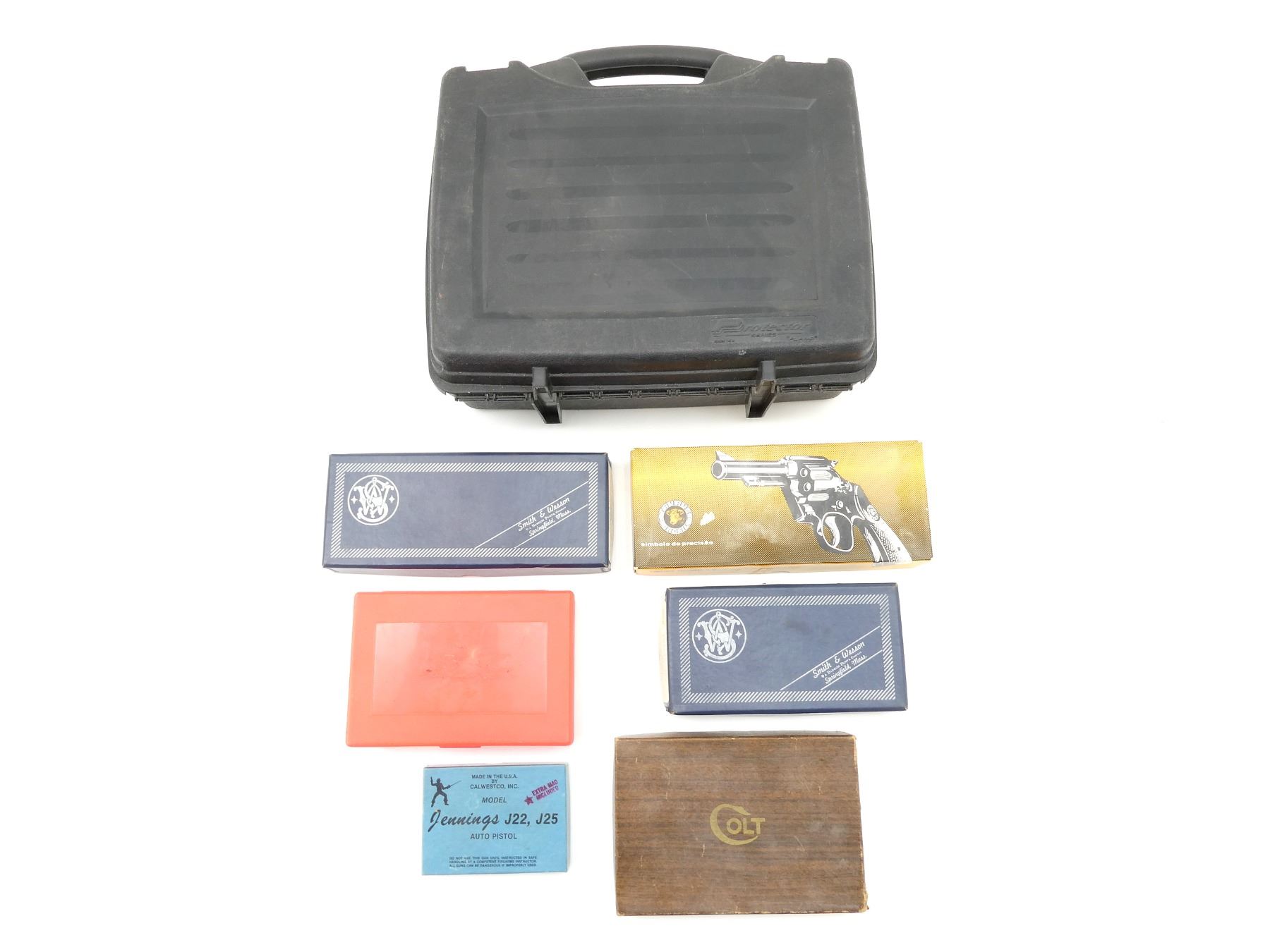 LOT INCLUDES; (1) BLACK NON-PADDED HAND GUN CASE, CARRY HANDLE, (2) LATCHES, (1) CALWEST CO JENNINGS J22, J25 AUTO PISTOL EMPTY BOX. (1)COLT GOVERNMENT MODEL 45 AUTO PISTOL EMPTY BOX, (1) TAURUS .38 SPECIAL HAND GUN EMPTY BOX, (1) SMITH & WESSON HAND GUN EMPTY BOX, (1) SMITH & WESSON HAND GUN EMPTY BOX, ETC., APPROX. OVERALL LENGTH 5 1/4"-15", SHOWS WEAR AND TEAR FROM USAGE, SEE PHOTOS