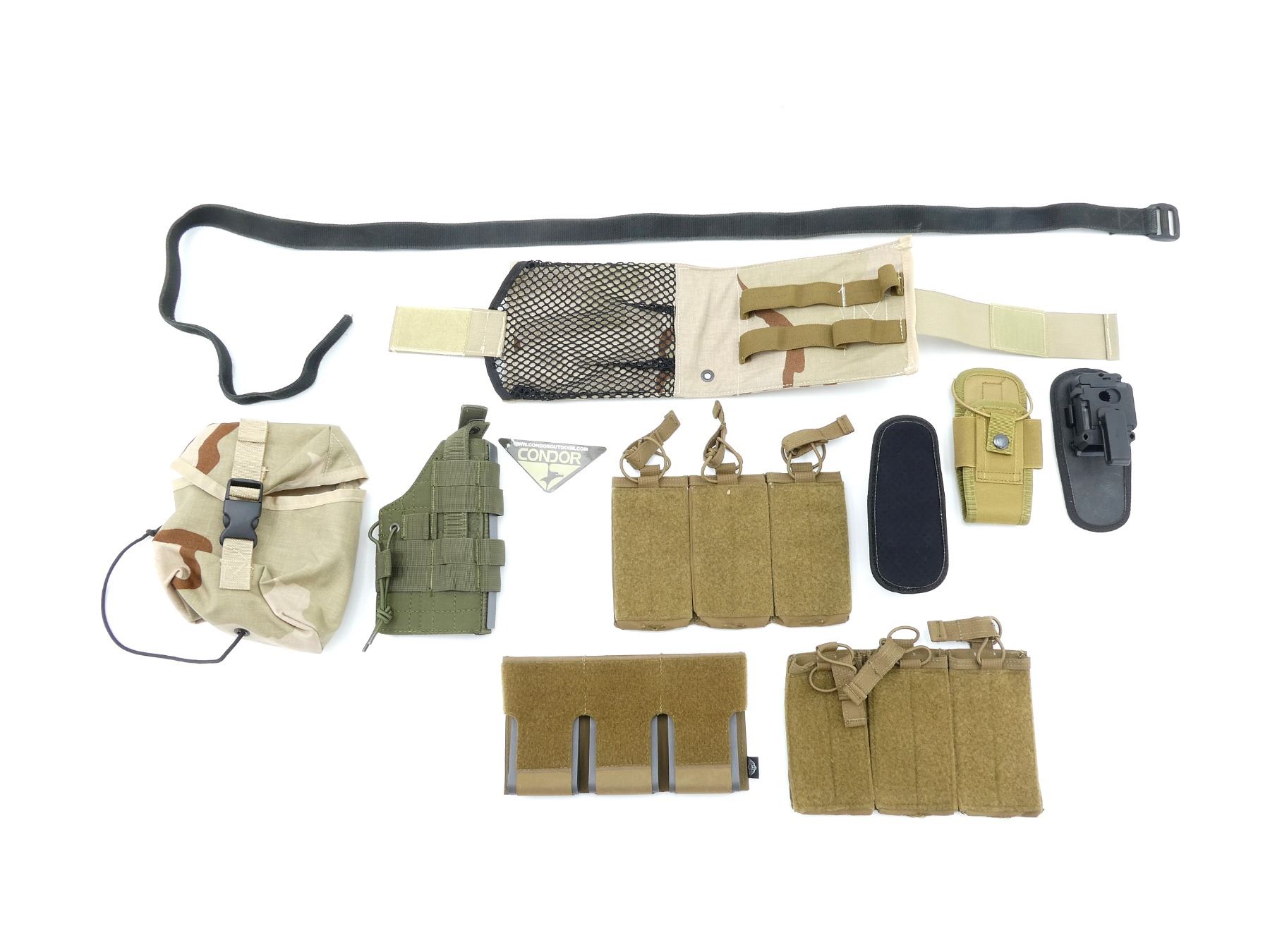 LOT INCLUDES; (1) CONDOR GREEN NYLON AMBIDEXTROUS HOLSTER WITH MOLLE LOOPS / ETC., (1) TAN NYLON POUCH WITH ACCESSORY POUCH, (2) ALIEN GEAR 9MM / .40 S&W MAG POUCHES, BLACK POLYMER, ASSORTED BROWN VELCRO AR-15 SIZED MAG POUCHES, ETC. SEE PHOTOS.