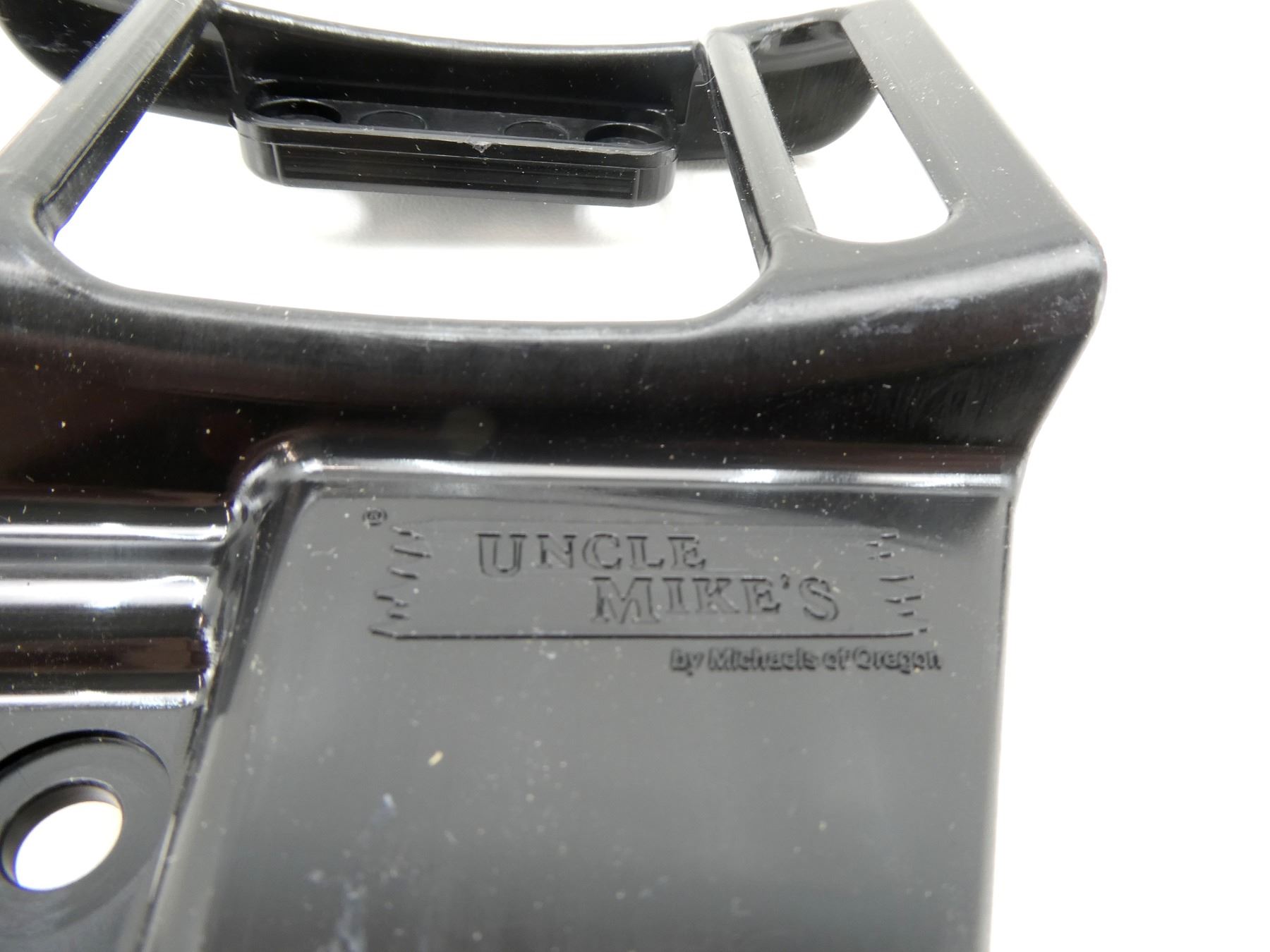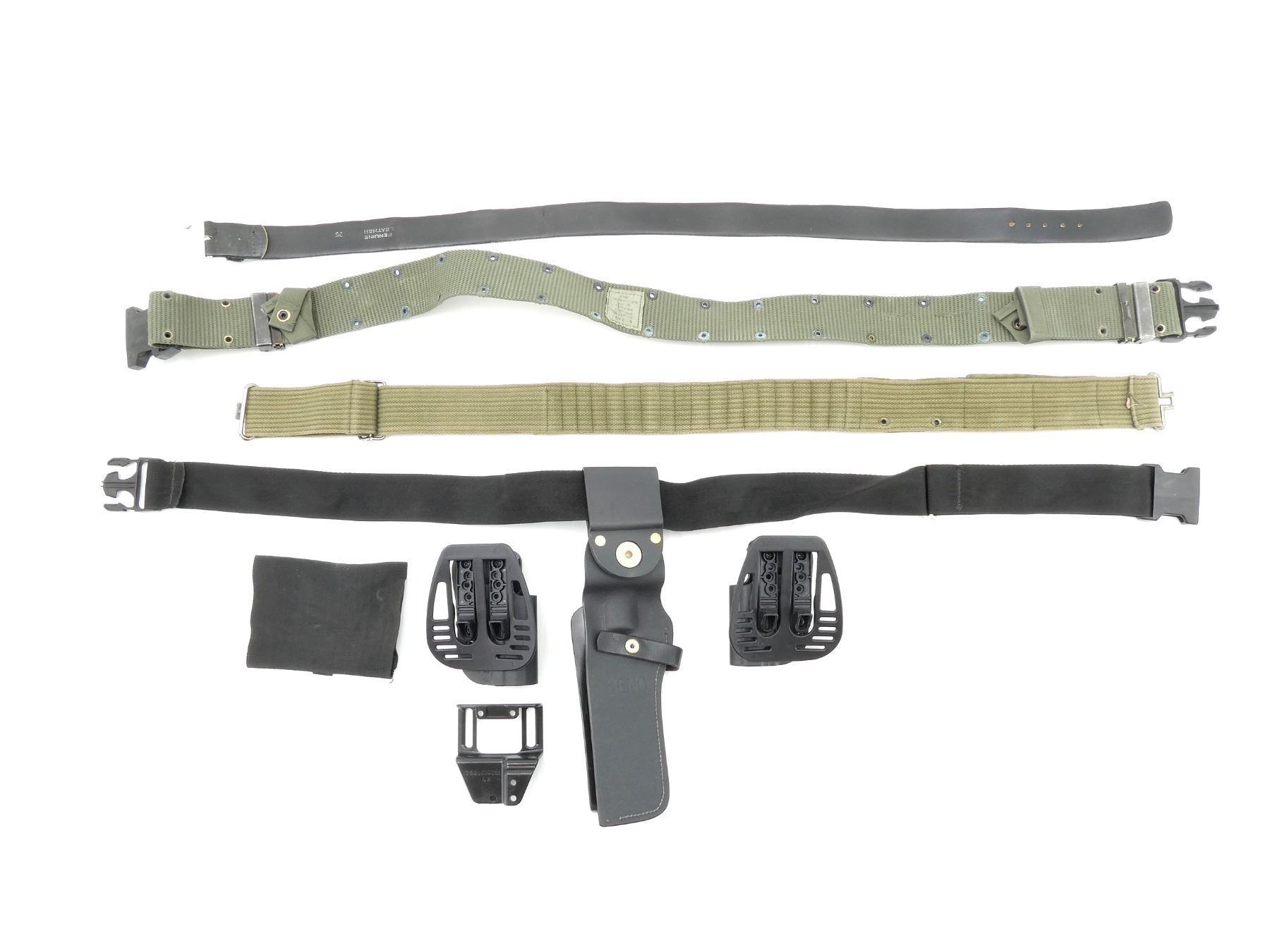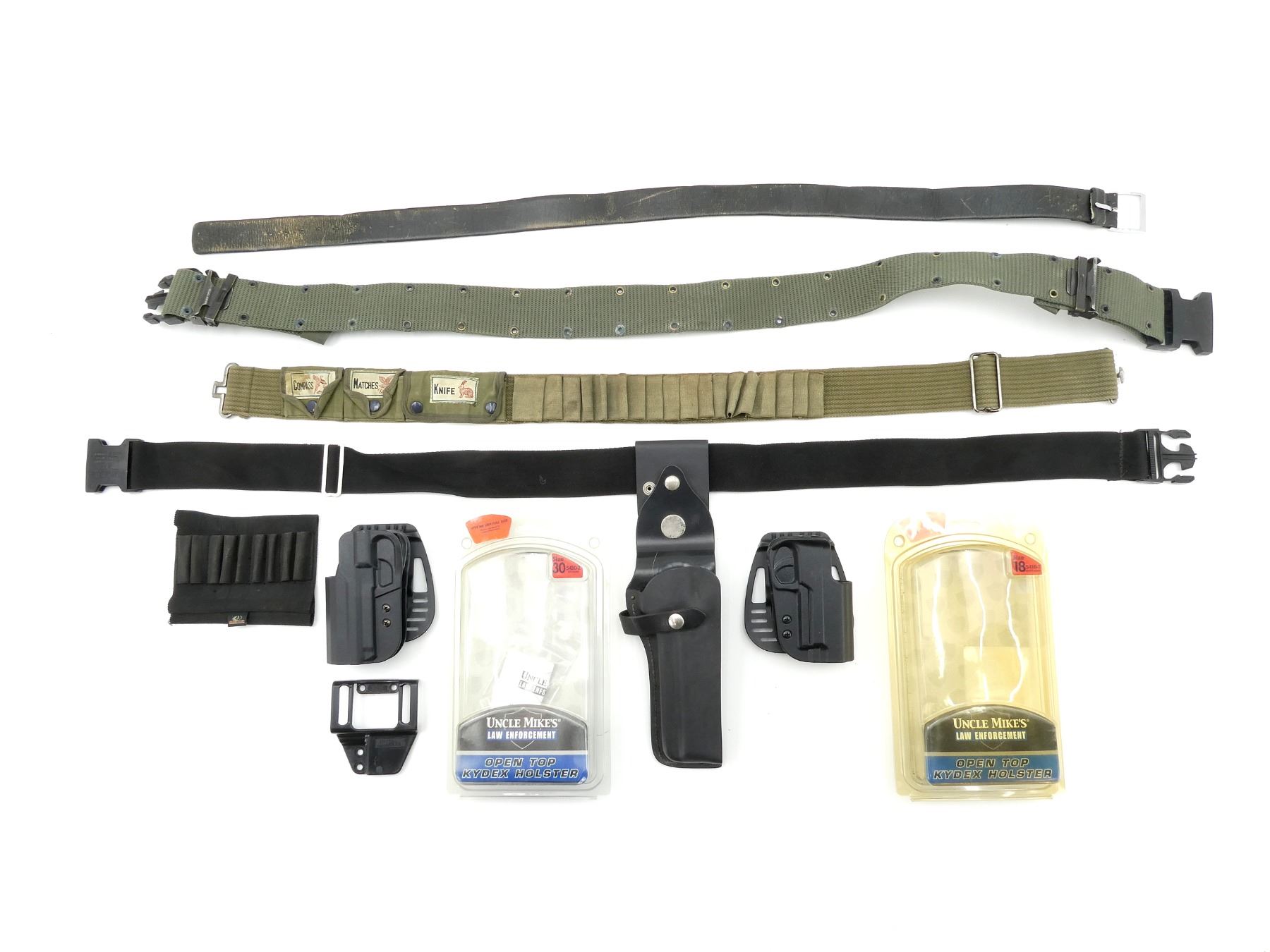 LOT INCLUDES; (1) UNCLE MIKE'S LAW ENFORCEMENT HOLSTER, SIZE 18, RIGHT HANDED, FITS S&W 590 & CERTAIN 4000 SERIES, NEW OLD STOCK, (1) UNCLE MIKE'S LAW ENFORCEMENT HOLSTER, SIZE 30, LEFT HANDED, FITS HK USP FULL SIZE, NEW OLD STOCK, (1) AMMO BELT, WITH 18 STRETCHED ELASTIC LOOPS, POCKETS FOR COMPASS, MATCHES & KNIFE, OVERALL LENGTH APPROX. 37", ADJUSTABLE, (1) TACTICAL STYLE BELT, OVERALL LENGTH APPROX. 40", ADJUSTABLE, (1) BLACK HARD POLYMER HOLSTER, HOLSTER MARKED "RENO", OVERALL LENGTH APPROX. 8", (1) BLACK NYLON BELT, OVERALL LENGTH APPROX. 40", ADJUSTABLE, (1) BLACK LEATHER BELT, OVERALL LENGTH APPROX. 36" & (1) UNCLE MIKE'S SLIP ON SHELL HOLDER. SEE PHOTOS.