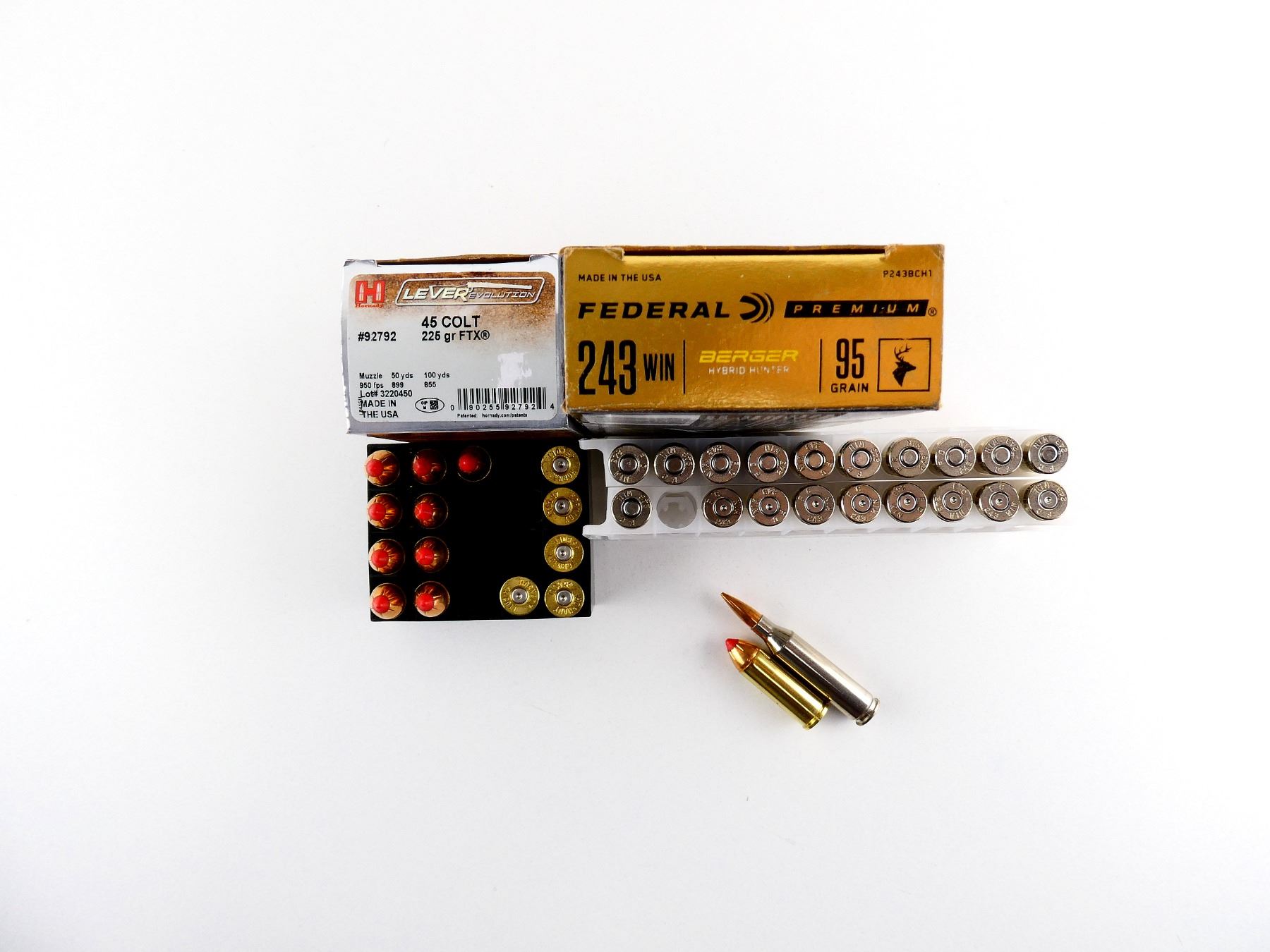 ASSORTED HORNADY.45 COLT / FEDERAL .243 WIN AMMO AND NON-PRIMED BRASS / NICKEL CASE LOT