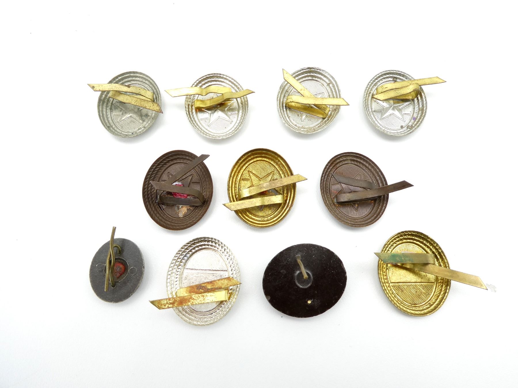 LOT INCLUDES; (11) CAP BADGES, BRASS / BRONZE / SILVER WITH ENAMELED FRONTS, SOME FOR ENLISTED MEN, SOME FOR OFFICER'S, ONE HAS BROKEN PIN ON BACK. SEE PHOTOS.