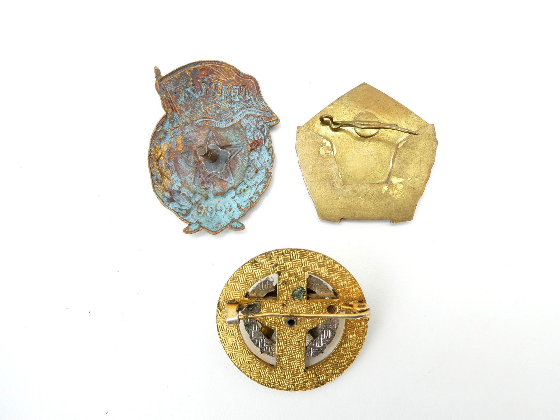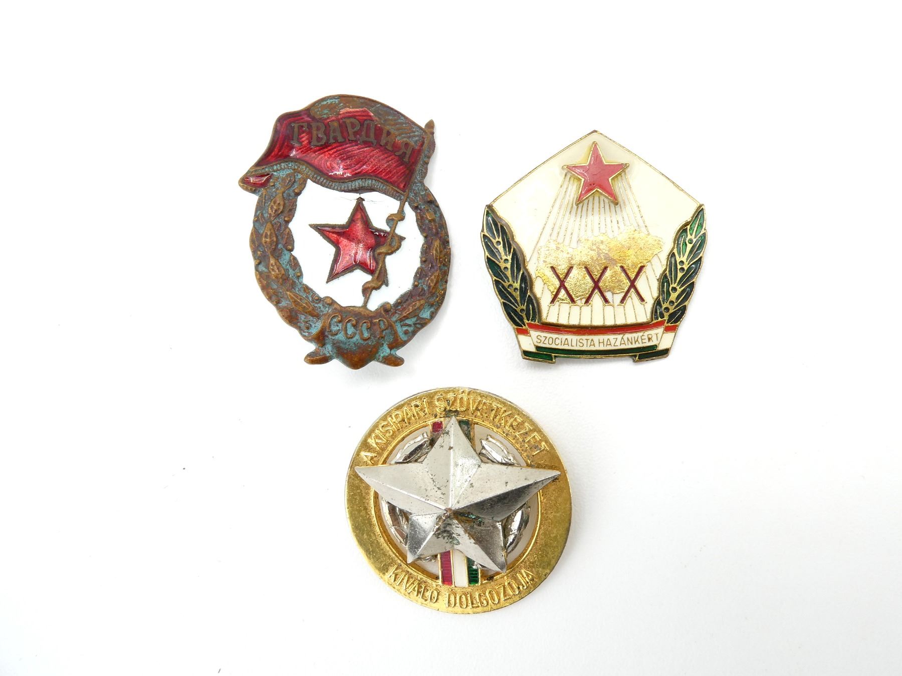 LOT INCLUDES; (1) HUNGARIAN MILITARY EXCELLENT WORKER OF COLLECTIVE INDUSTRY / PERFECT WORKERS ORDER BADGE, PIN INTACT, (1) HUNGARIAN MILITARY 30 YEARS SOCIALIST PATRIOT BADGE, PIN BROKEN & (1) WWII / POST-WWII RUSSIAN MILITARY GUARDS BADGE, SOME ENAMEL DAMAGE / CORROSION, MISSING BACKING. SEE PHOTOS.