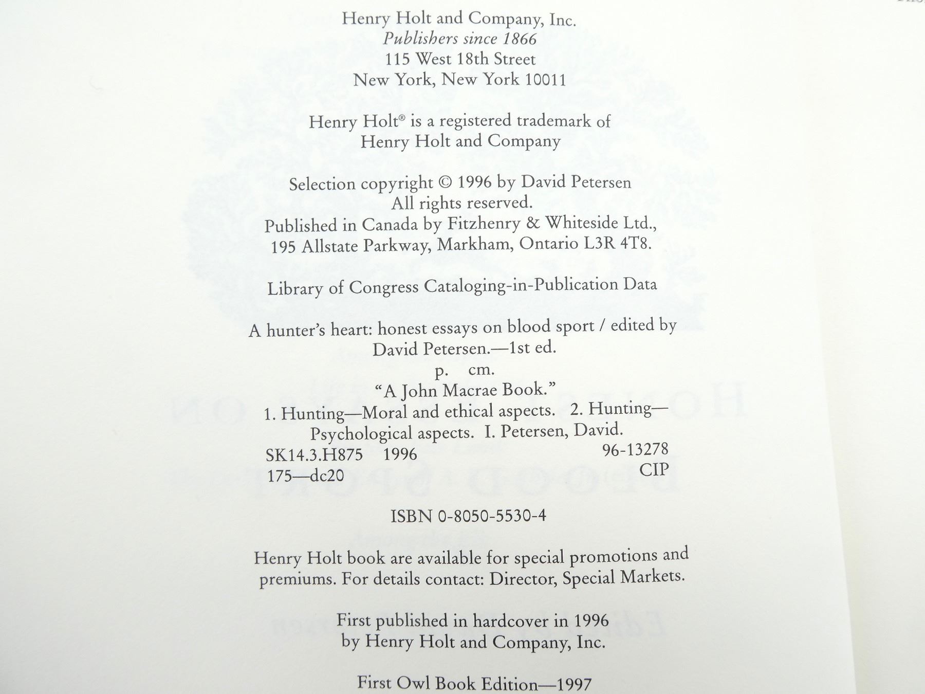 LOT INCLUDES; (1) "A HUNTER'S HEART" BOOK COLLECTED BY DAVID PETERSEN, SOFT COVER, ISBN: 0-8050-5530-4, (1) "IN DEFENSE OF HUNTING" BOOK BY JAMES A. SWAN, SOFT COVER, ISBN: 0-06-251237-4, (1) "BLOODTIES" BOOK BY TED KERASOTE, SOFT COVER, ISBN: 1-56836-027-4, (1) "BEYOND FAIR CHASE" BOOK BY JIM POSEWITZ, SOFT COVER, ISBN: 1-56044-283-2 & (1) "CLASSIC HUNTING STORIES" BOOK EDITED BY LAMAR UNDERWOOD, SOFT COVER, ISBN: 1-59228-057-9. SEE PHOTOS.