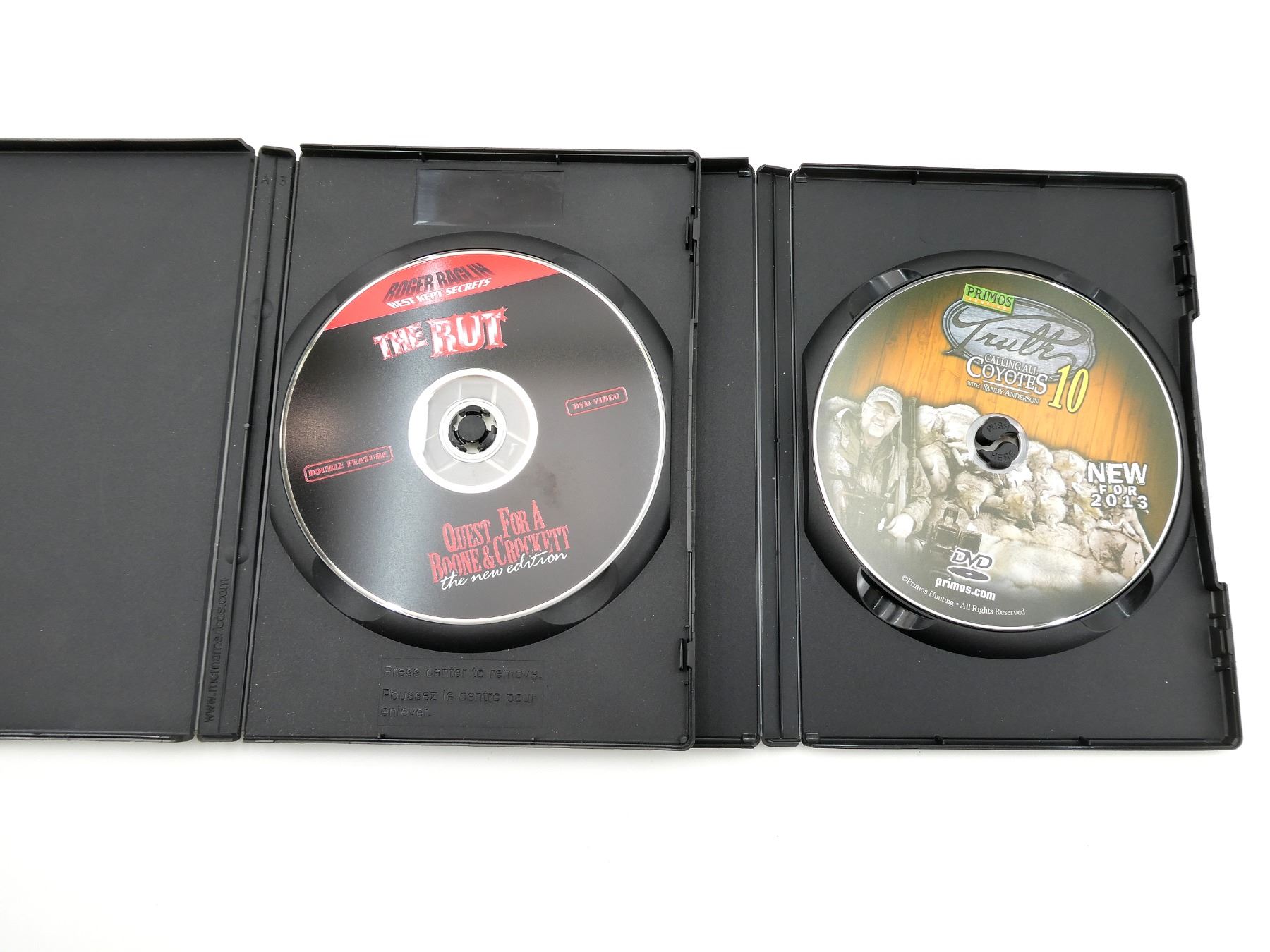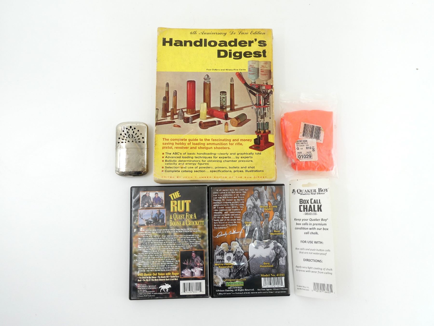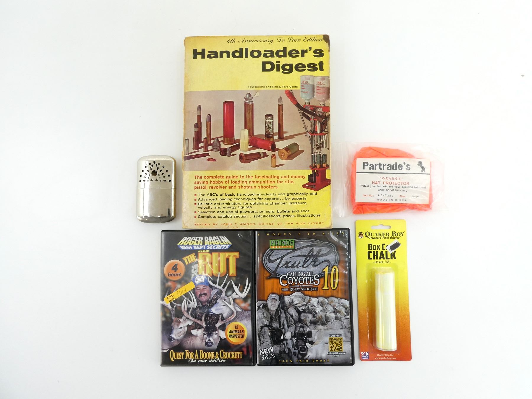 LOT INCLUDES; (1) QUAKER BOY GREASELESS BOX CALL CHALK, NEW OLD STOCK, SEALED IN ORIGINAL PACKAGING, (1) PRIMOS HUNTING "CALLING ALL COYOTES 10 WITH RANDY ANDERSON" DVD, (1) "ROGER RAGLIN BEST KEPT SECRETS PRESENTS THE RUT" DVD, (1) PARTRADE'S ORANGE HAT PROTECTOR, SIZE LARGE, ITEM #: 347220, APPEARS NEW OLD STOCK, (1) HAND WARMER & (1) "HANDLOADER'S DIGEST 4TH ANNIVERSARY DELUXE EDITION" BOOK, EDITED BY JOHN T. AMBER, SOFT COVER, COPYRIGHT MCMLXVIII. SEE PHOTOS.