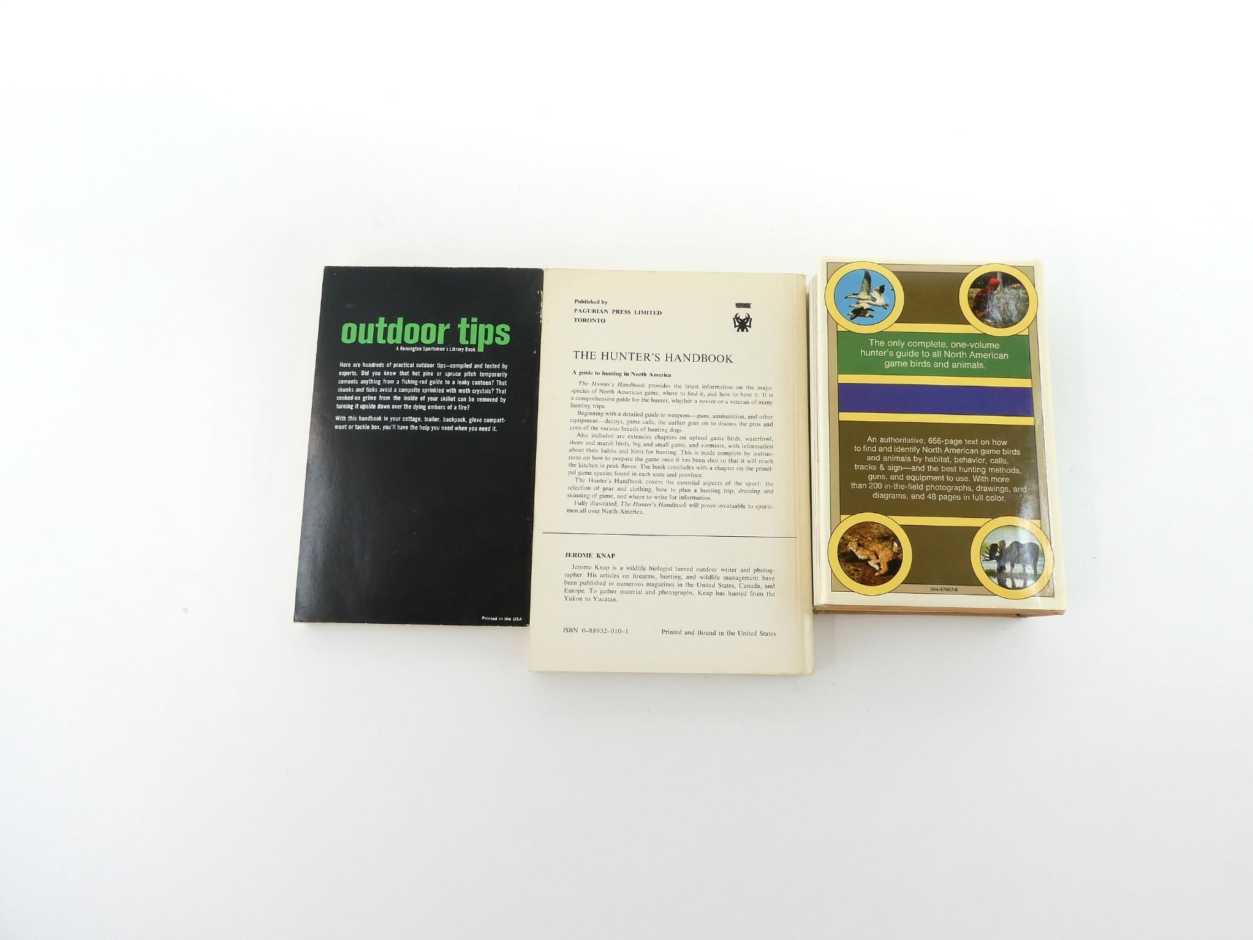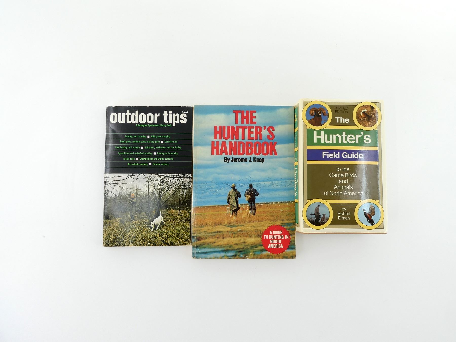LOT INCLUDES; (1) "THE HUNTER'S FIELD GUIDE TO THE GAME BIRDS AND ANIMALS OF NORTH AMERICA" BOOK BY ROBERT ELMAN, HARD COVER WITH DUST COVER, COPYRIGHT 1982, (1) "THE HUNTER'S HANDBOOK" BY JEROME J. KNAP, SOFT COVER, ISBN: 0-88932-010-1 & (1) "OUTDOOR TIPS" BOOK, BY THE REMINGTON SPORTSMEN'S LIBRARY, SOFT COVER, ISBN: 0-87502-905-1. SEE PHOTOS.