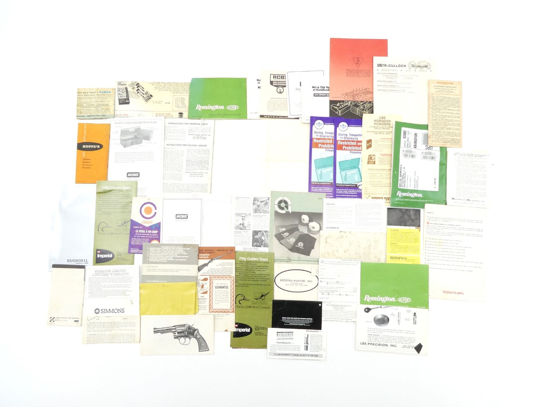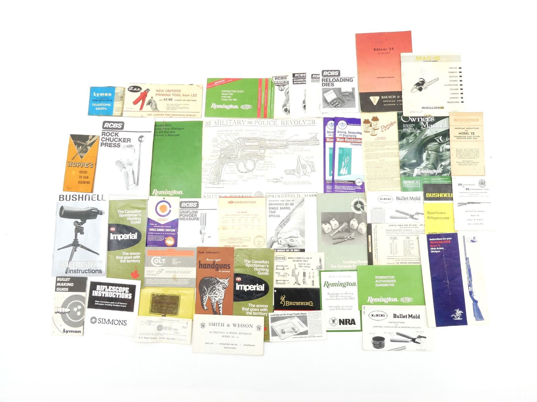 LOT INCLUDES; (1) "INSTRUCTIONS FOR YOUR WINCHESTER MODEL 12 SLIDE ACTION SHOTGUN", BY WINCHESTER, SOFT COVER, FORM NO. 4049, (1) "HOPPE'S GUIDE TO GUN CLEANING", BY HOPPE'S, SOFT COVER, COPYRIGHT 1959, (1) "MAC-10 SERIES CHAIN SAWS", BY MCCULLOCH CORPORATION, SOFT COVER, COPYRIGHT 1968 & (3) "RELOADING DIE INSTRUCTIONS", BY RCBS, SOFT COVER, ETC. SEE PHOTOS.