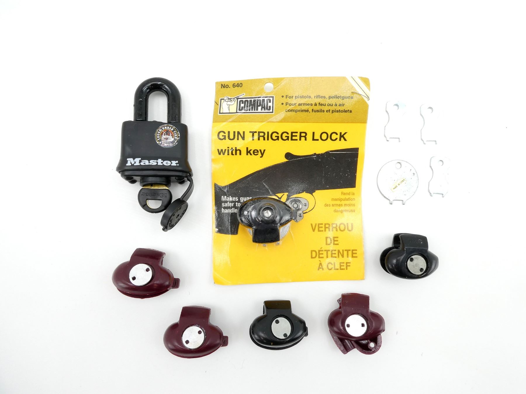 LOT INCLUDES; (1) KEYED LOCK, WITH KEYS, BLACK, MARKED: "MASTER", (1) COMPAC GUN TRIGGER LOCK WITH KEY, PLASTIC, NEW OLD STOCK IN ORIGINAL SEALED PACKAGING & (5) ASSORTED PLASTIC KEYED TRIGGER LOCKS, WITH KEYS. SEE PHOTOS.
