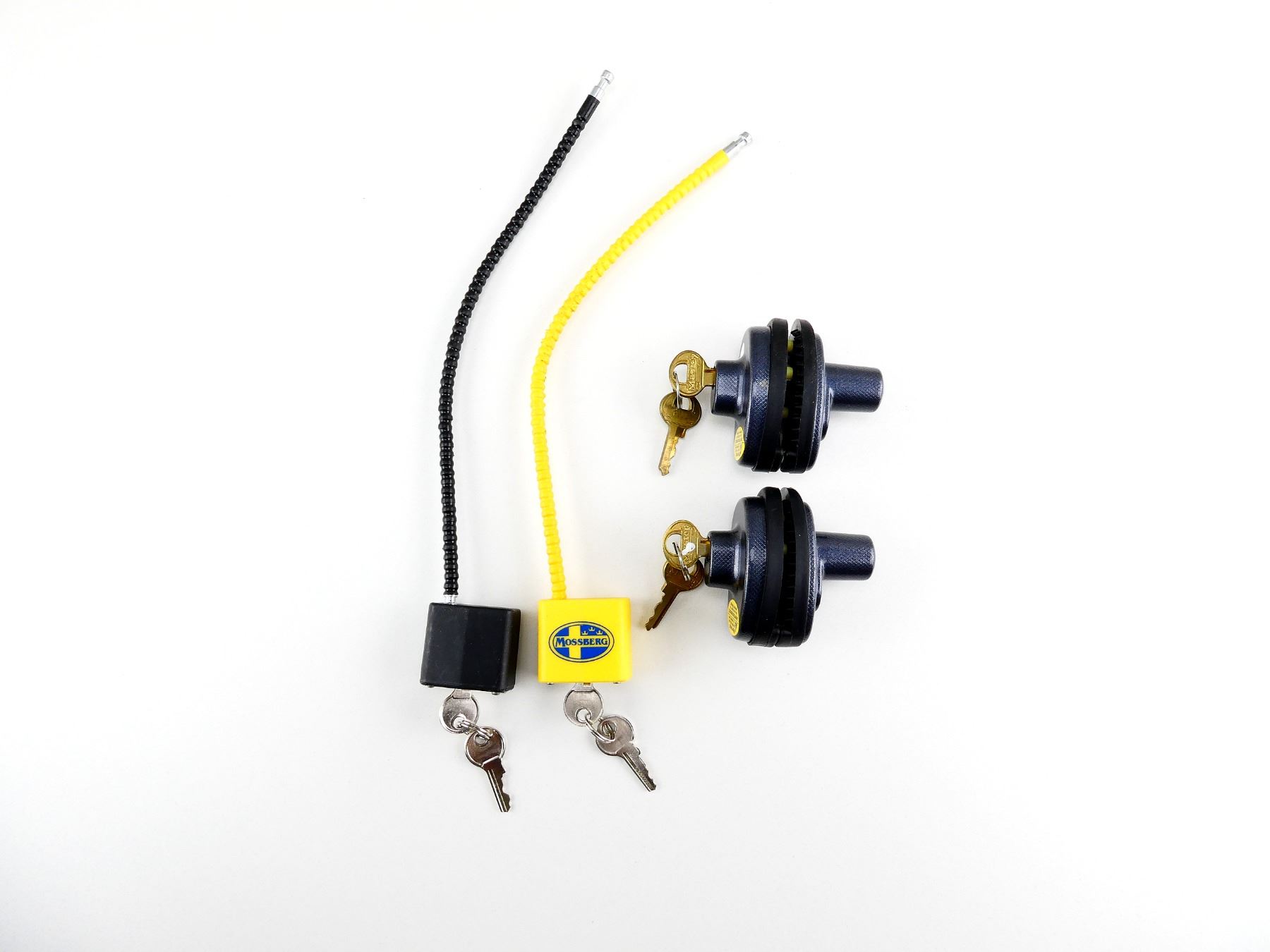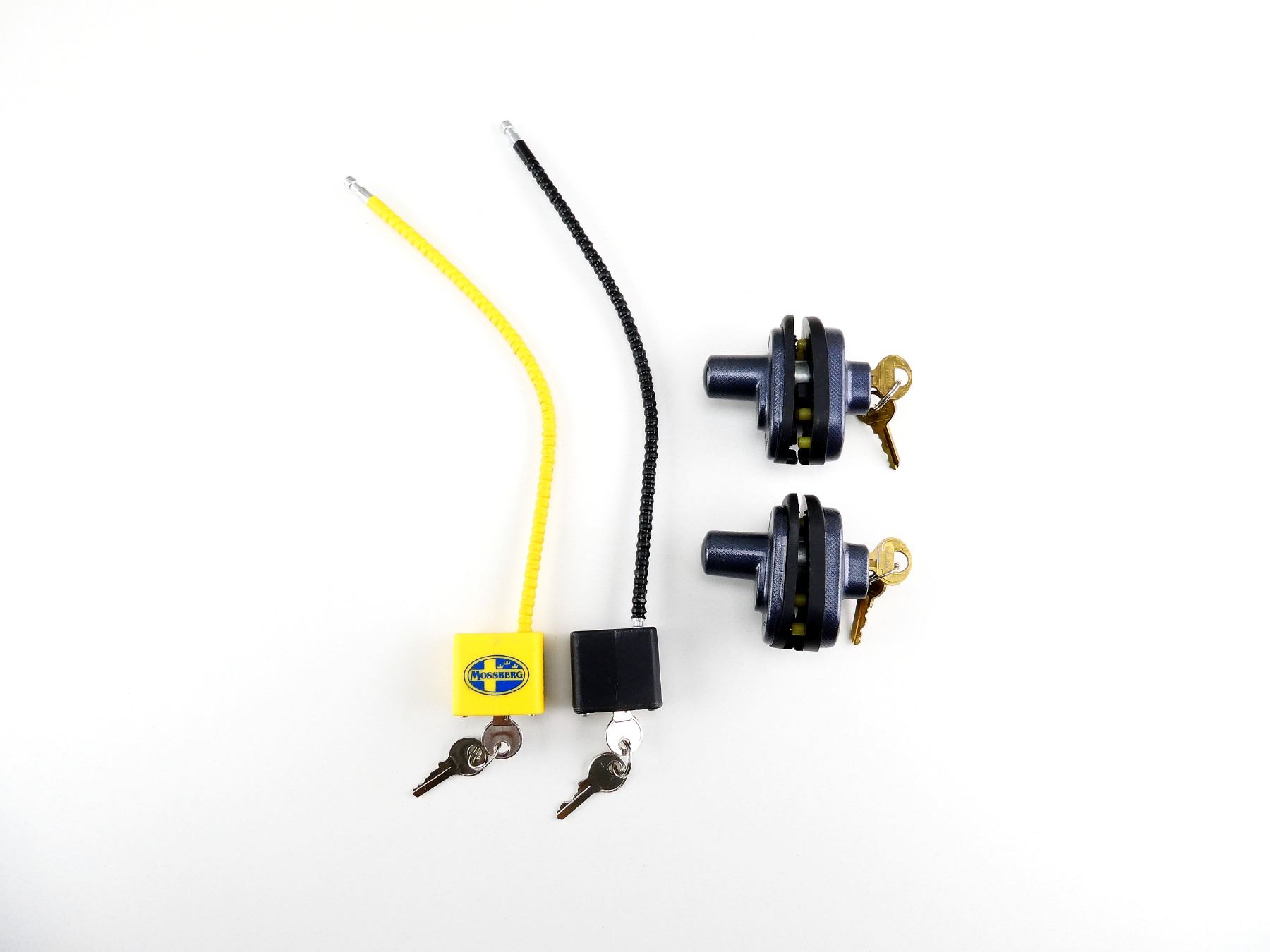 LOT INCLUDES; (2) MASTER KEYED TRIGGER LOCKS WITH KEYS, (1) MOSSBERG KEYED LOCK WITH KEYS & (1) UNKNOWN KEYED LOCK WITH KEYS. SEE PHOTOS.