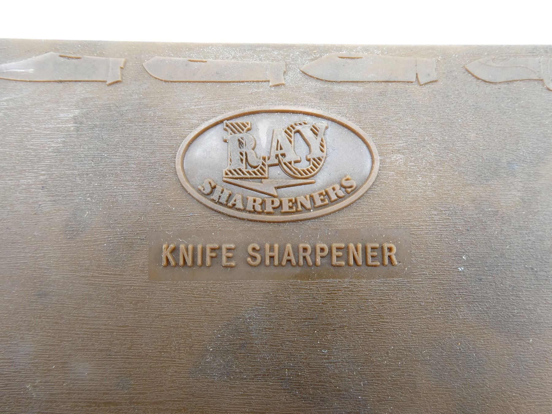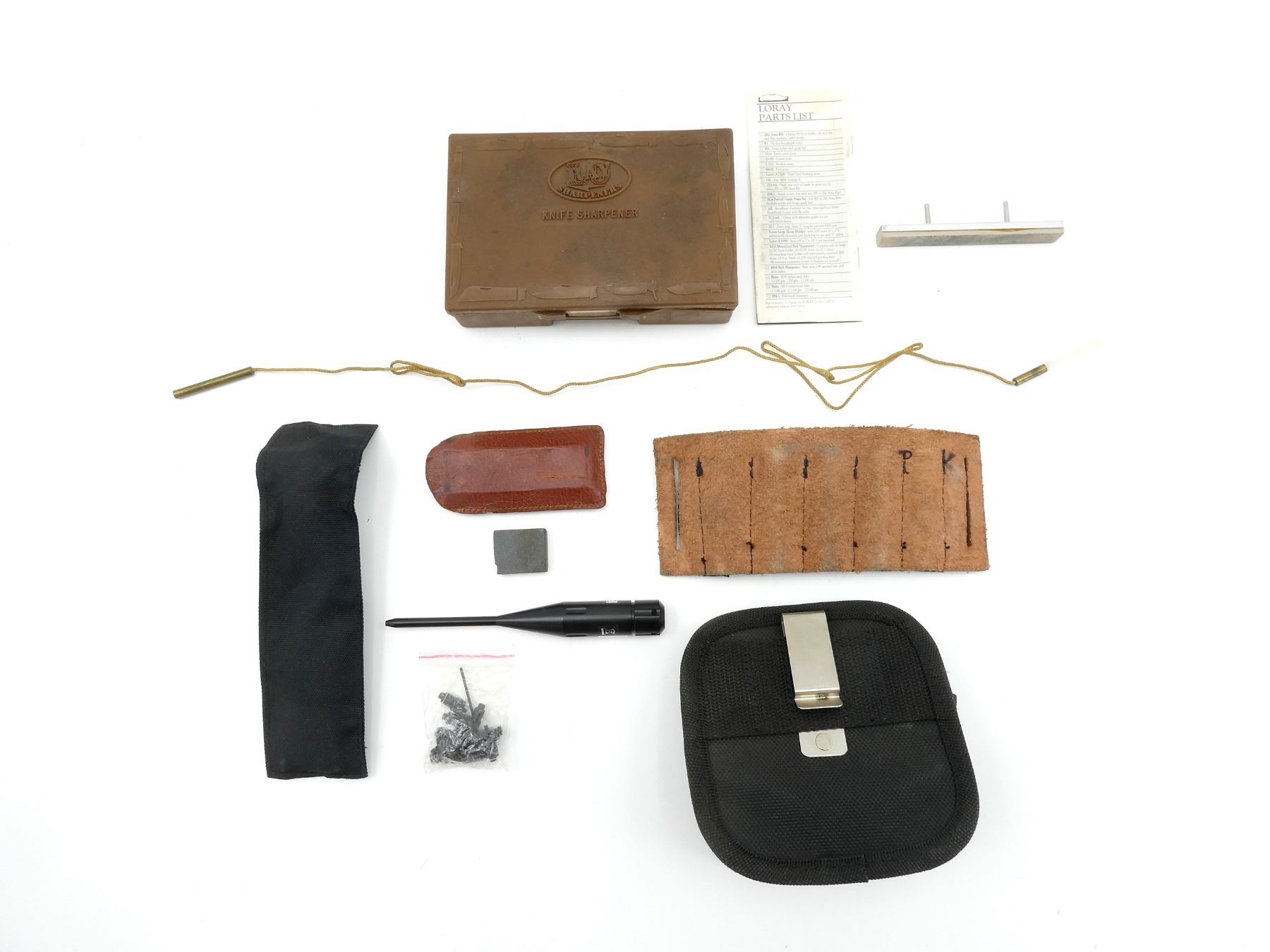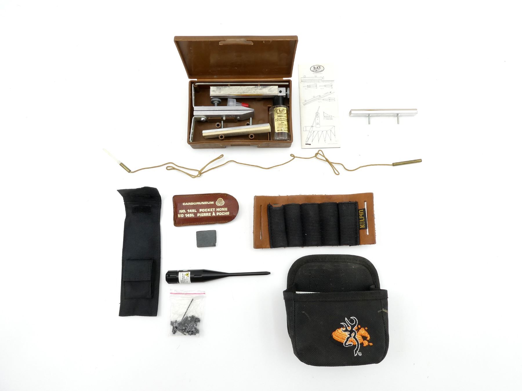 LOT INCLUDES; (1) RAY KNIFE SHARPENING KIT, VARIOUS GRIT STONES, KIT MAY NOT BE COMPLETE, (1) UNKNOWN PIECE OF A SHARPENING STONE, (1) BROWNING SHOT SHELL AMMO POUCH, (1) LASER BORE SIGHTER, ETC. SEE PHOTOS.
