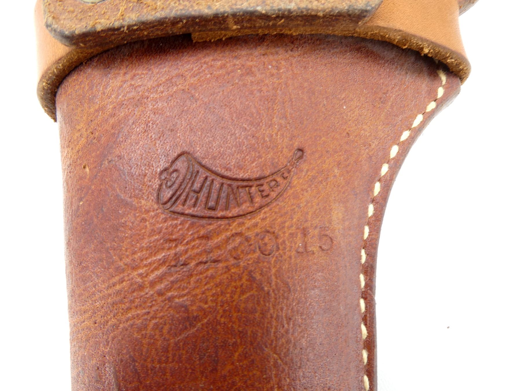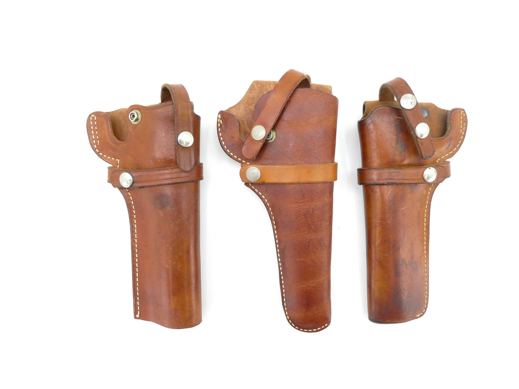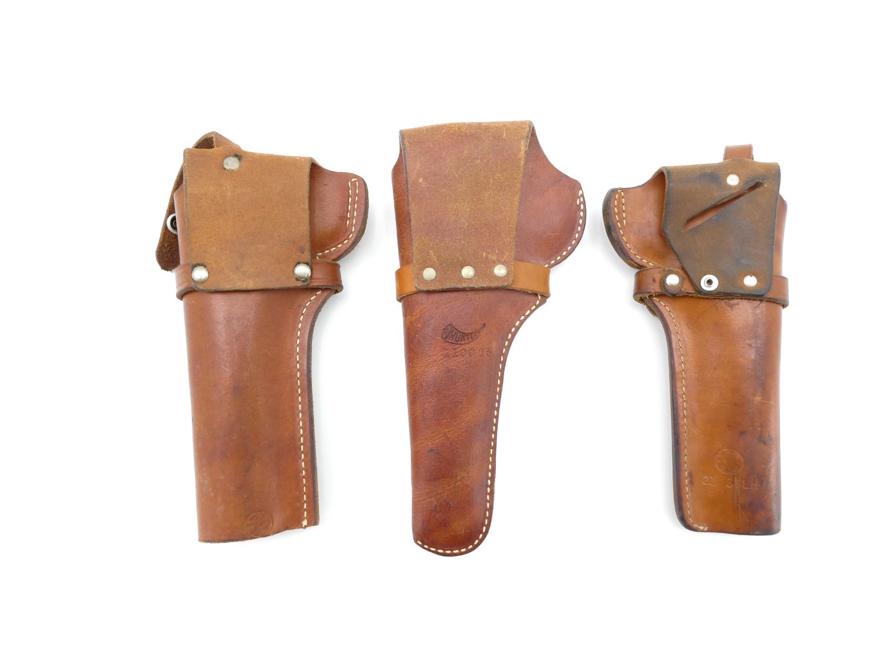 FITS LARGE FRAME REVOLVERS, LOT INCLUDES; (2) ASSORTED BROWN LEATHER RIGHT-HAND HOLSTERS, VARIOUS MARKINGS & (1) BROWN LEATHER LEFT-HAND HOLSTER, VARIOUS MARKINGS. SEE PHOTOS.