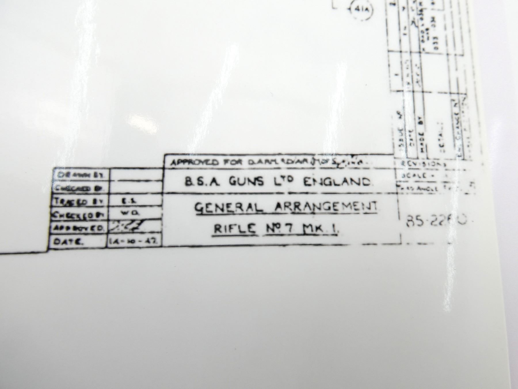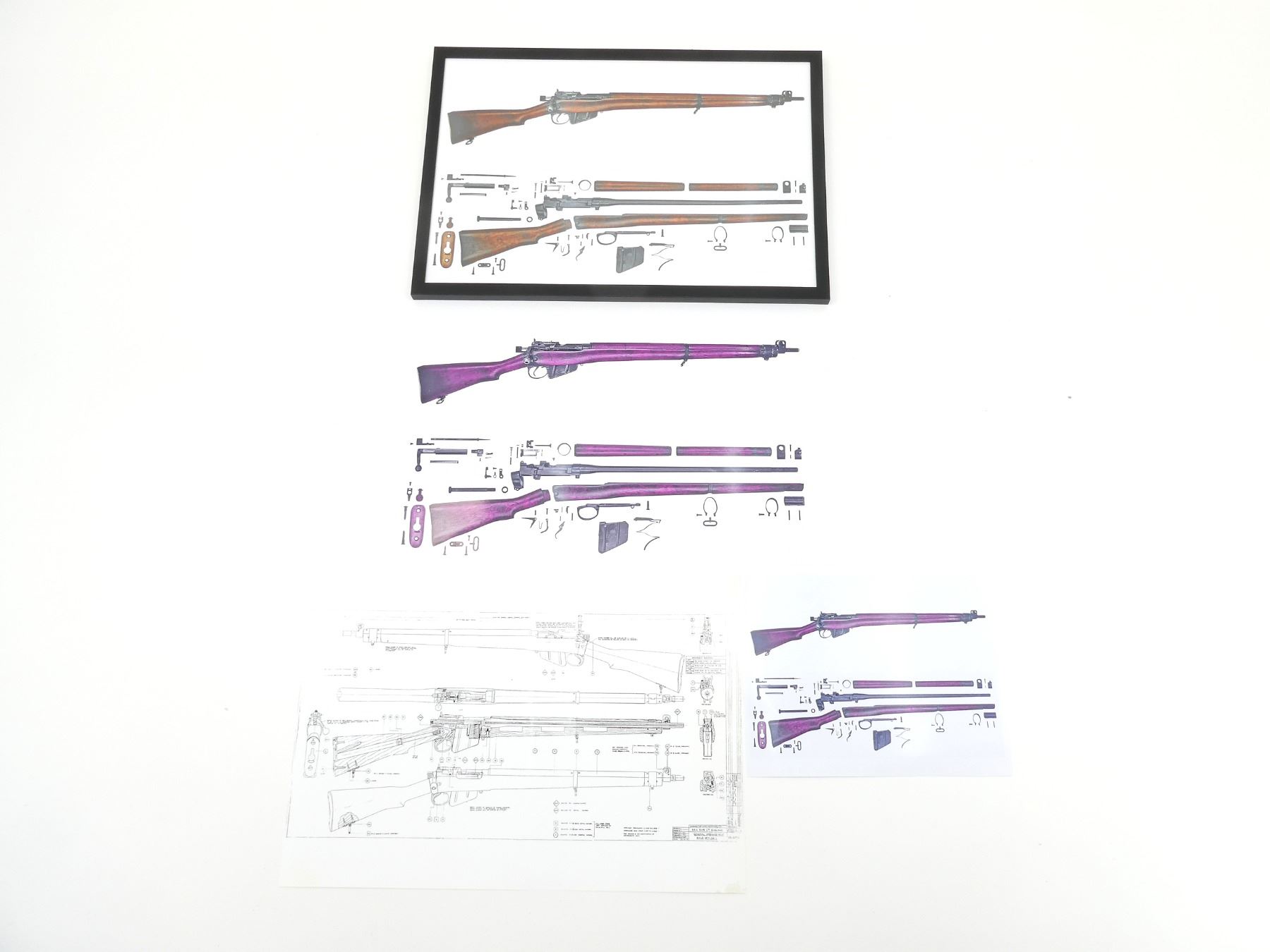 LOT INCLUDES; (1) FRAMED LEE ENFIELD POSTER, DEPICTING LEE ENFIELD PUT TOGETHER / TAKEN APART, BLACK PLASTIC FRAME, NO GLASS (PLASTIC), FRAME APPROX. 19 7/8" X 13 7/8", (1) LEE ENFIELD DRAWN DIAGRAM POSTER, LABELS PARTS, SHOWS INNER / OUTER VISUAL OF GUN, APPROX. 19" X 13" & (2) LEE ENFIELD POSTERS, DEPICTING LEE ENFIELD PUT TOGETHER / TAKEN APART, APPROX. 19" X 13" & 11" X 8.5"
