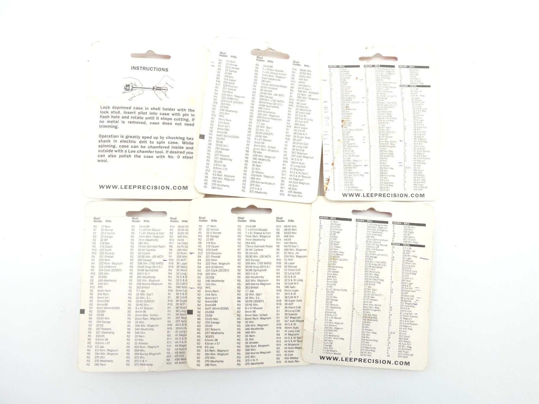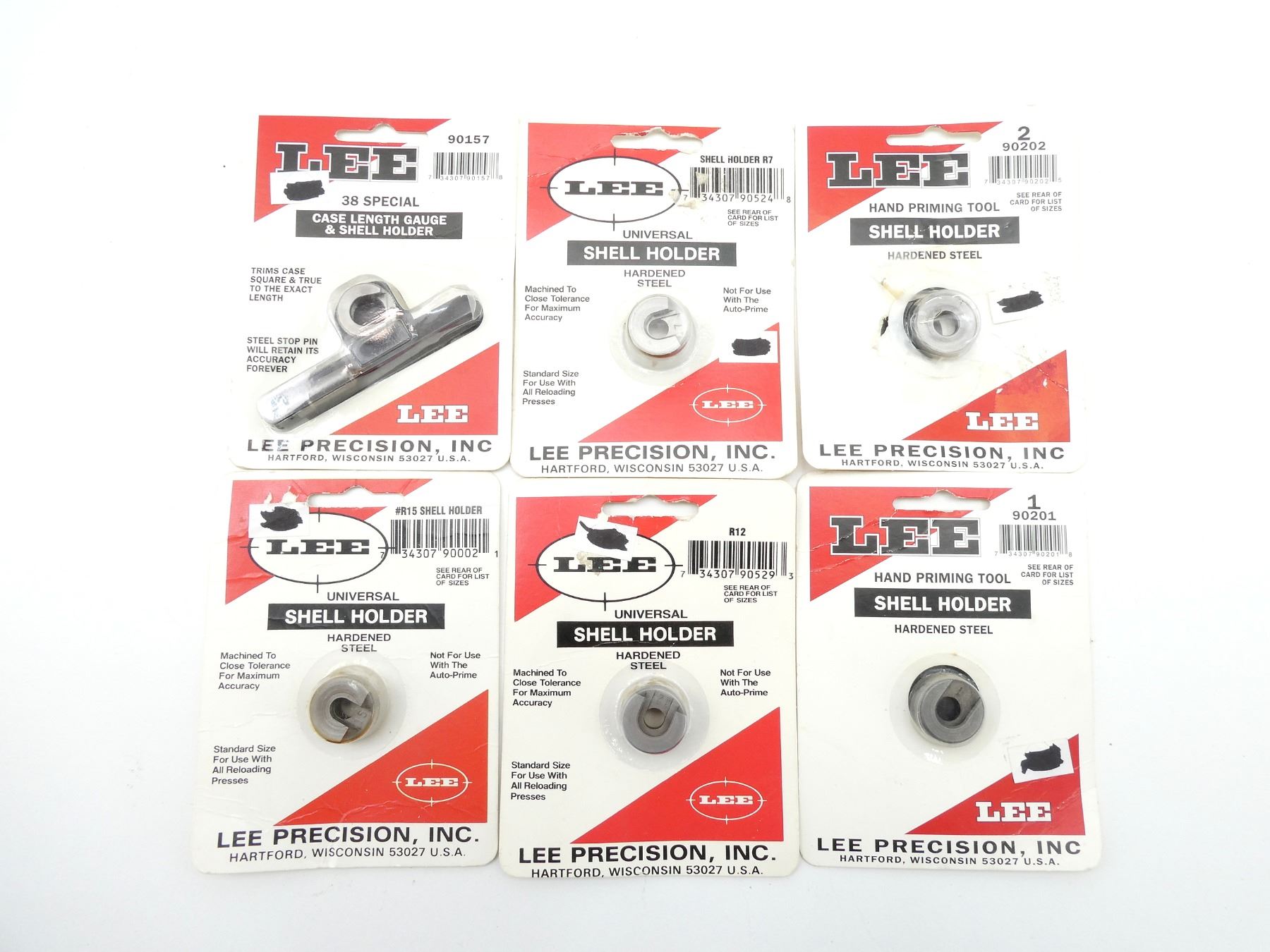 LOT INCLUDES; (5) SHELL HOLDERS, #1, #2, #R7, #R12, #R15, FOUR ARE NEW OLD STOCK, ONE HAS OPENED PACKAGING & (1) .38 SPL CASE LENGTH GAUGE WITH #1 SHELL HOLDER, NEW OLD STOCK. SEE PHOTOS.