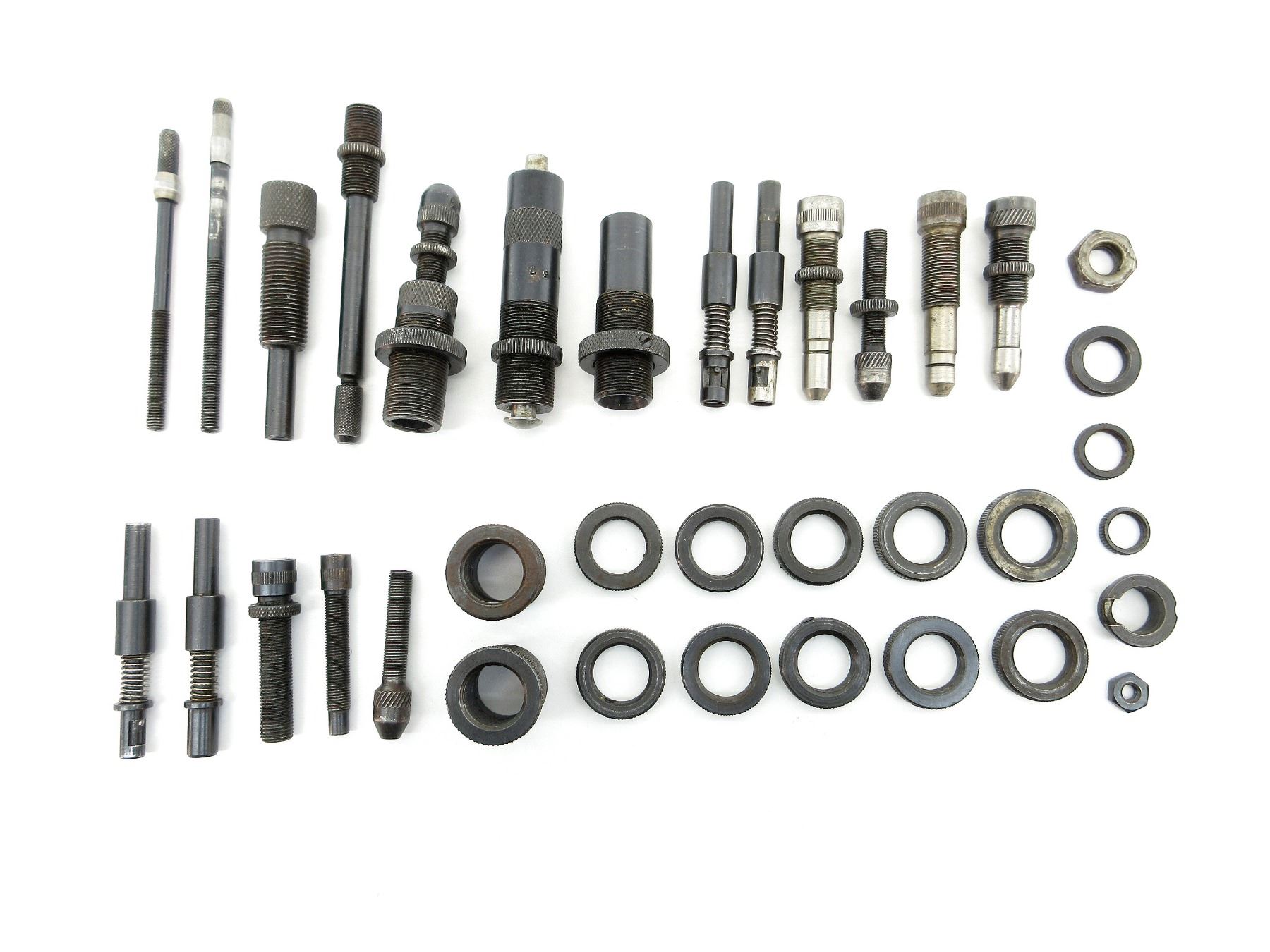 APPROX. (36) PIECES, INCLUDES; VARIOUS SIZED LOCKING RINGS, .310 DIE ADAPTERS 7/8 X 14, EXPANDING PLUGS, BULLET SEATING SCREWS, PRIMER RODS, RELOADING DIES, DECAPPING RODS, #2 SHELL HOLDER, SOME PIECES MARKED: "223", "450", "311", "366", "123", "283", "86 OR 98", "308", ".257" & "231, 263". SEE PHOTOS.
