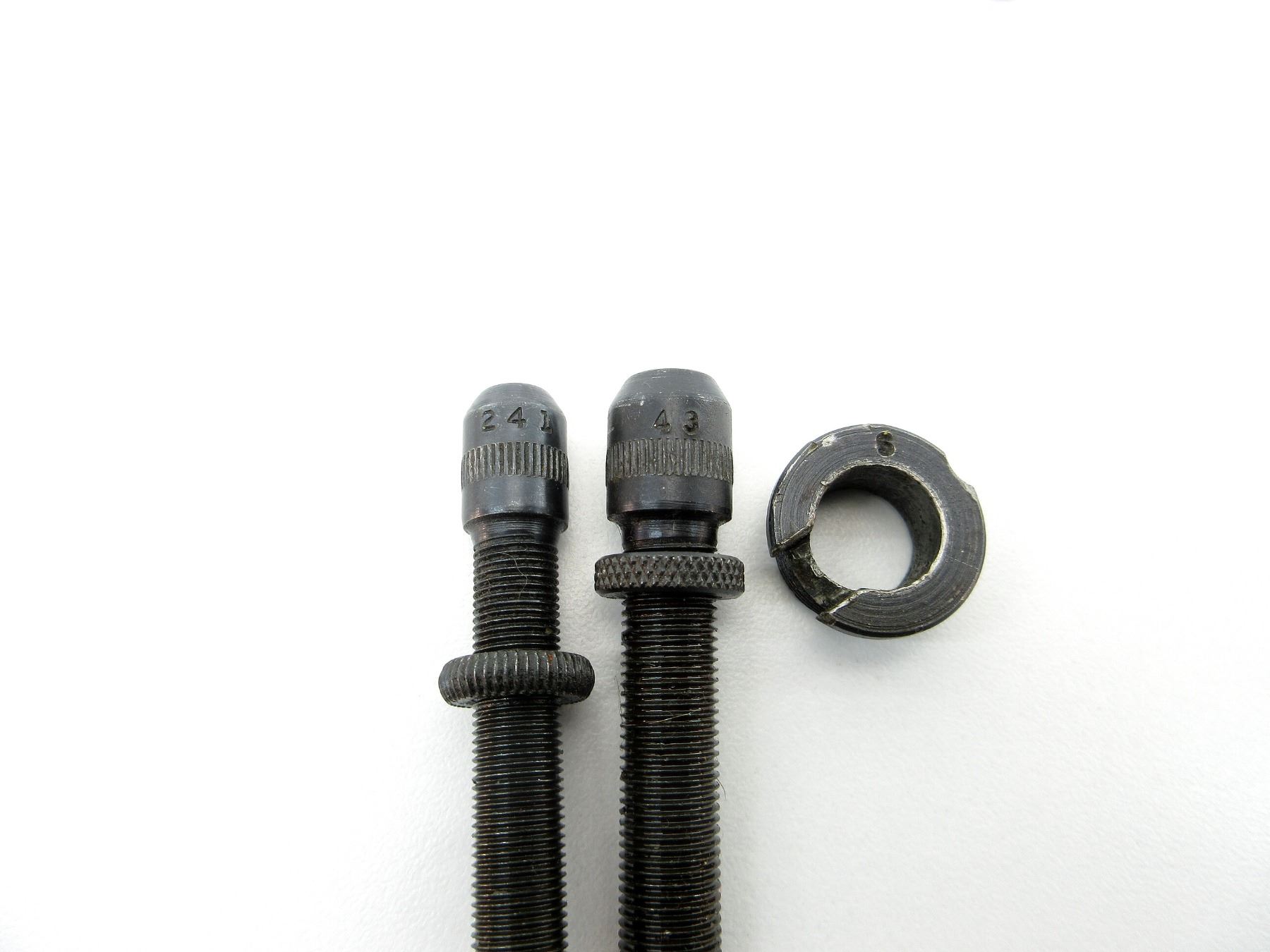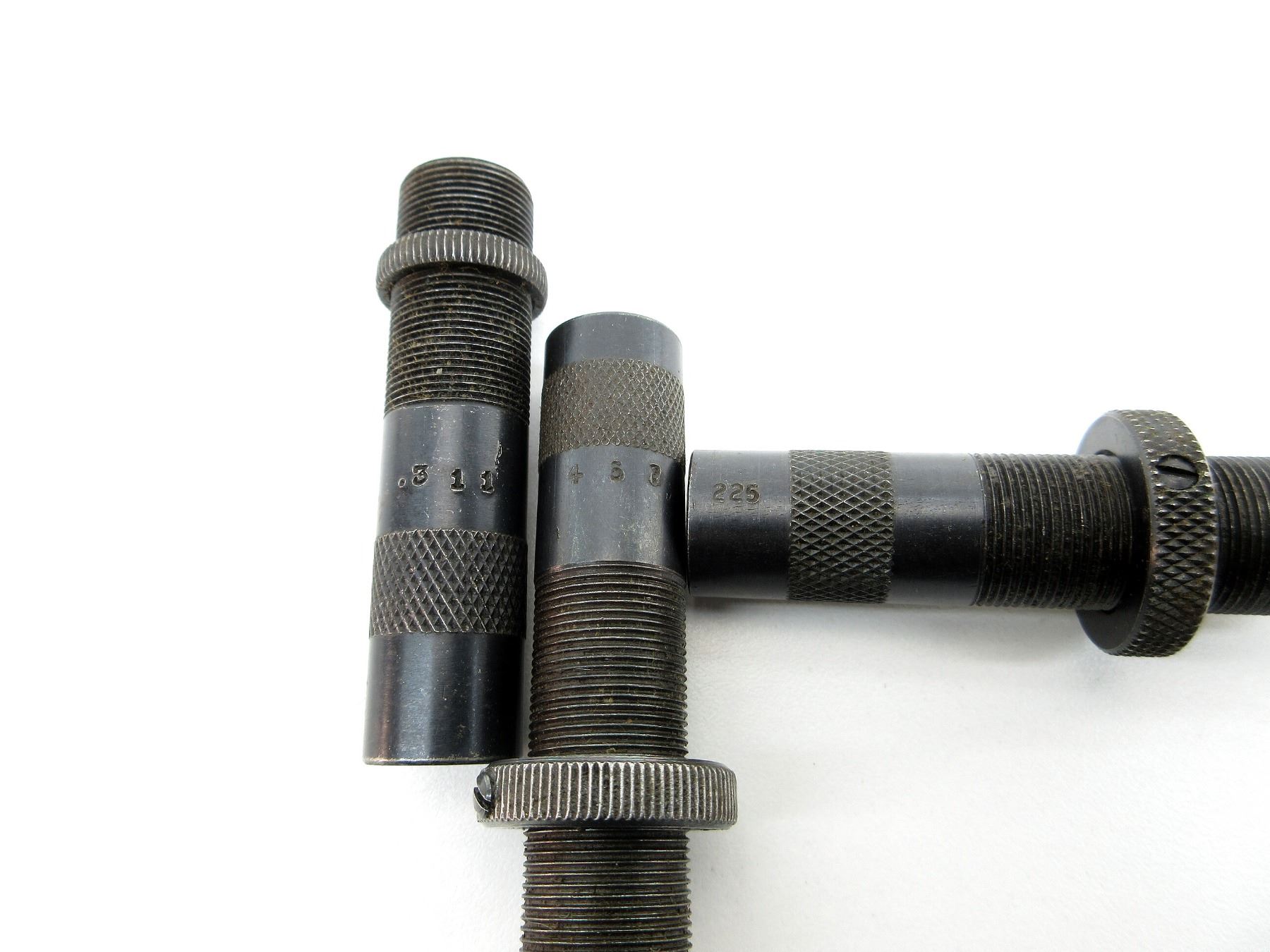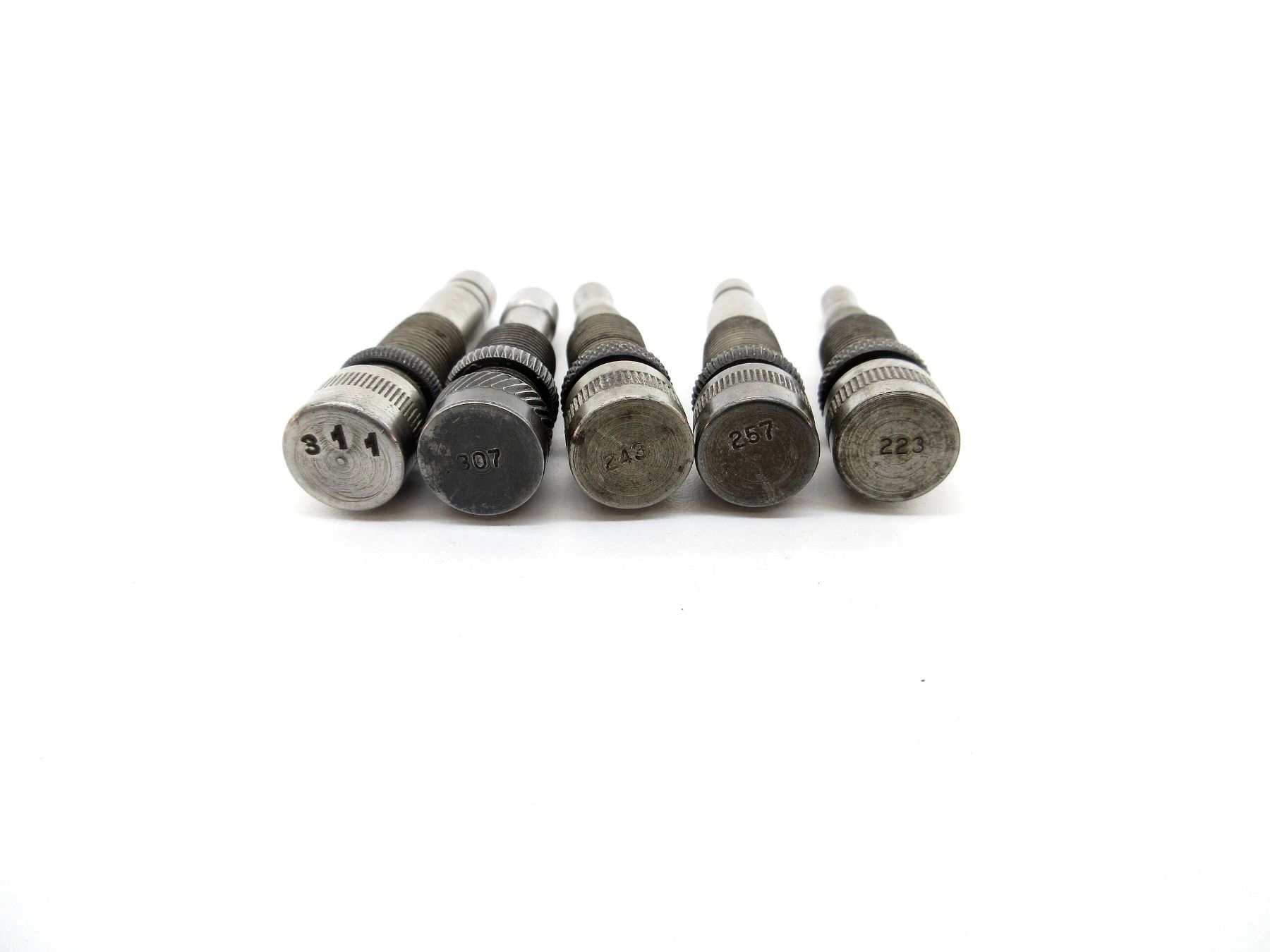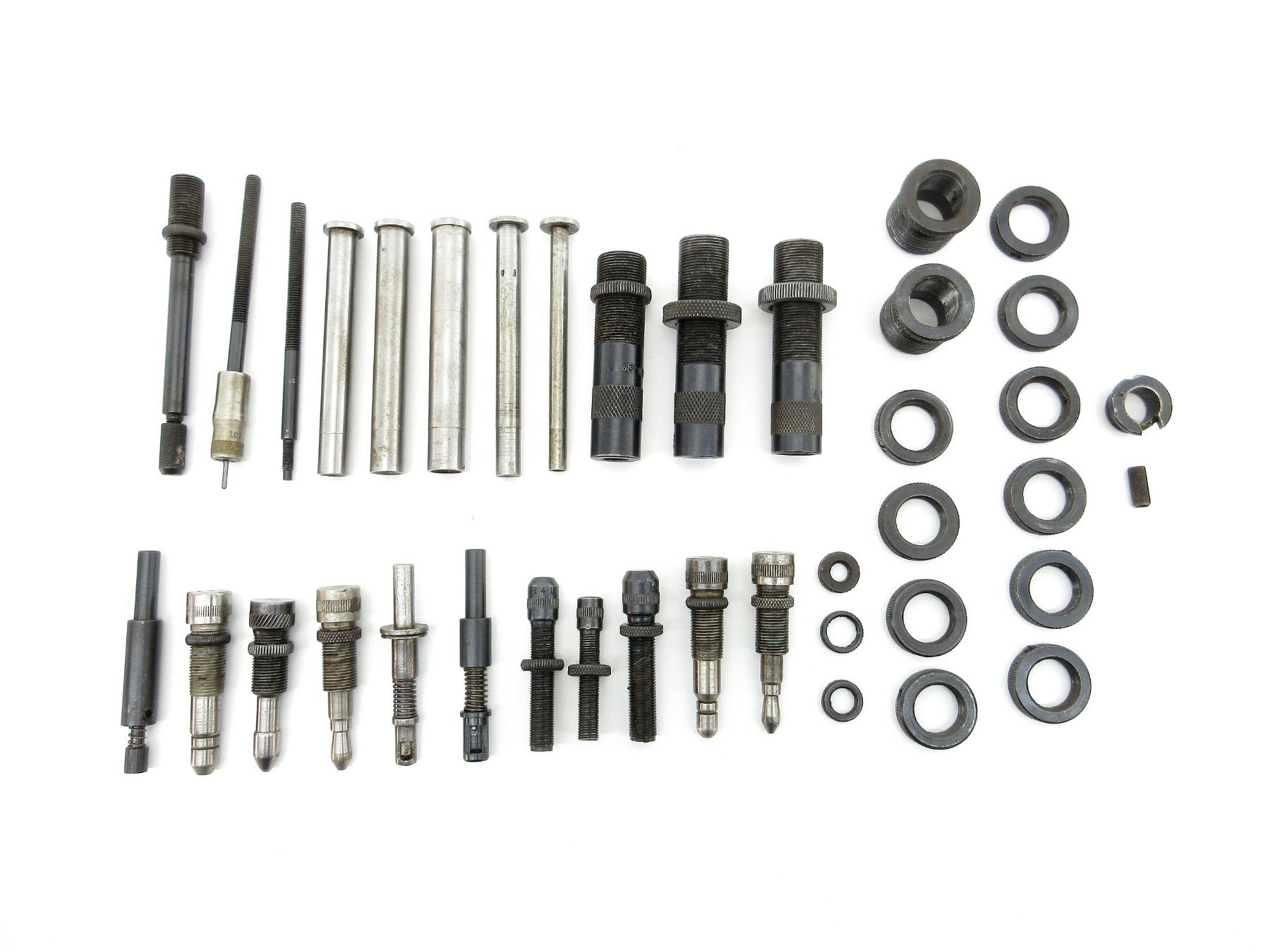 APPROX. (36) PIECES, INCLUDES; VARIOUS SIZED LOCKING RINGS, .310 DIE ADAPTERS 7/8 X 14, EXPANDING PLUGS, BULLET SEATING SCREWS, PRIMER RODS, RELOADING DIES, DECAPPING RODS, #6 OR #9 SHELL HOLDER, SOME PIECES MARKED: "430", "450", "311", "413", "307", "43", "401", "438", "225", "257", "243", "223", "241", "43", "457" & "124". SEE PHOTOS.