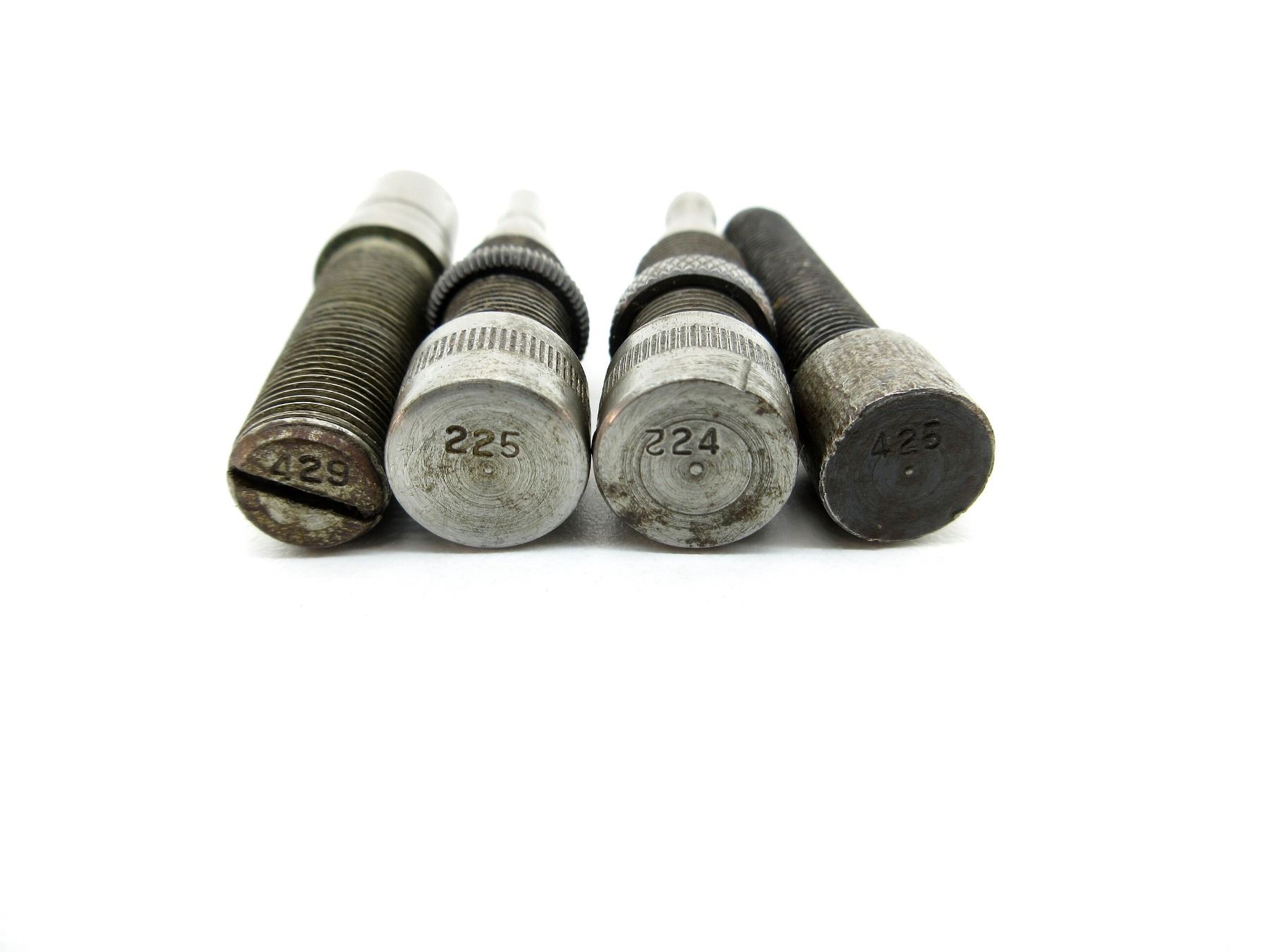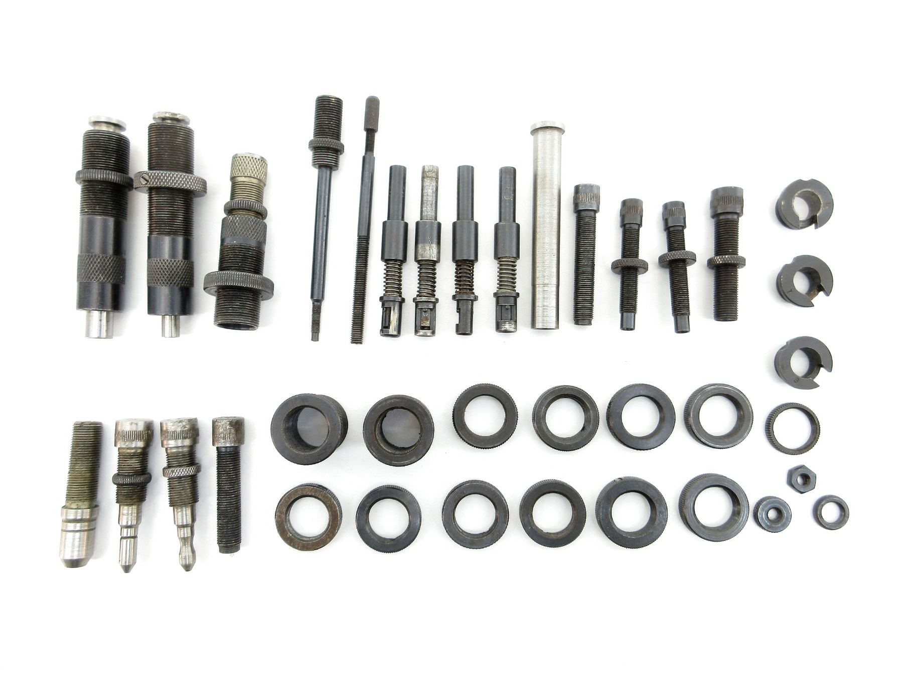 APPROX. (37) PIECES, INCLUDES; VARIOUS SIZED LOCKING RINGS, .310 DIE ADAPTERS 7/8 X 14, EXPANDING PLUGS, BULLET SEATING SCREWS, PRIMER RODS, RELOADING DIES, DECAPPING RODS, #1 SHELL HOLDER, #1 SHELL HOLDER, #6 OR #9 SHELL HOLDER, SOME PIECES MARKED: "88", "429", "450", "413", "358", ".356", "498", "225", "425", "224" & "244". SEE PHOTOS.