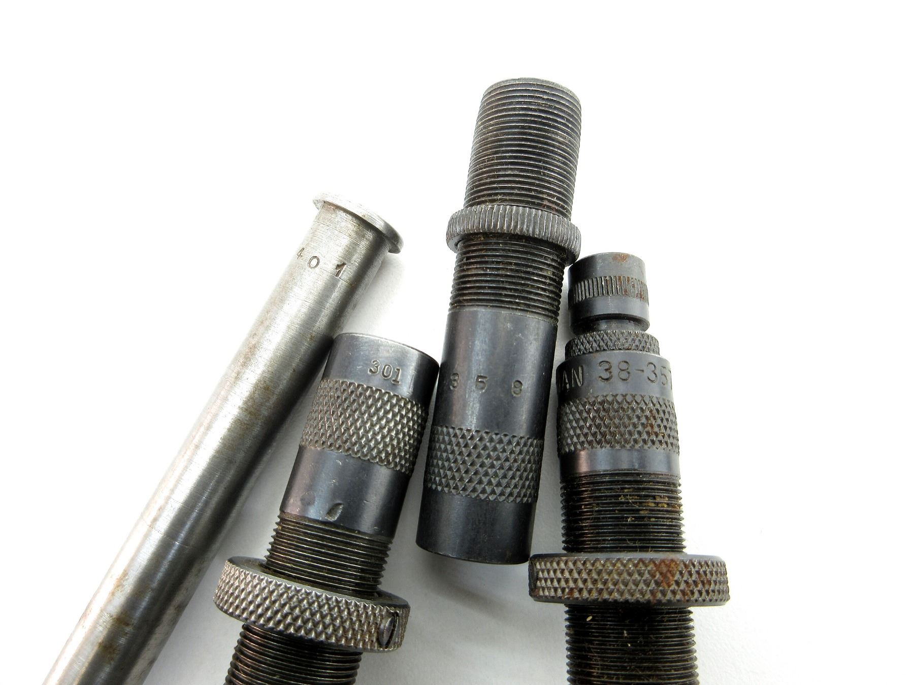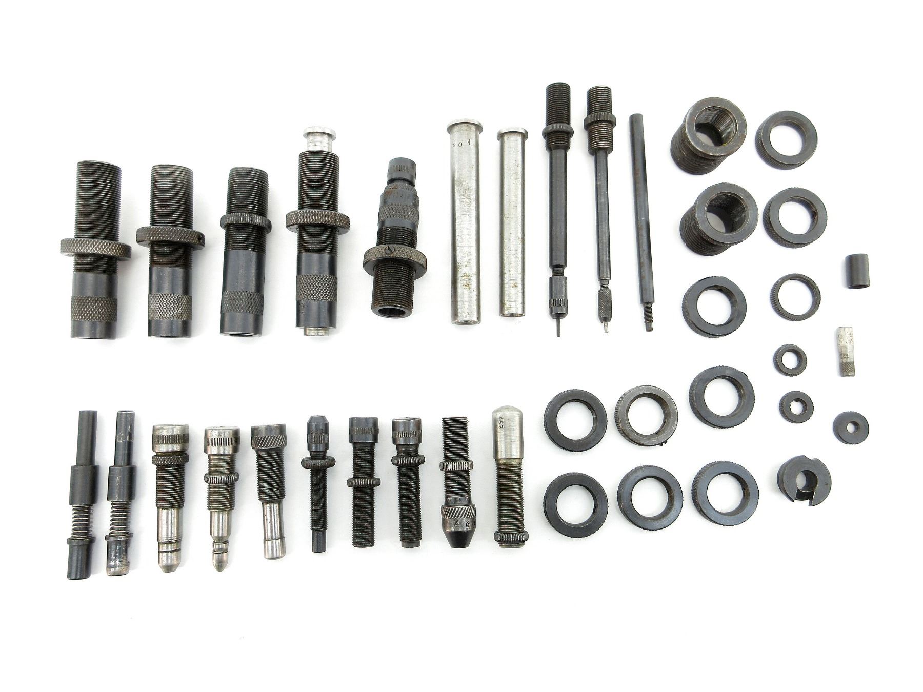 APPROX. (37) PIECES, INCLUDES; VARIOUS SIZED LOCKING RINGS, .310 DIE ADAPTERS 7/8 X 14, EXPANDING PLUGS, BULLET SEATING SCREWS, PRIMER RODS, RELOADING DIES, DECAPPING RODS, #4 SHELL HOLDER, SOME PIECES MARKED: "223", "383", ".313", "224", "401", "429", "311", "457", "429", "LYMAN 38-357 DA", "301", "358", "88", "178" & "386". SEE PHOTOS.