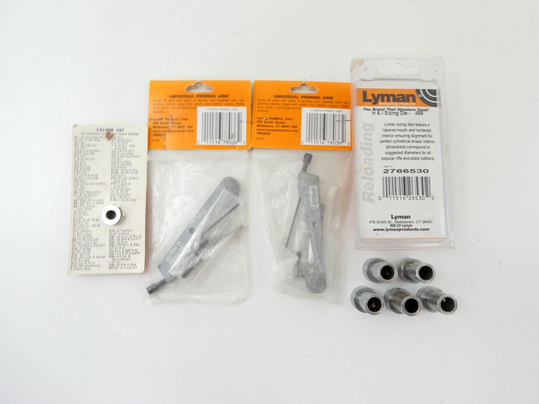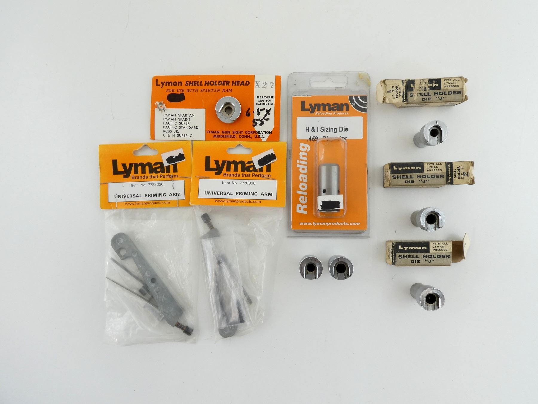 LOT INCLUDES; (2) UNIVERSAL PRIMING ARM KITS, APPEARS NEW OLD STOCK, (1) H & I SIZING DIE, .459" DIA, APPEARS NEW OLD STOCK & (6) SHELL HOLDERS, #1, #2, #6, #7, #12, #X27, SOME WITH ORIGINAL PACKAGING. SEE PHOTOS.