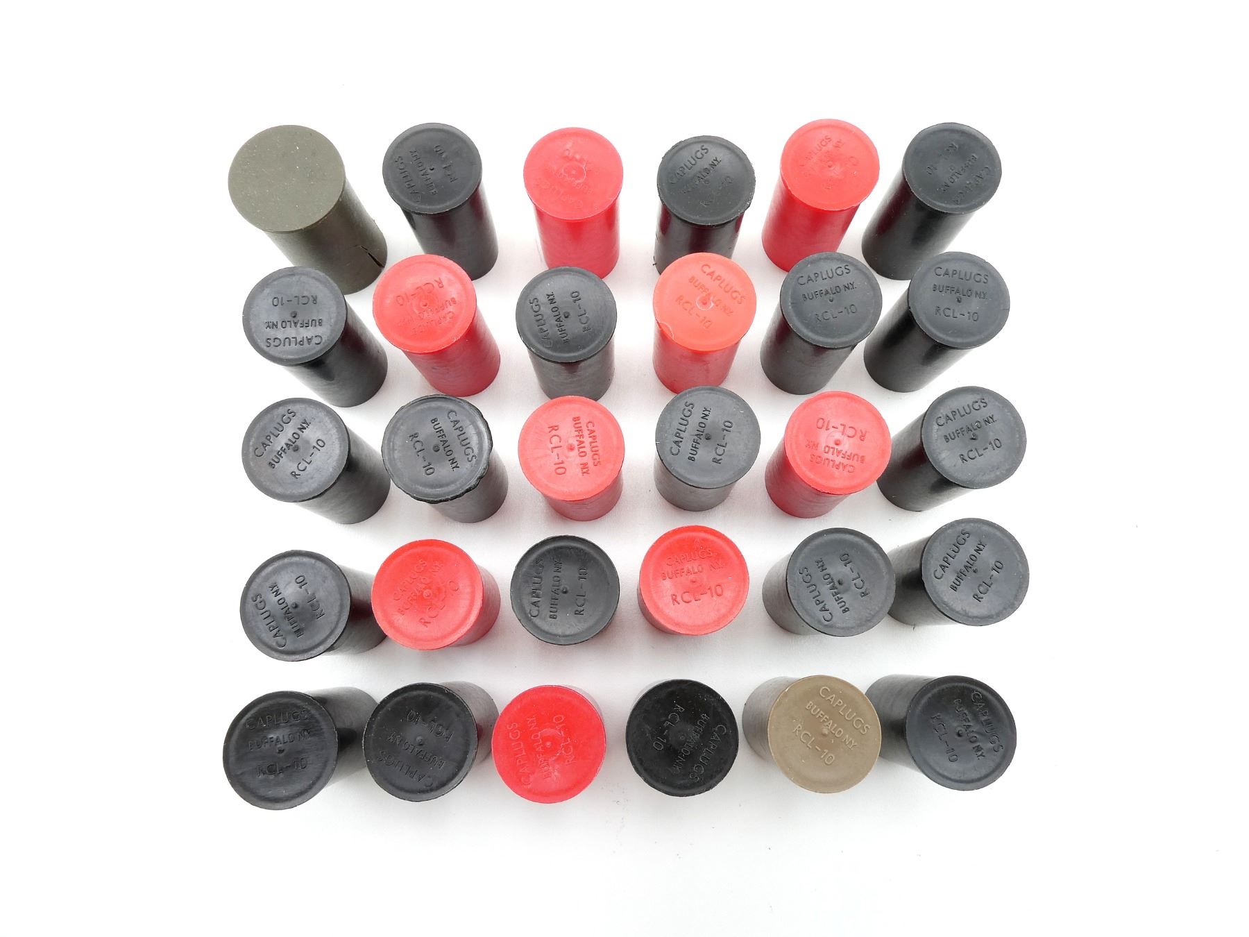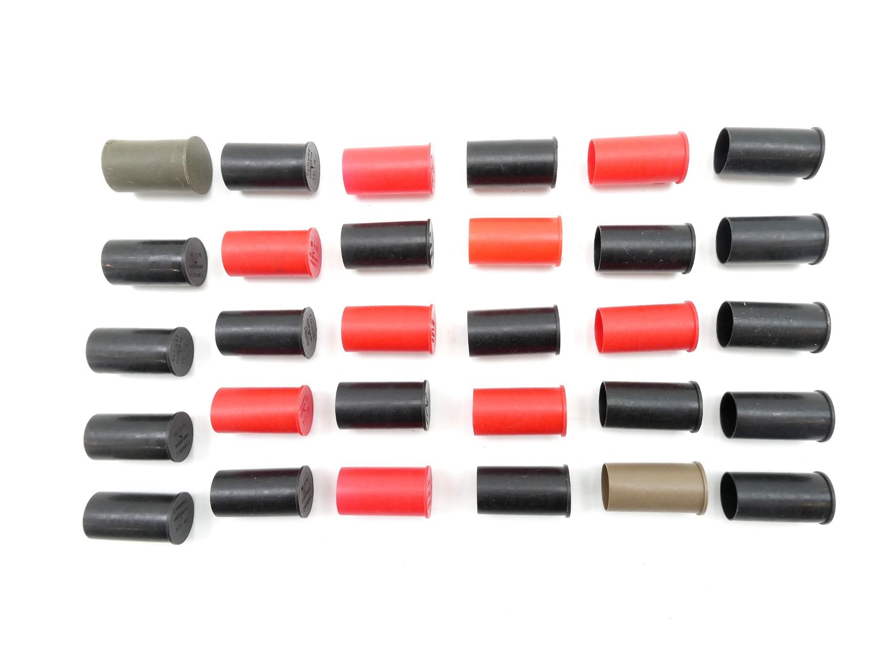 LOT INCLUDES; APPROX. (30) RED / BLACK / TAN M4 / AR15 PLASTIC MUZZLE COVERS, VARIOUS MARKINGS, OVERALL LENGTH APPROX. 1.75". SEE PHOTOS.