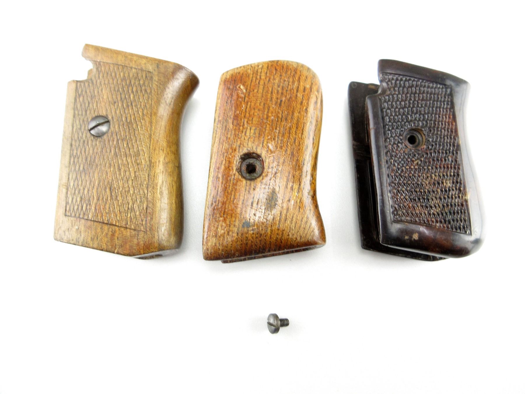 LOT INCLUDES; (1) SET OF 1910 / 1914 WOOD MONO GRIP, WITH SCREW & (2) SETS OF 1914 WOOD MONO GRIPS, ONE SMOOTH / ONE CHECKERED, ONE WITH SCREW. MAY REQUIRE FITTING. SEE PHOTOS.