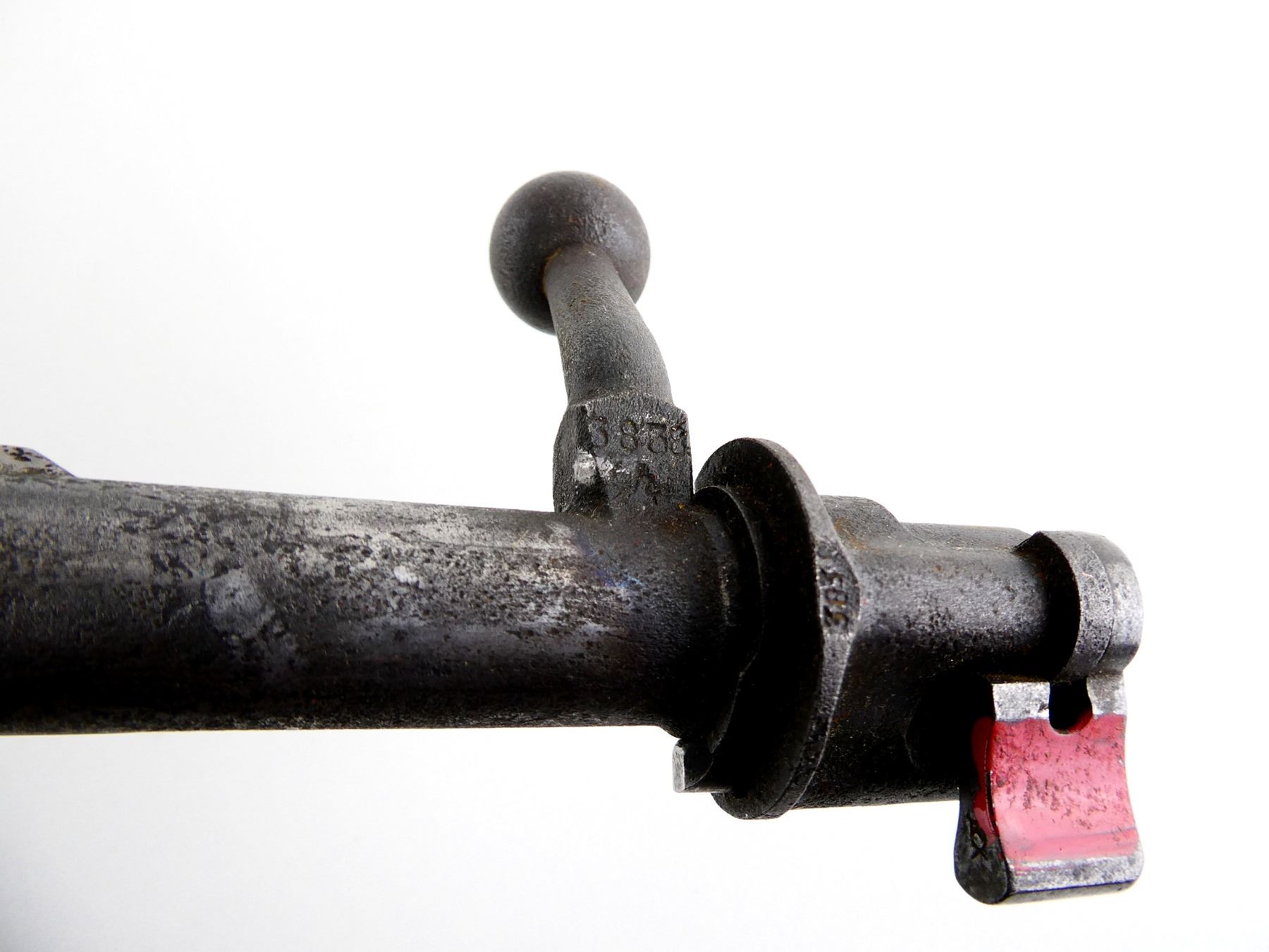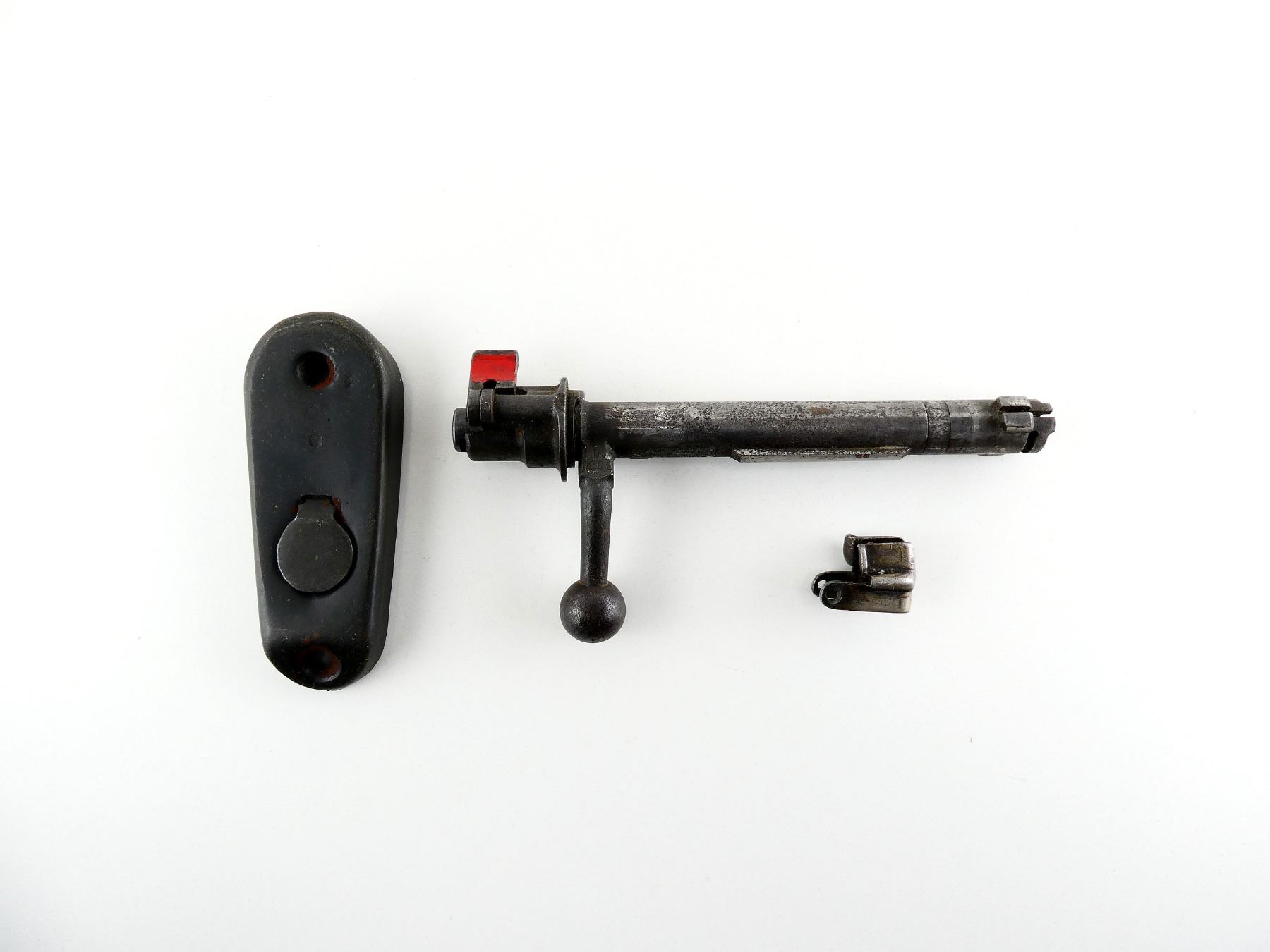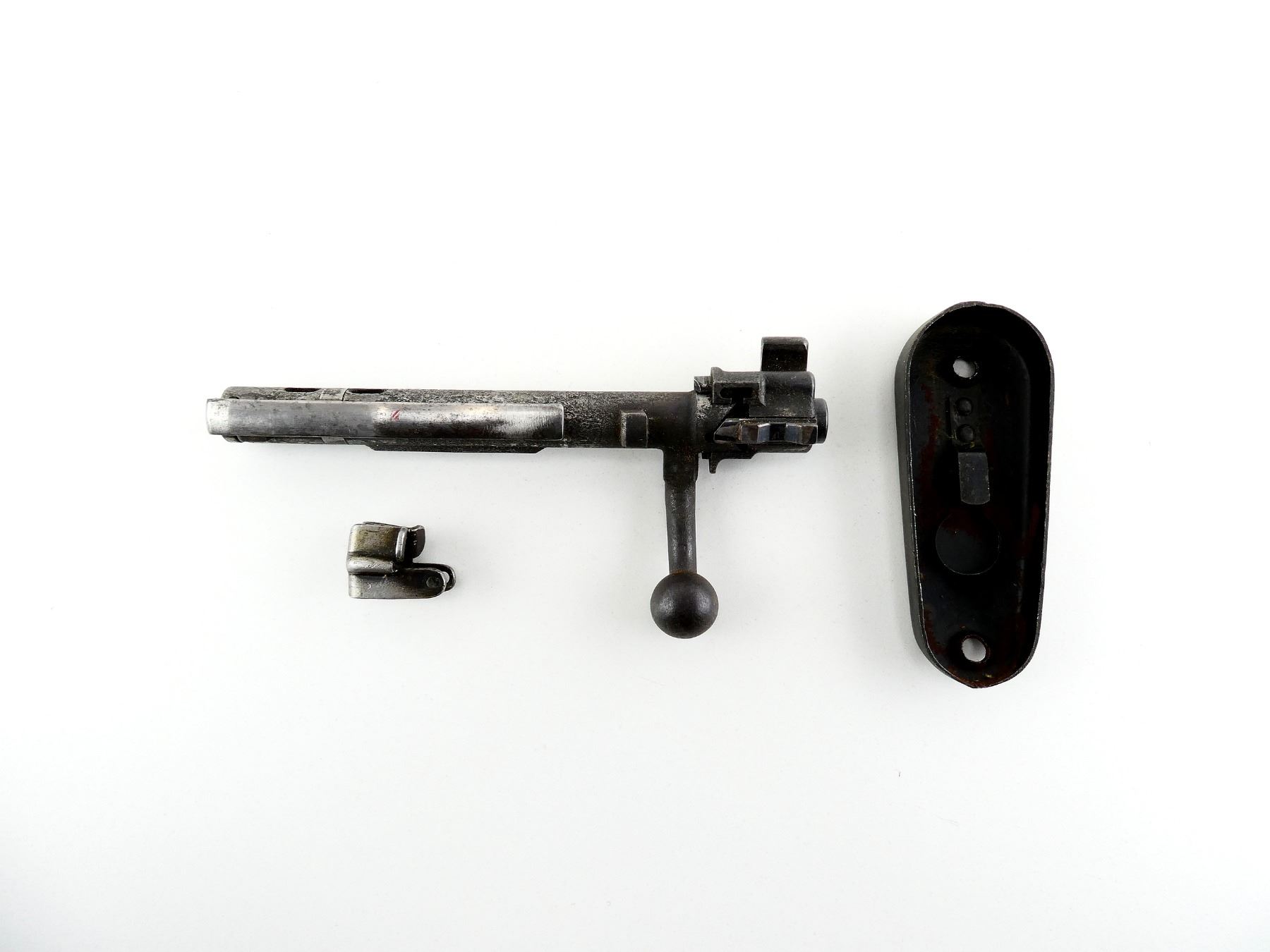 LOT INCLUDES; (1) BOLT, APPEARS COMPLETE, IN THE WHITE STEEL CONSTRUCTION, VARIOUS MARKINGS, (1) BUTT PLATE WITH TRAP, (1) SIGHT COVER, MISSING SCREW, ETC. MAY REQUIRE FITTING. SEE PHOTOS.