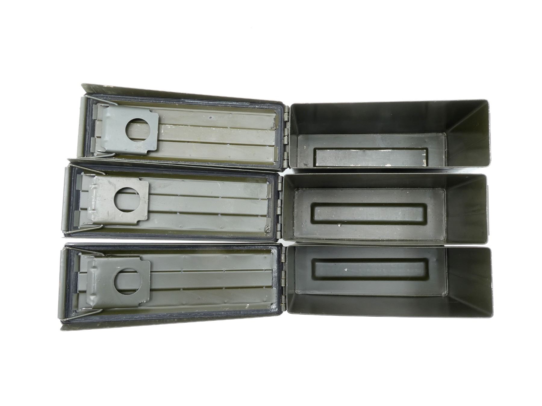 LOT INCLUDES; (3) GREEN PAINTED METAL AMMO TINS, VARIOUS MARKINGS, APPROX. 11" X 3.75" X 7". SEE PHOTOS.