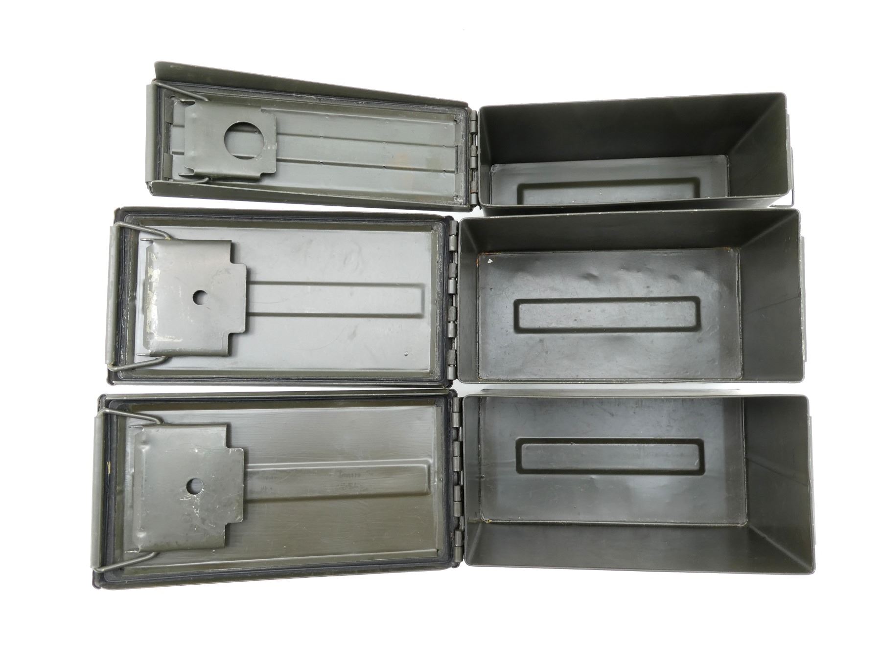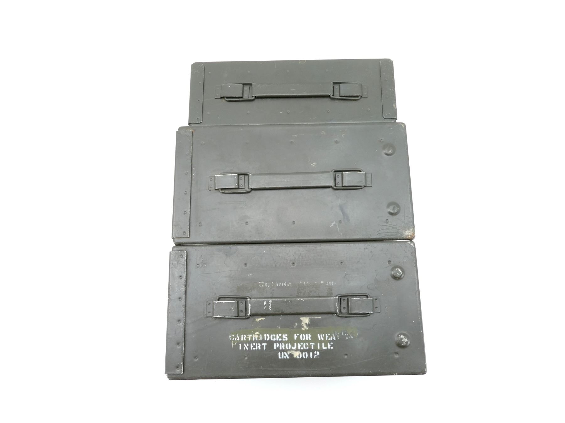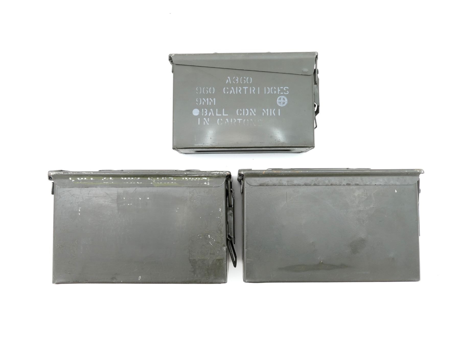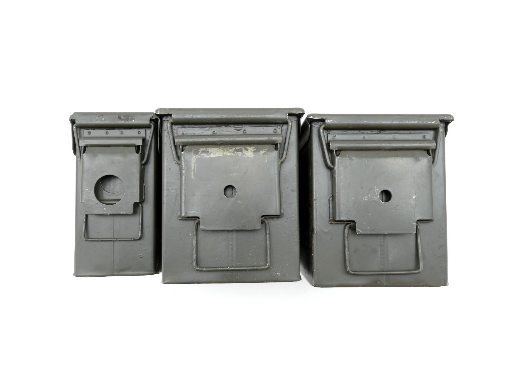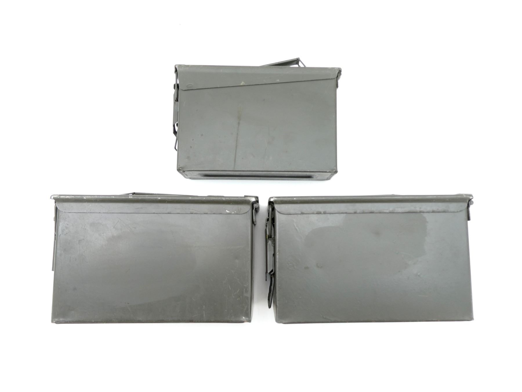 LOT INCLUDES; (2) GREEN PAINTED METAL AMMO TINS, VARIOUS MARKINGS, APPROX. 12" X 6" X 7.25" & (1) GREEN PAINTED METAL AMMO TIN, VARIOUS MARKINGS, APPROX. 11" X 3.75" X 7". SEE PHOTOS.