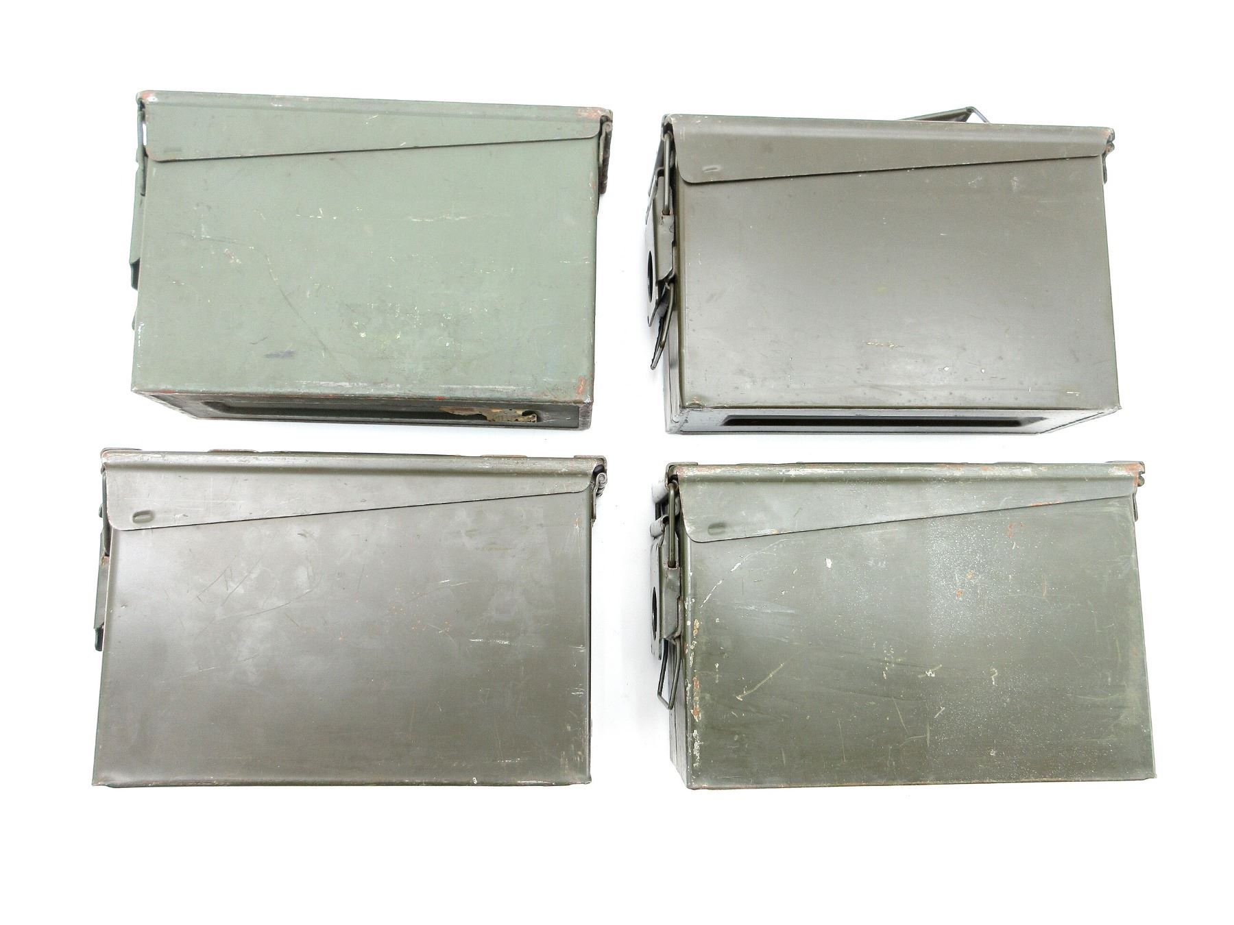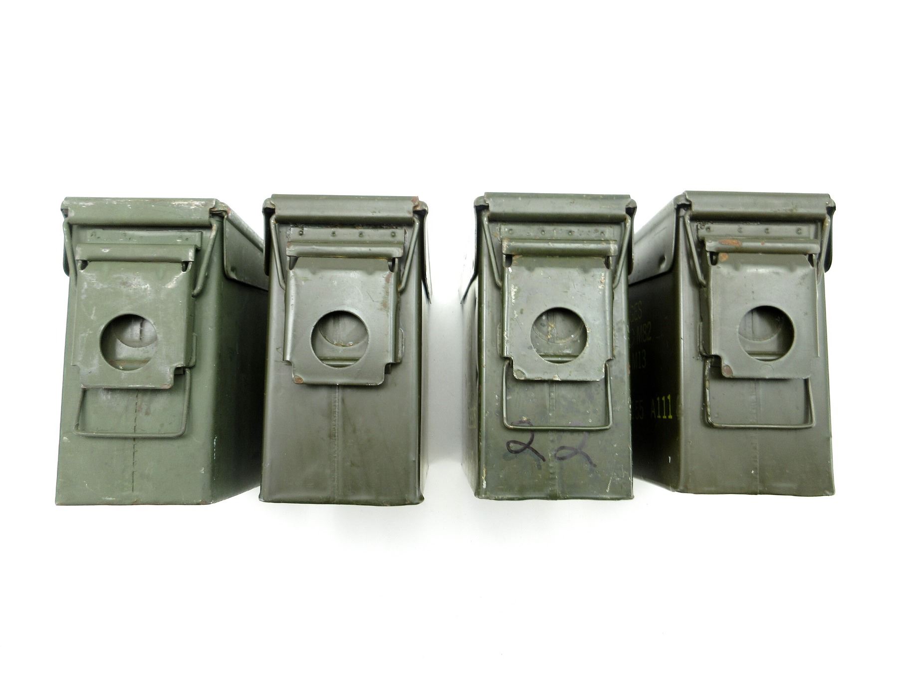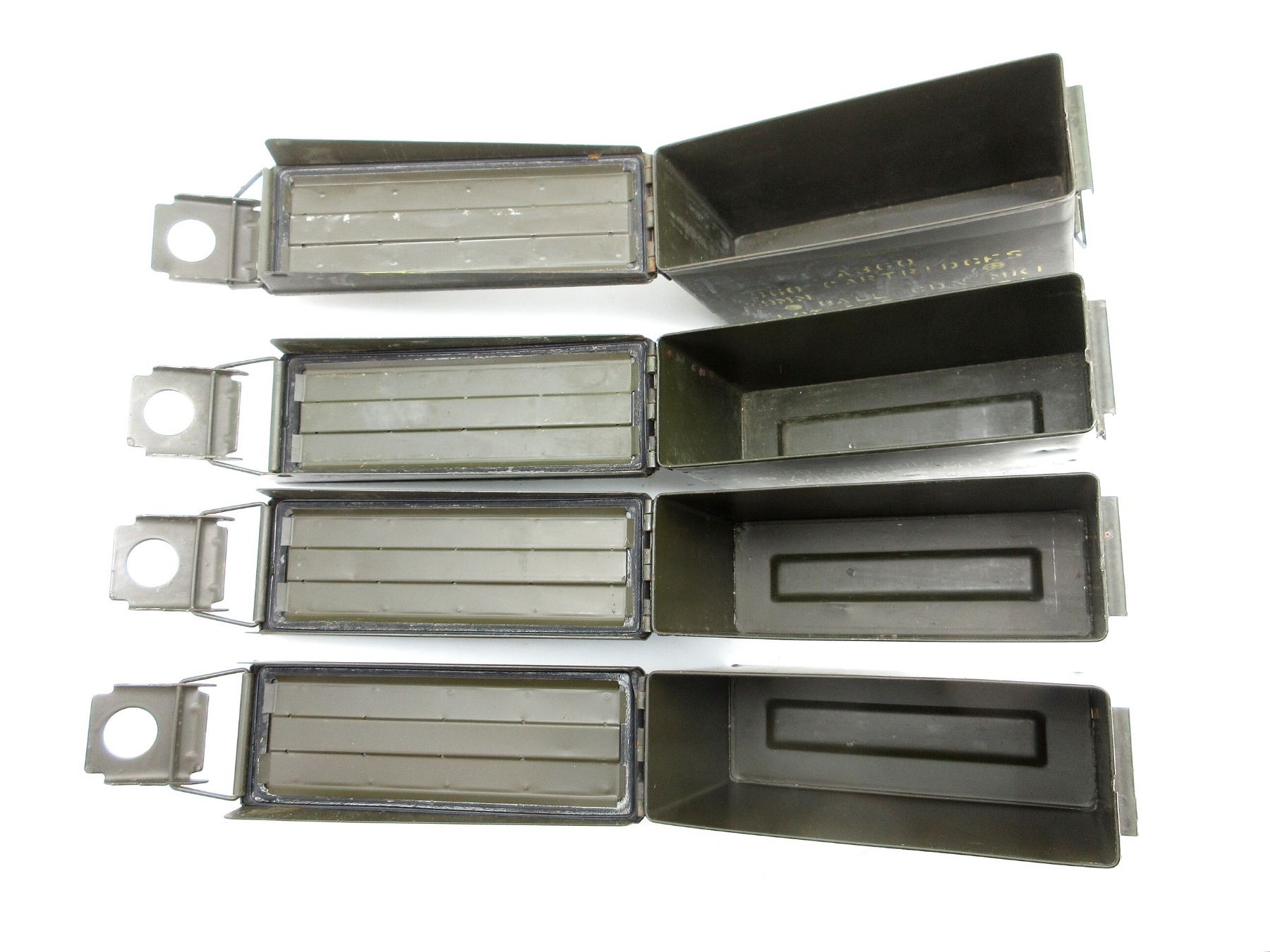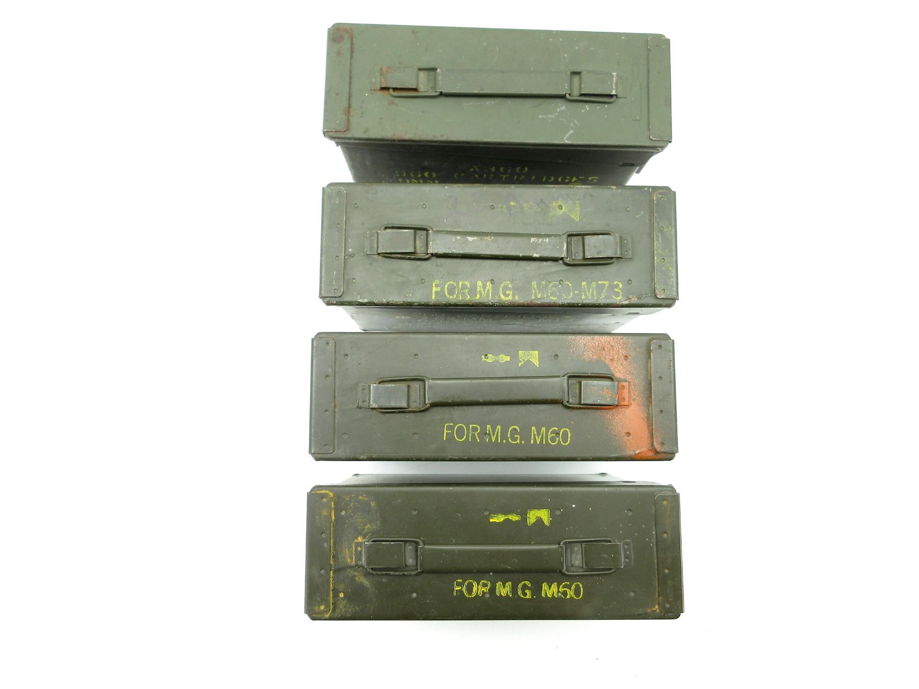 LOT INCLUDES; (4) GREEN PAINTED METAL AMMO TINS, VARIOUS MARKINGS, APPROX. 11" X 3.75" X 7". SEE PHOTOS.