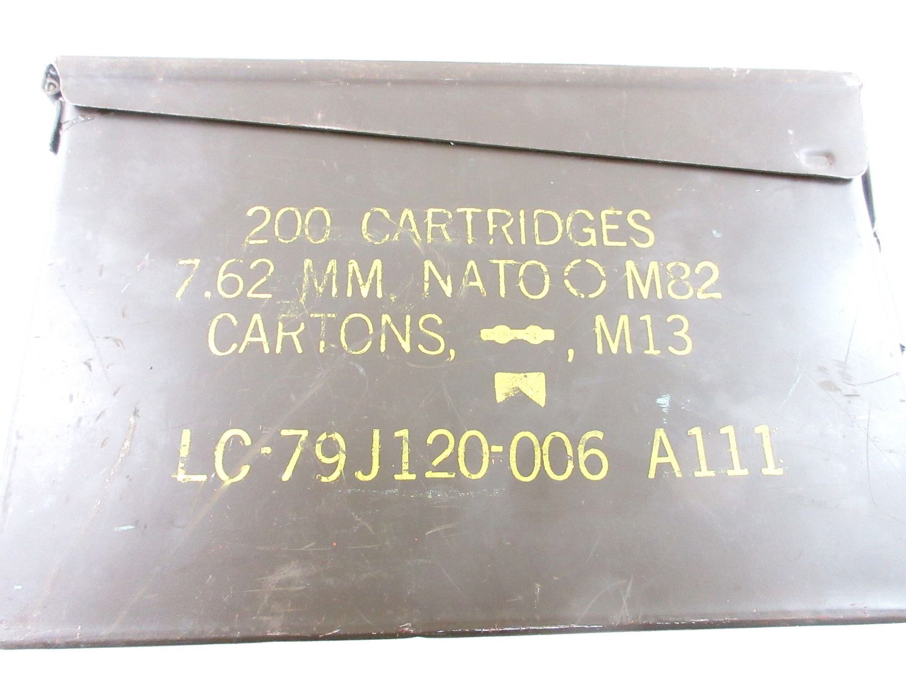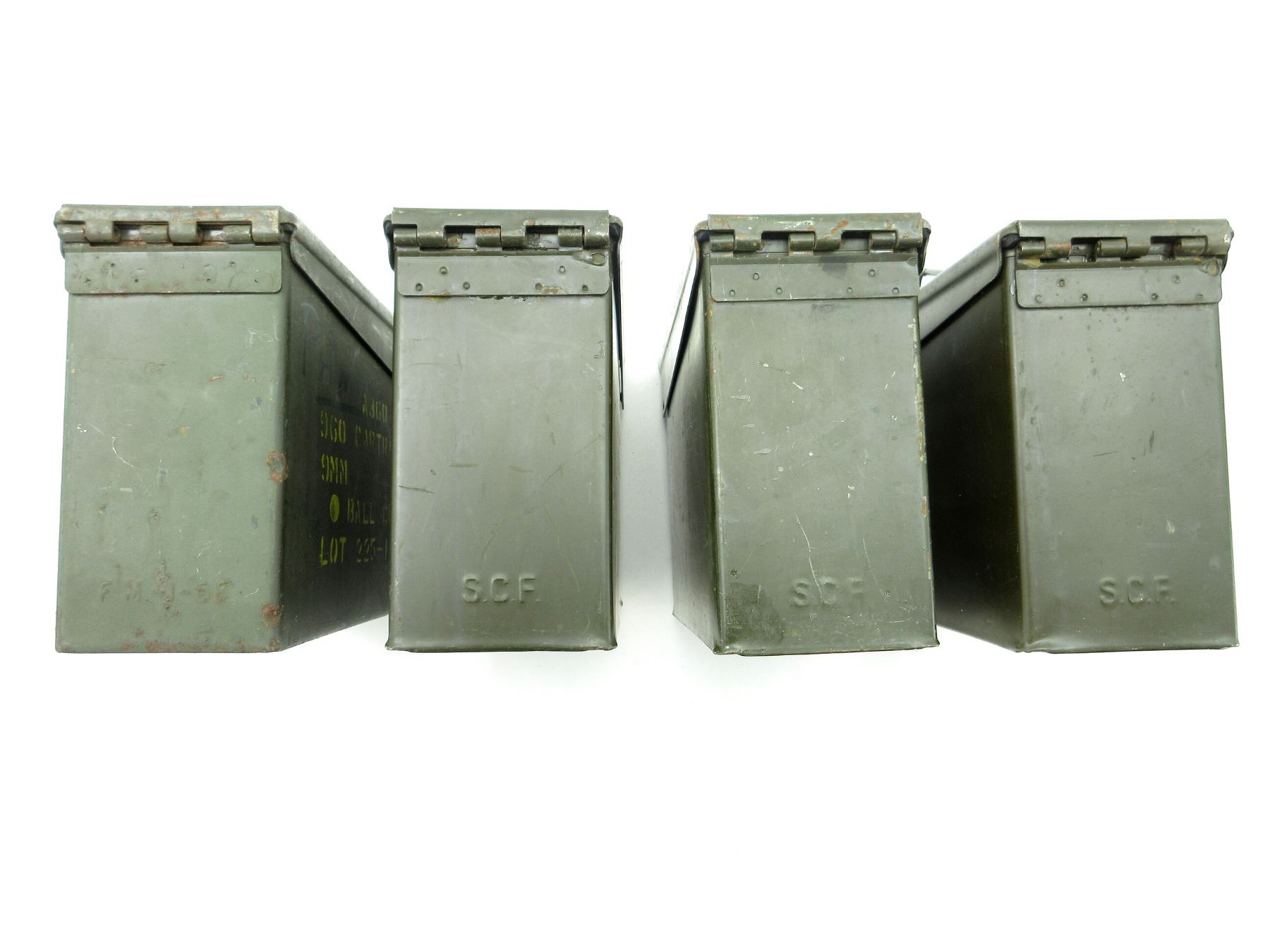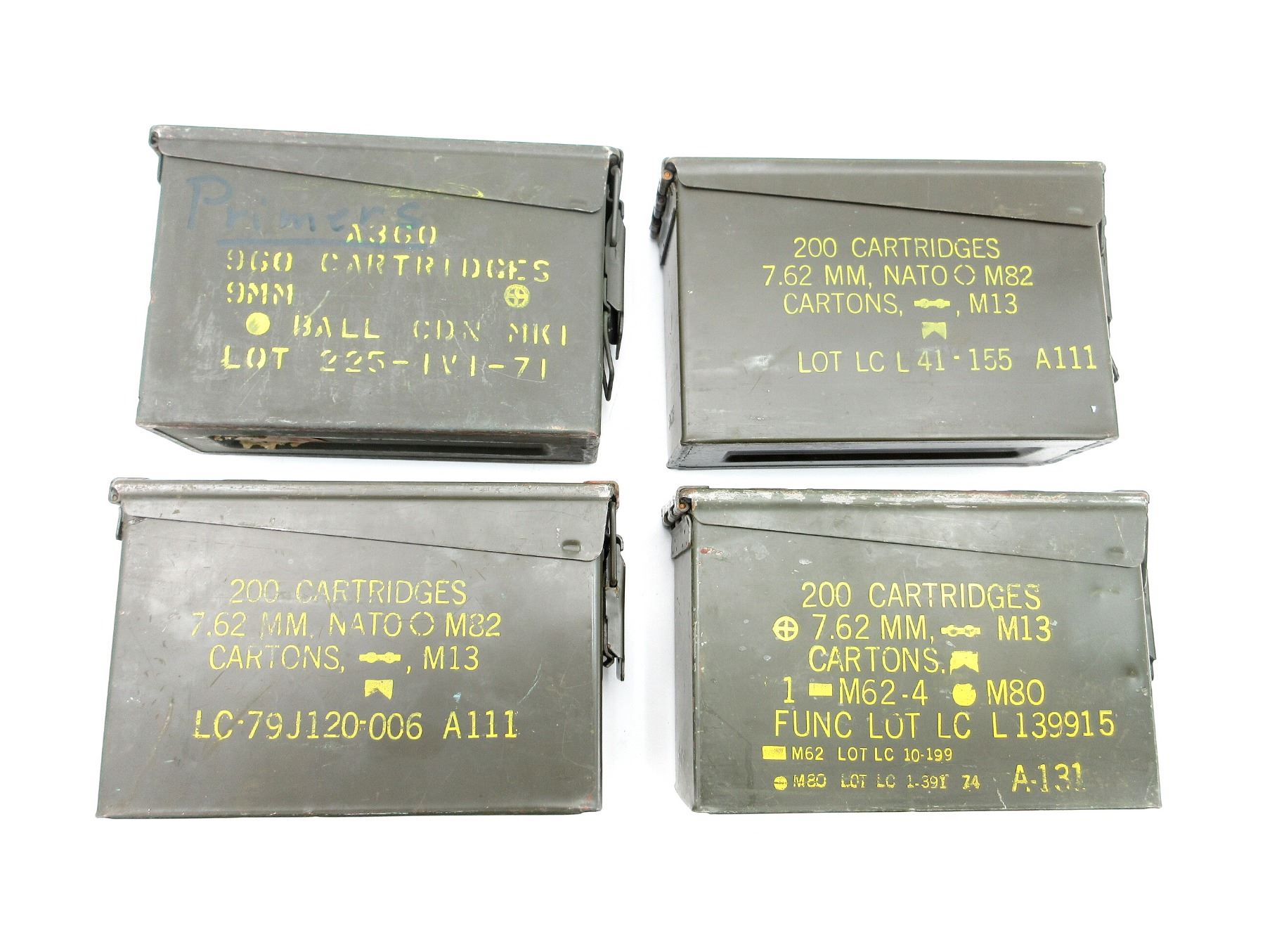 LOT INCLUDES; (4) GREEN PAINTED METAL AMMO TINS, VARIOUS MARKINGS, APPROX. 11" X 3.75" X 7". SEE PHOTOS.