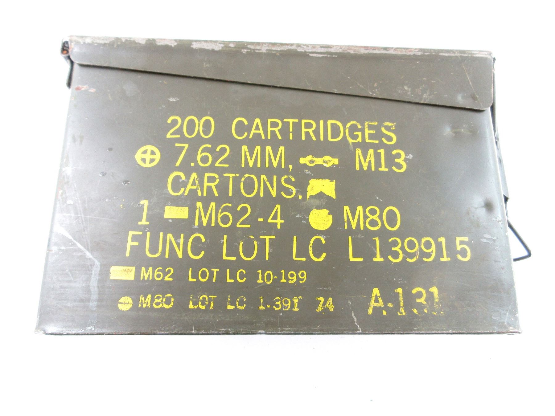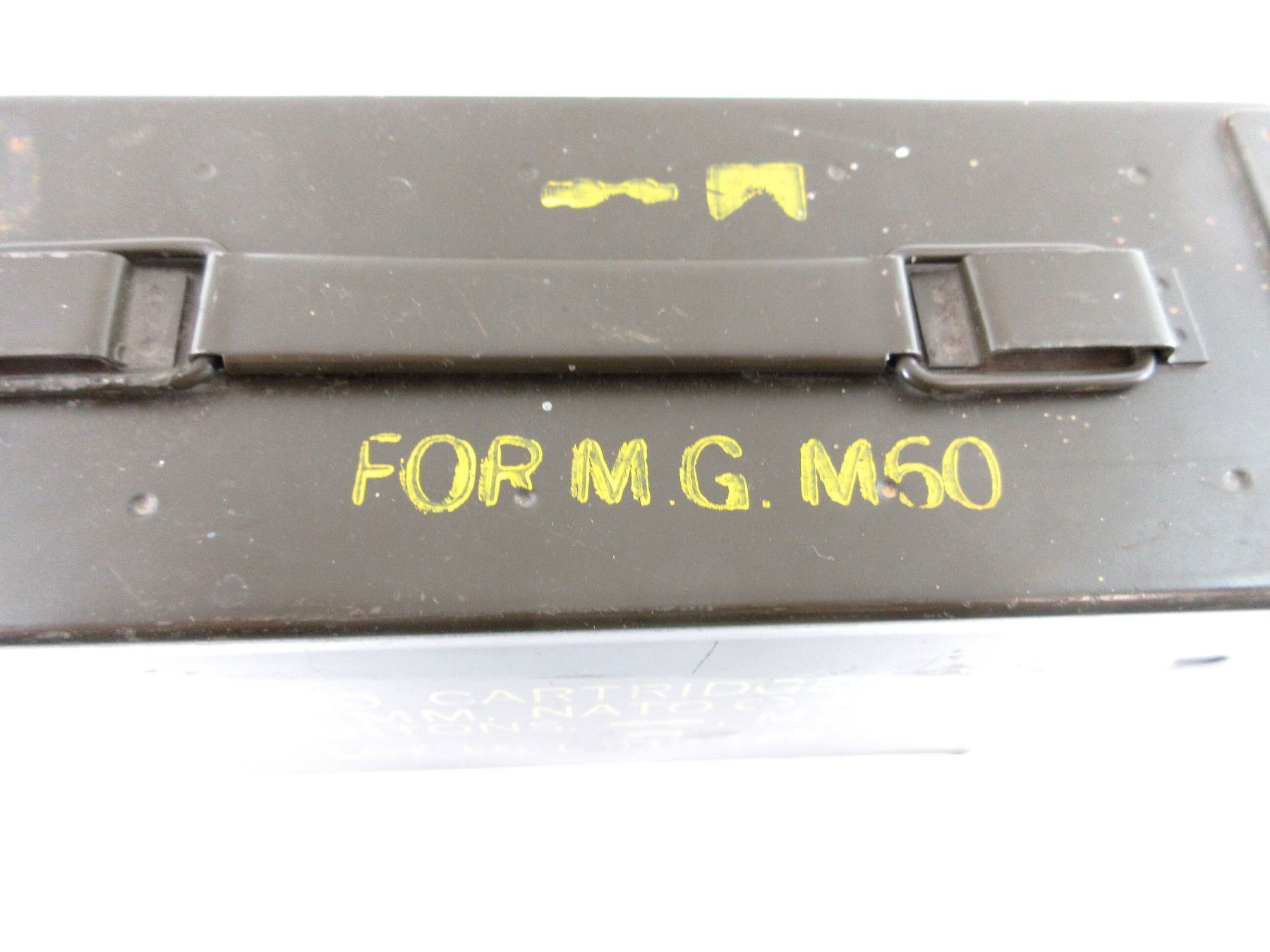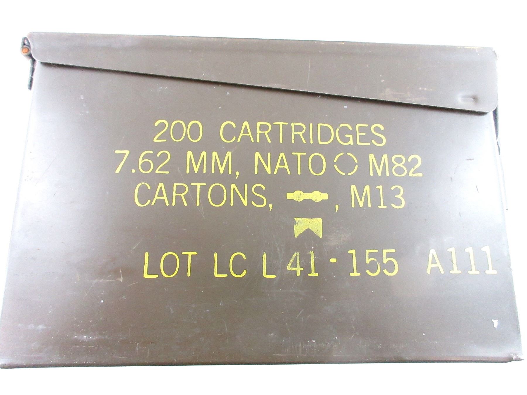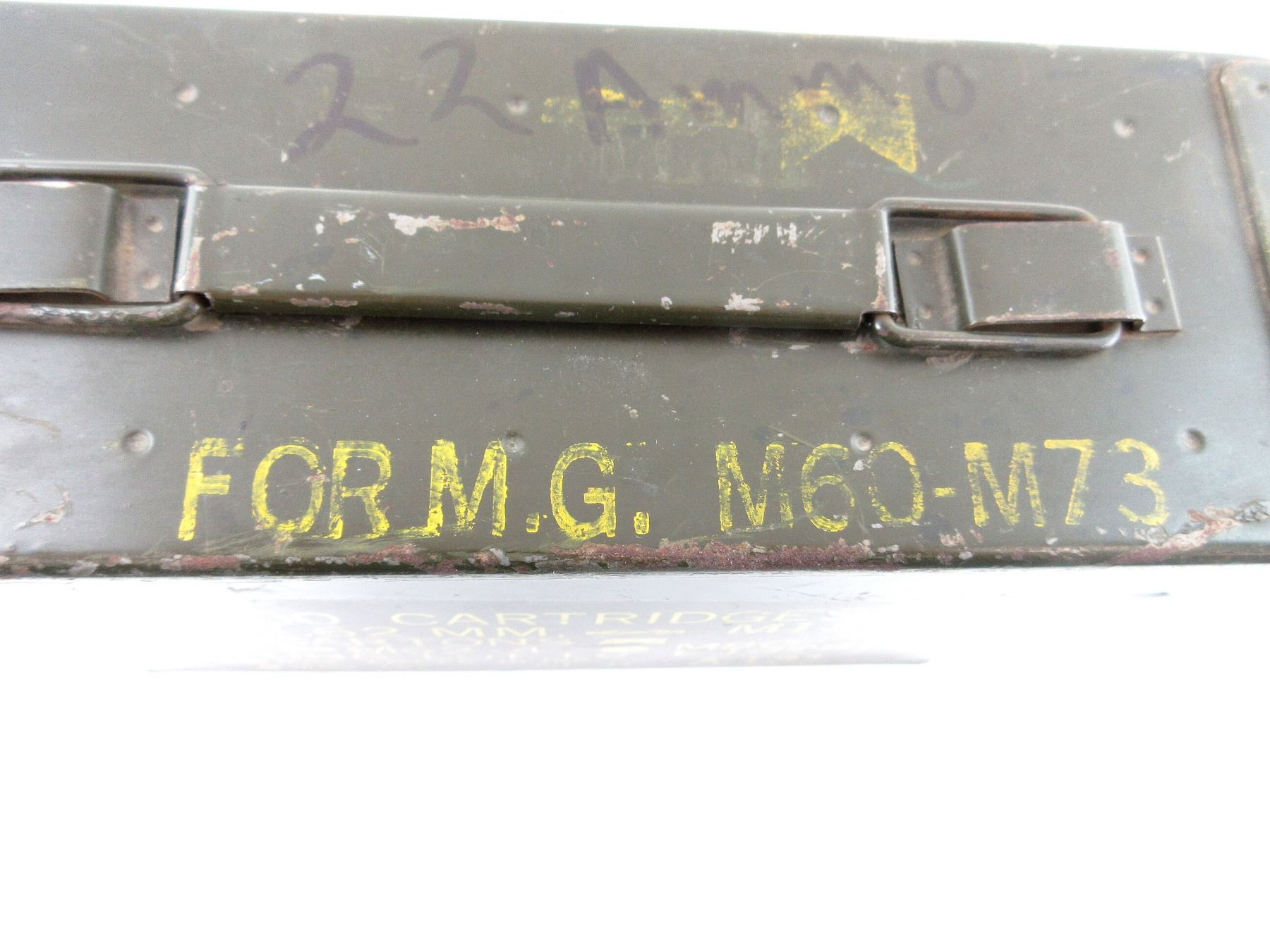 LOT INCLUDES; (4) GREEN PAINTED METAL AMMO TINS, VARIOUS MARKINGS, APPROX. 11" X 3.75" X 7". SEE PHOTOS.