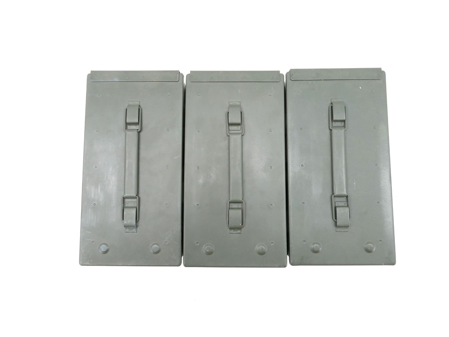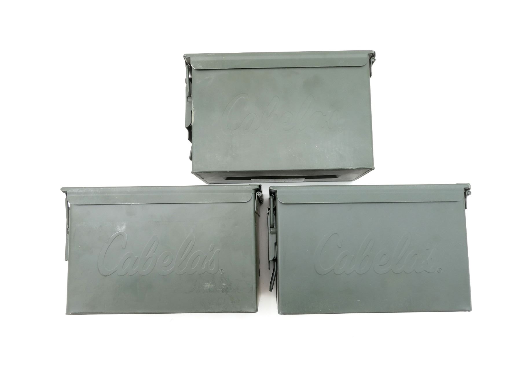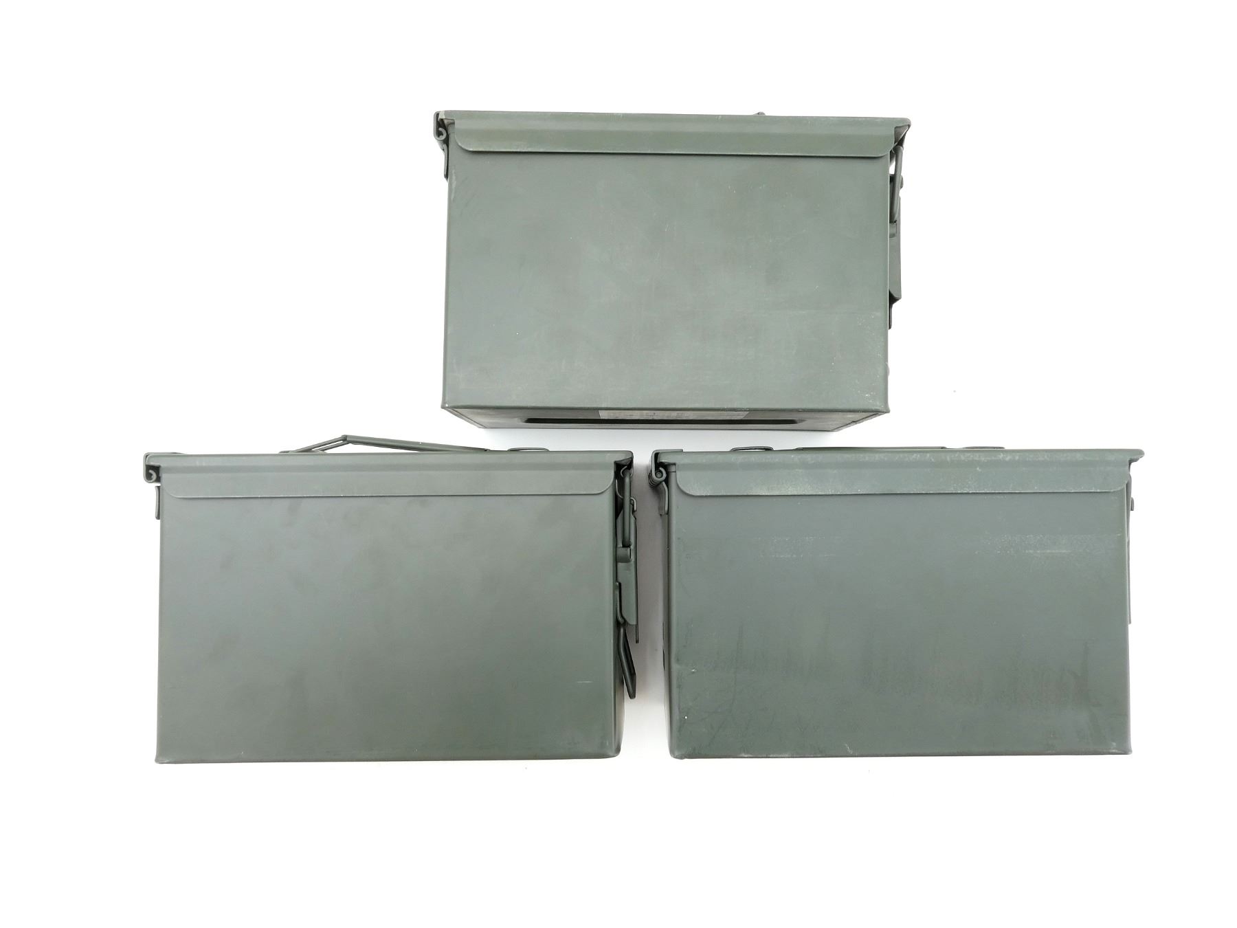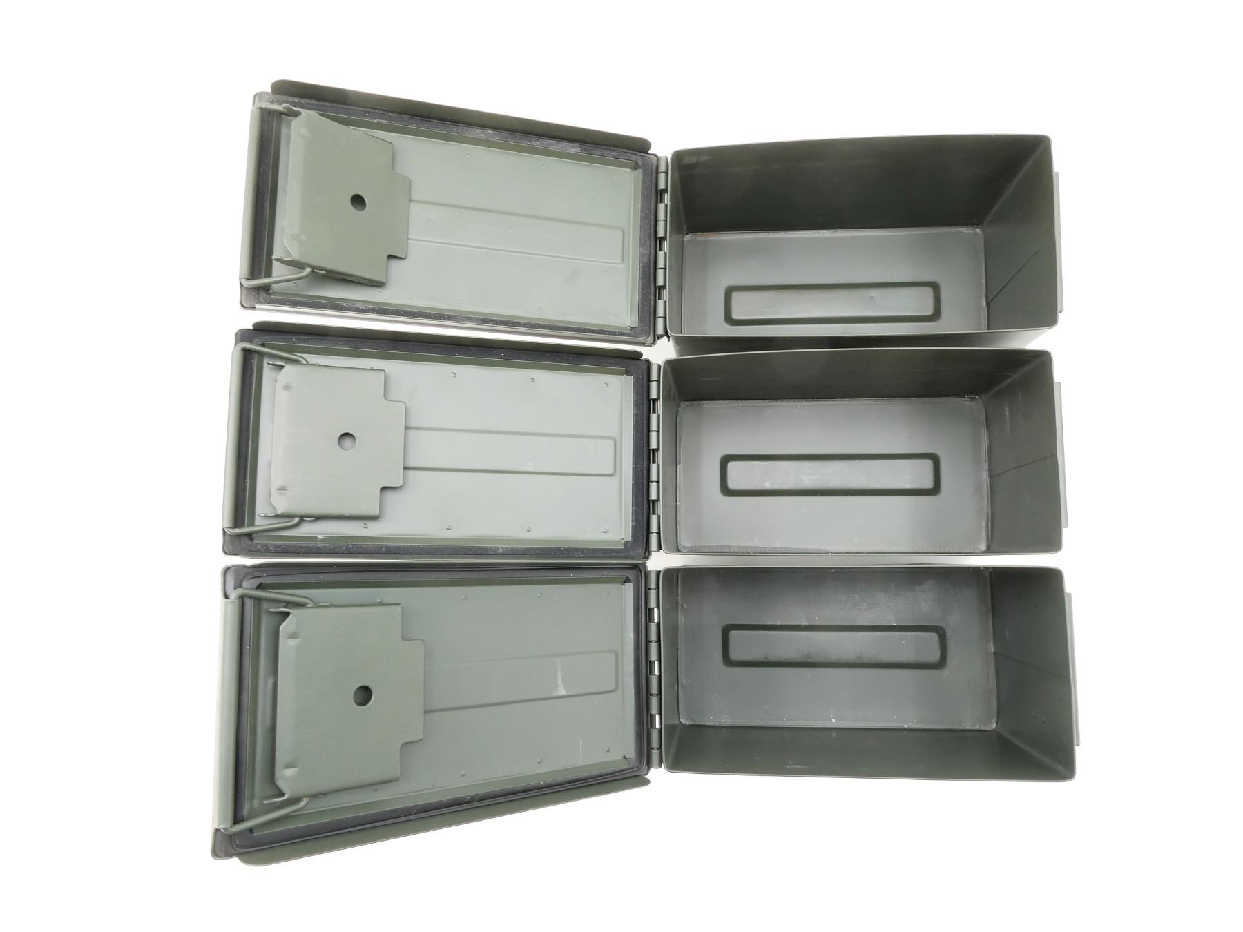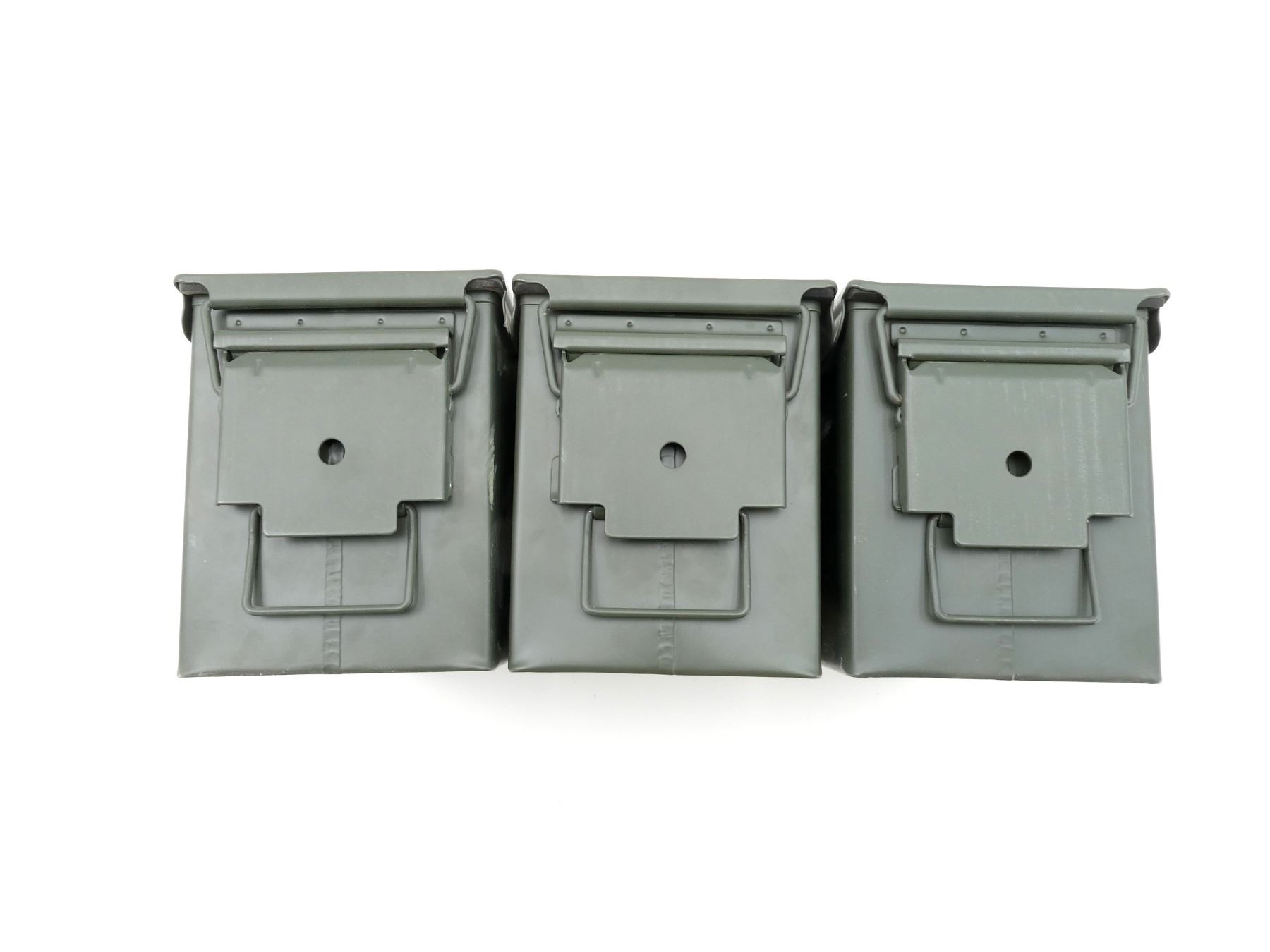 LOT INCLUDES; (3) GREEN PAINTED METAL AMMO TINS, VARIOUS MARKINGS, APPROX. 12" X 6.25" X 7 3/8". SEE PHOTOS.