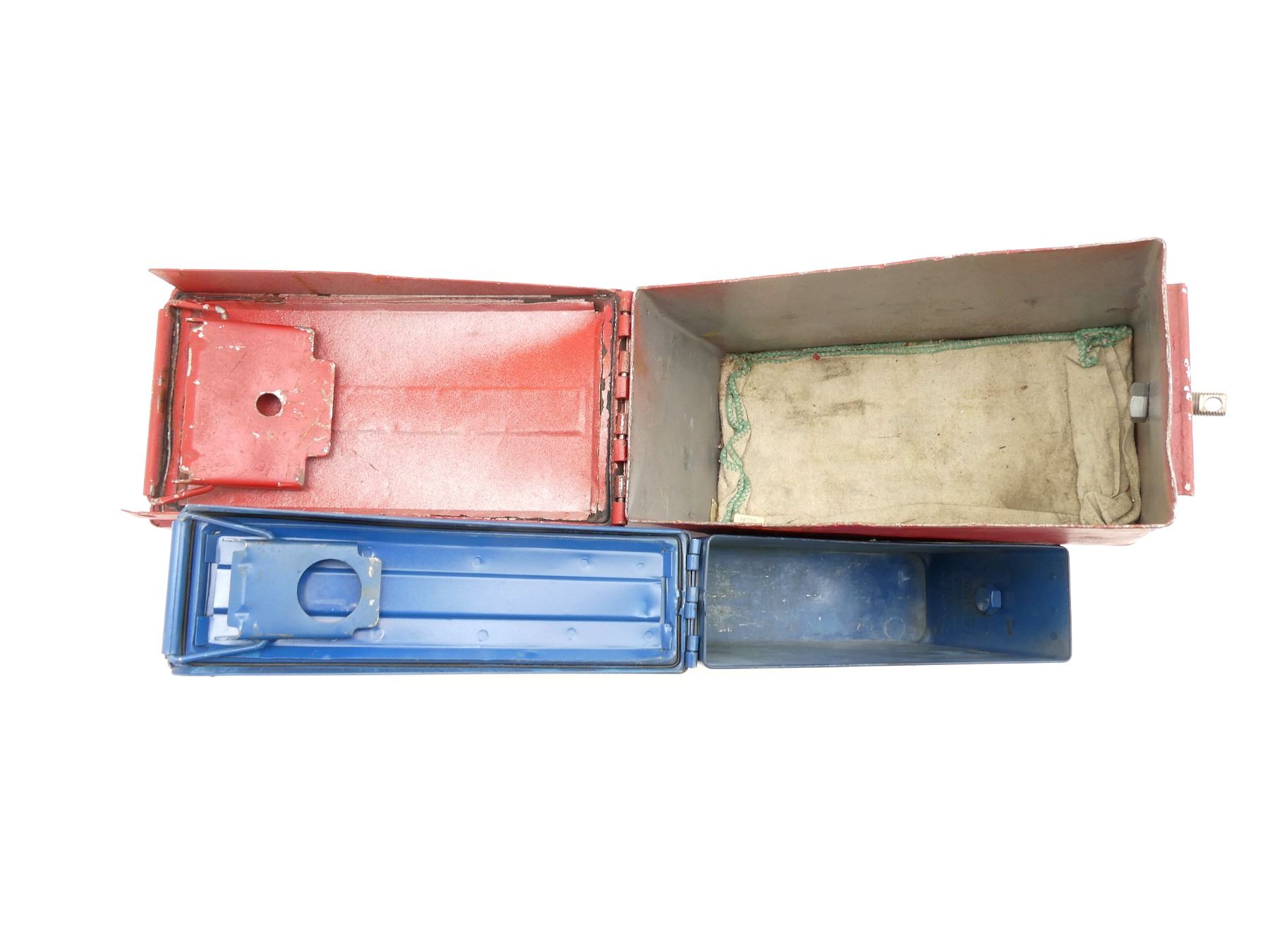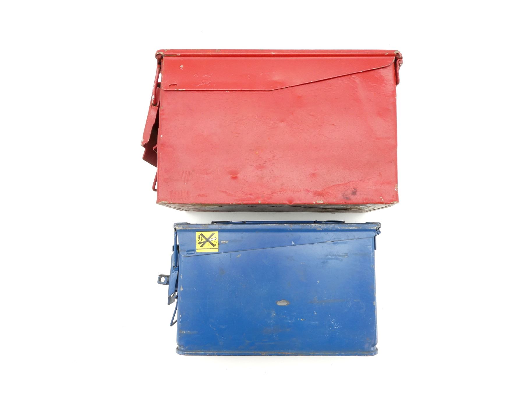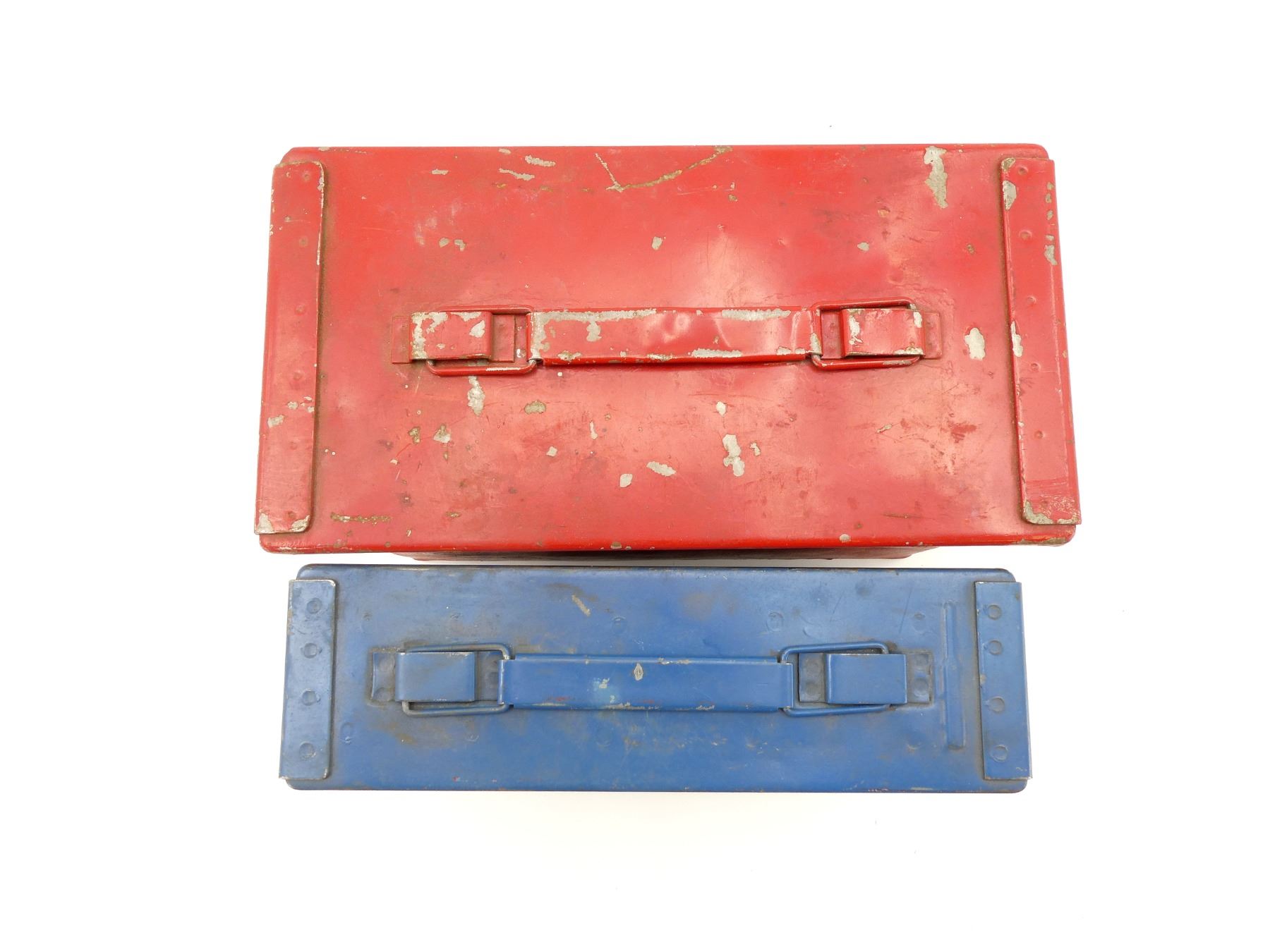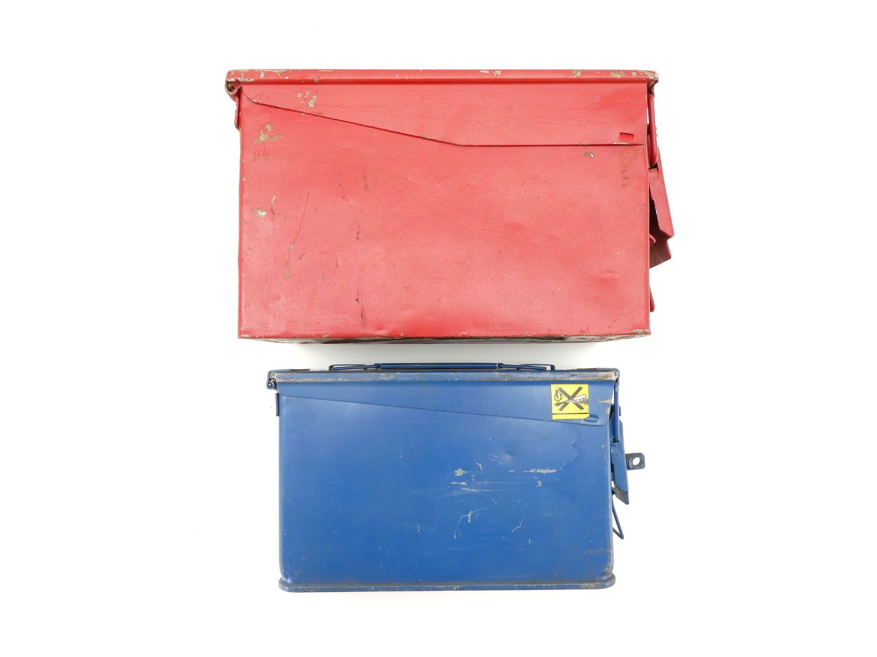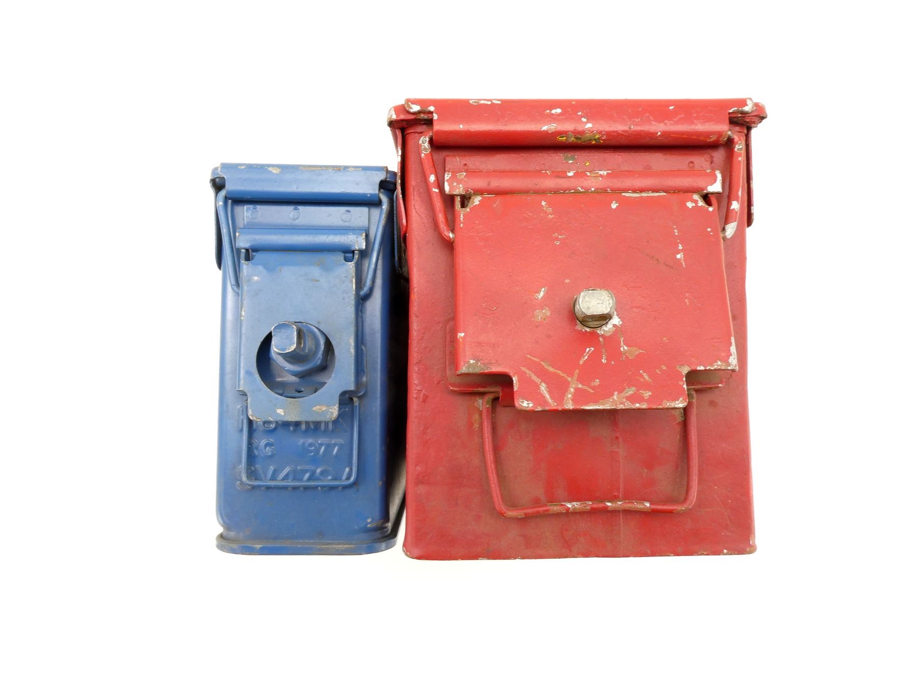 LOT INCLUDES; (1) BLUE PAINTED METAL AMMO TIN, VARIOUS MARKINGS, APPROX. 11" X 3.25" X 6.5" & (1) RED PAINTED METAL AMMO TIN, NO VISIBLE MARKINGS, APPROX. 12" X 6.25" X 7.25". SEE PHOTOS.
