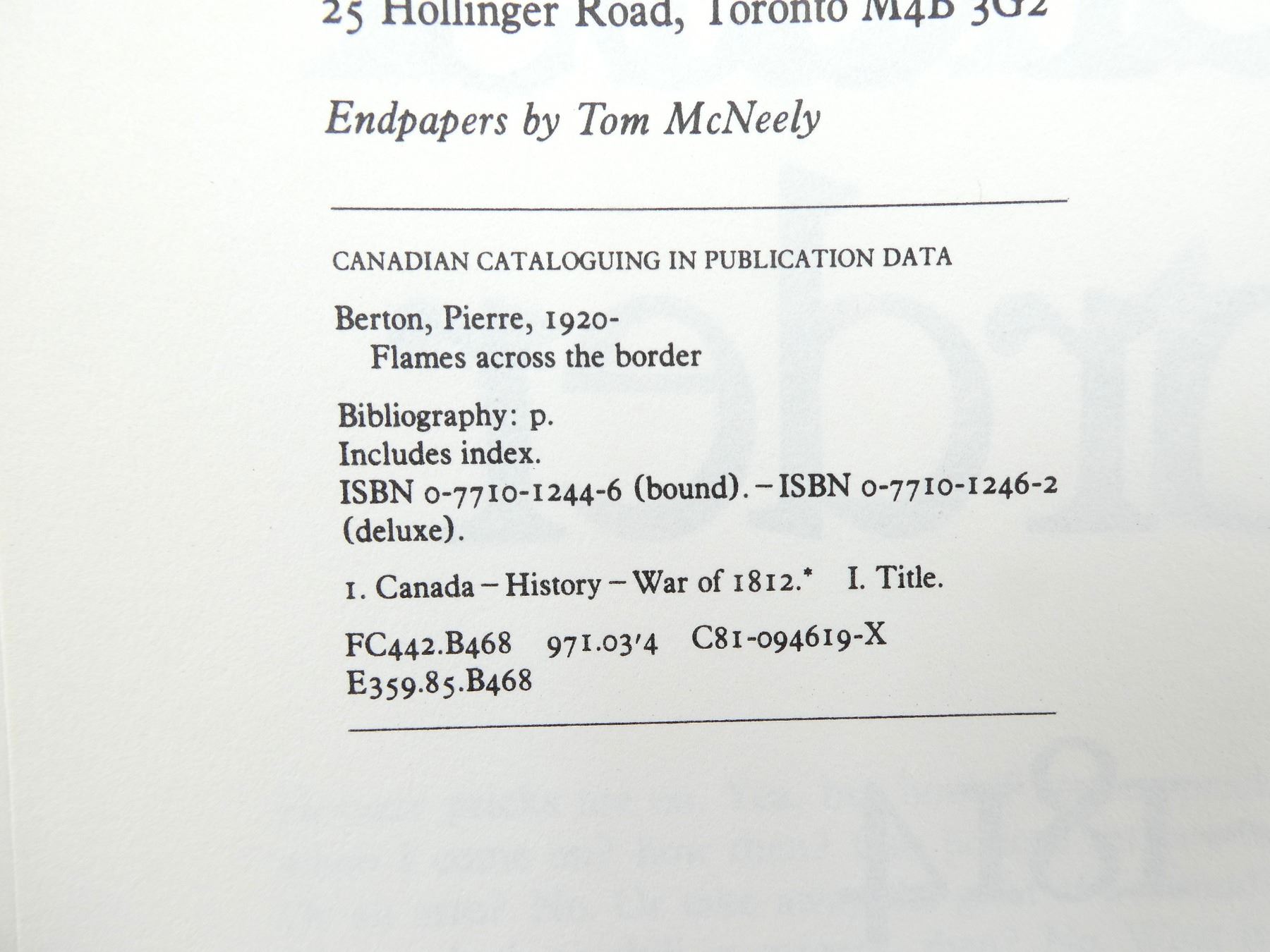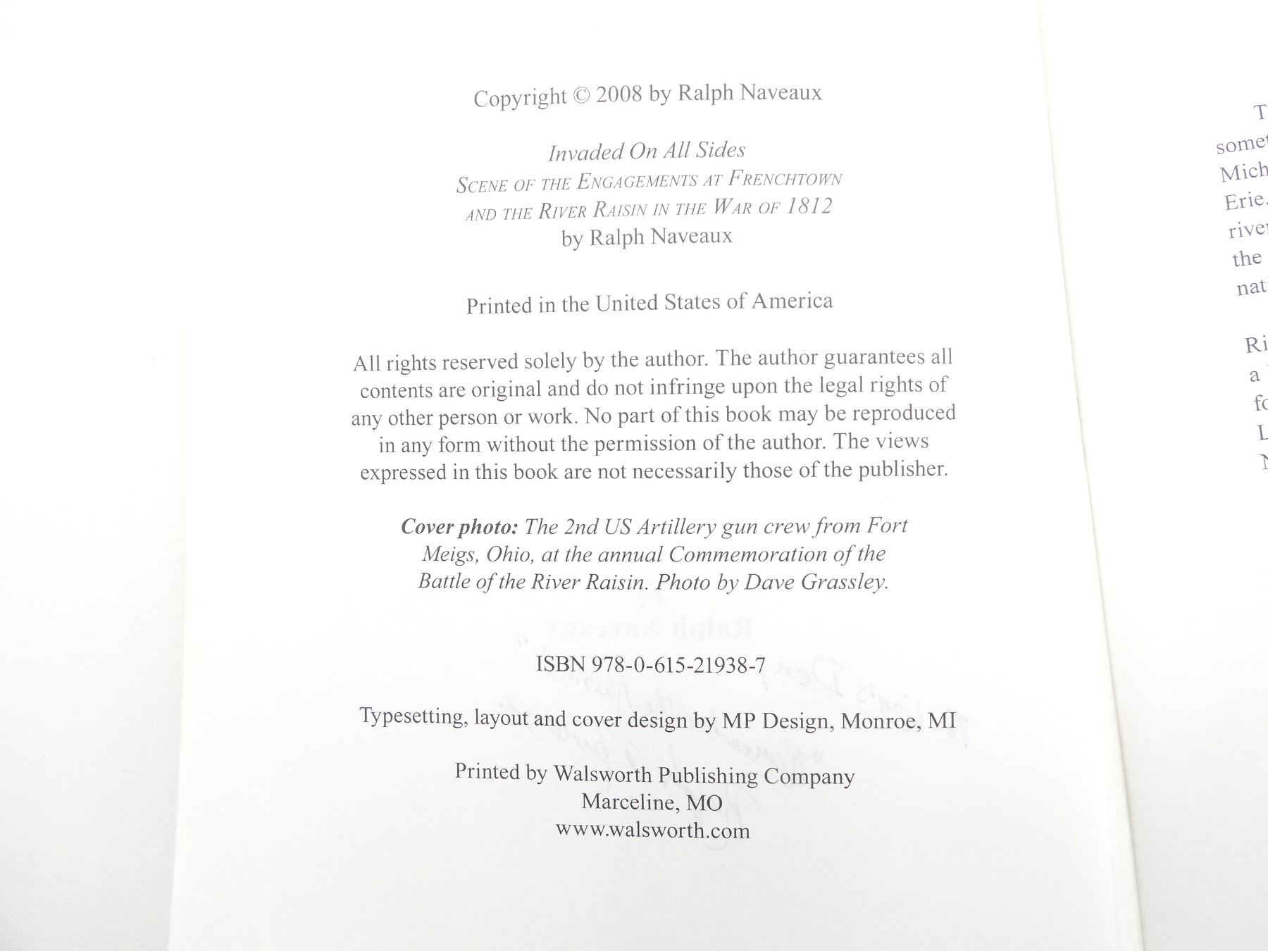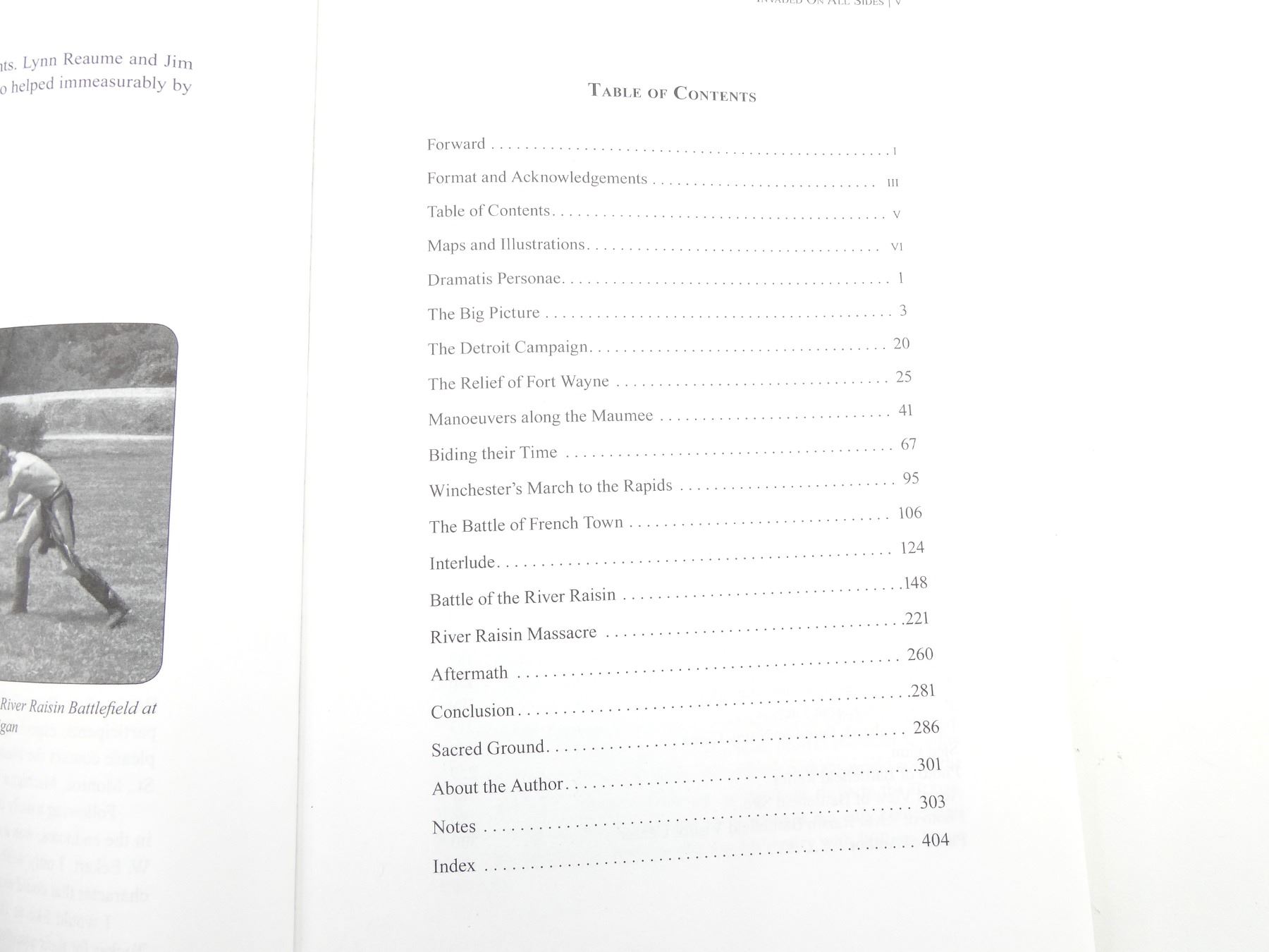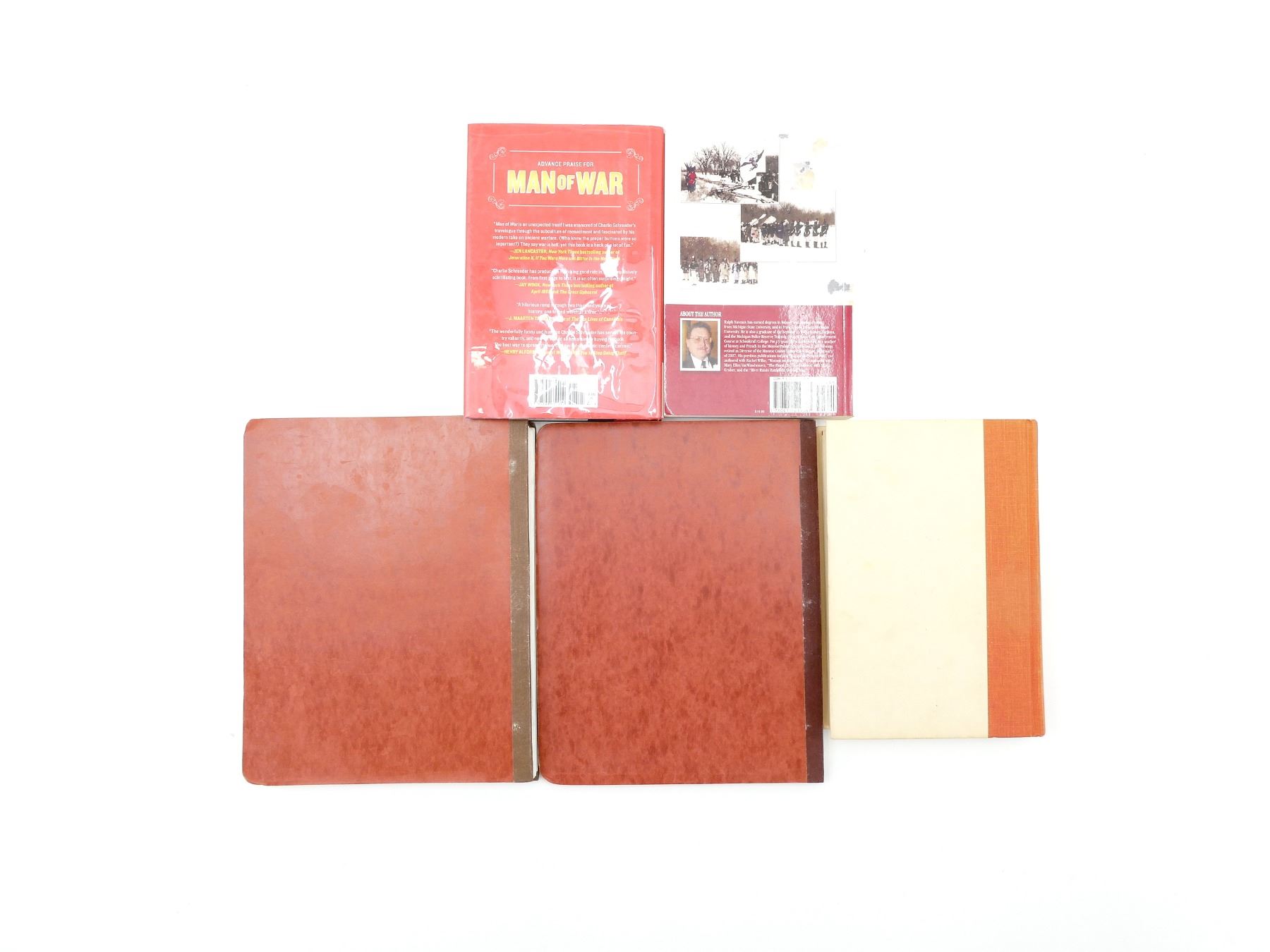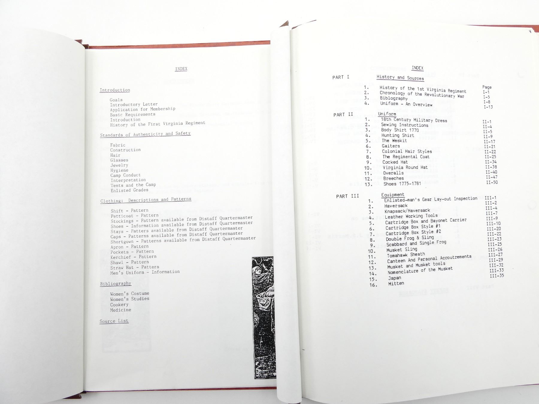 LOT INCLUDES; (1) "FIRST VIRGINIA REGIMENT OF THE CONTINENTAL LINE, SOLDIERS MANUAL", MANUAL CONTRIBUTORS CAROL DEAKIN/AL SAGUTO/DICK GRIFFITHS/CAL HURD/PAT BEAL/JIM GARNER/JEAN DANIELS/RICHARD CHIARIZIA/CHIP GNAM/JOHN VICTOR/BILL TOLBUT/BUTCH FOGLE/ TOM DEAKIN/BOB BOWSER/BRANT HEARTHINGTON, SOFT COVER BINDER, (1) "FIRST VIRGINIA REGIMENT OF THE CONTINENTAL LINE, MANUAL FOR WOMEN" MANUAL EDITED BY P.K. BEAL, COMPILED 1984, (1) "FLAMES ACROSS THE BORDER 1813-1814" BOOK BY PIERRE BERTON, HARD COVER, ISBN: 0-7710-1246-2, (1) "MAN OF WAR" BOOK BY CHARLIE SCHROEDER, HARD COVER WITH DUST COVER, ISBN: 978-1-59463-091-0 & (1) "INVADED ON ALL SIDES" BOOK BY RALPH NAVEAUX, SOFT COVER, ISBN: 978-0-615-21938-7. SEE PHOTOS.