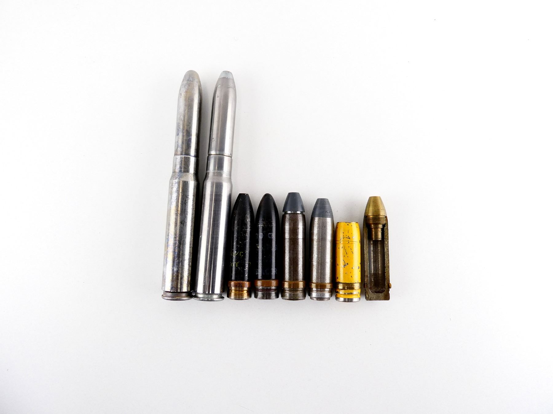 LOT INCLUDES; APPROX. (2) DRILL RNDS, VARIOUS HEADSTAMPS, (6) PROJECTILES, VARIOUS MARKINGS & COLORS, (1) IS A CUT AWAY.