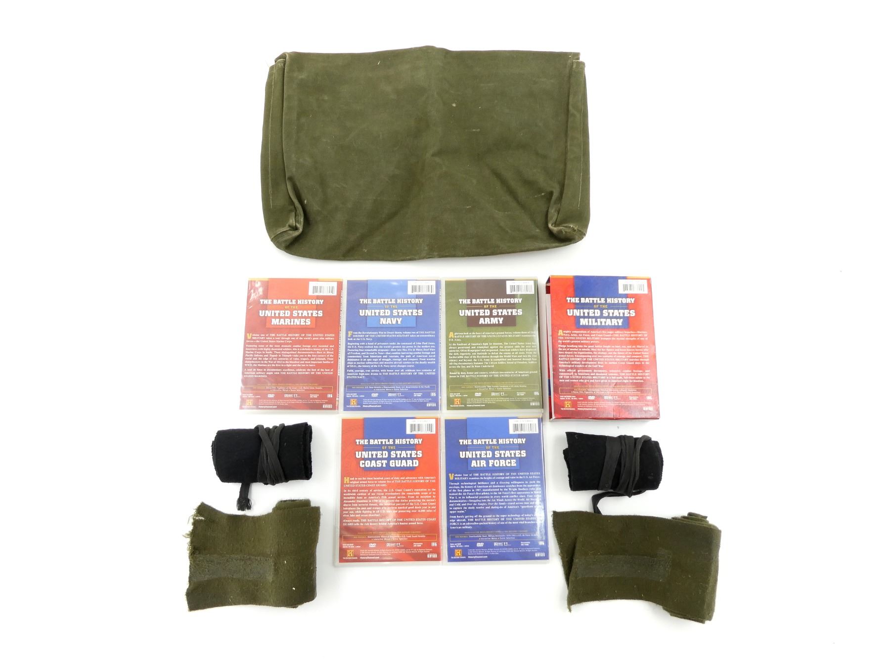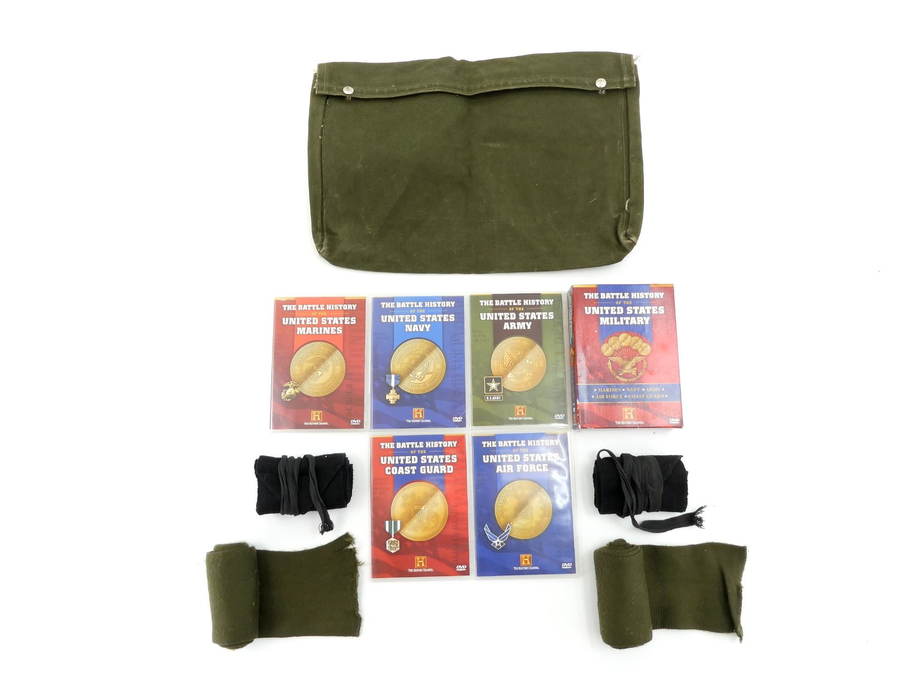 LOT INCLUDES; (2) PAIRS OF PUTTEES, GREEN / BLACK WOOL, NO VISIBLE MARKINGS, APPROX. 4.25" / 4.5" WIDTHS, (1) GREEN CANVAS MAP / DOCUMENT POUCH, NO VISIBLE MARKINGS, TWO LARGE POCKETS, SNAP CLOSURES, APPROX. 12" L X 19" W & (1) "THE BATTLE HISTORY OF THE UNITED STATES MILITARY" DVD BOXED SET, INCLUDES 5 DVD'S, MARINES, NAVY, ARMY, AIR FORCE & COAST GUARD, ALL DVDS ARE PRESENT, ALL UN-TESTED. SEE PHOTOS.