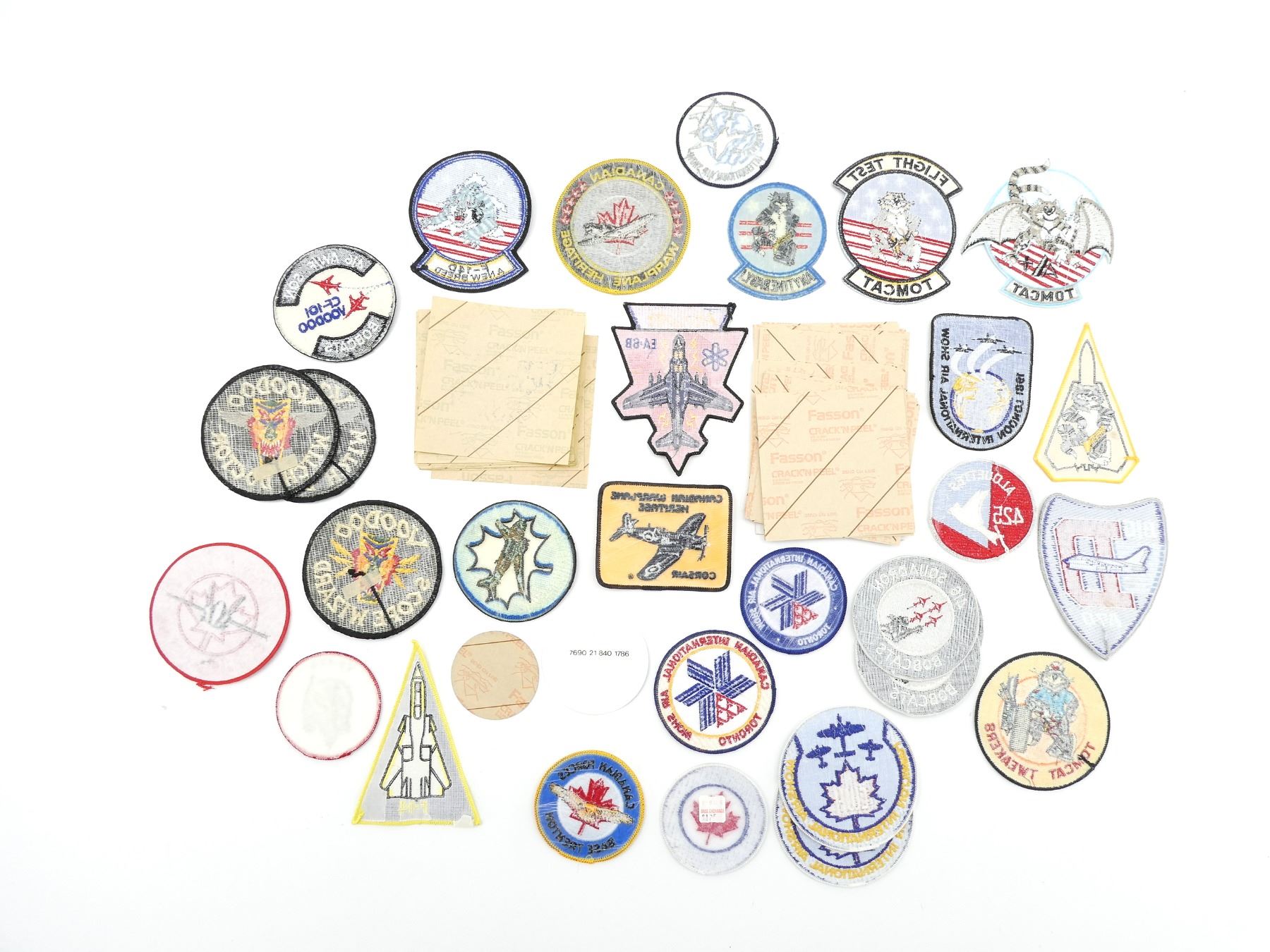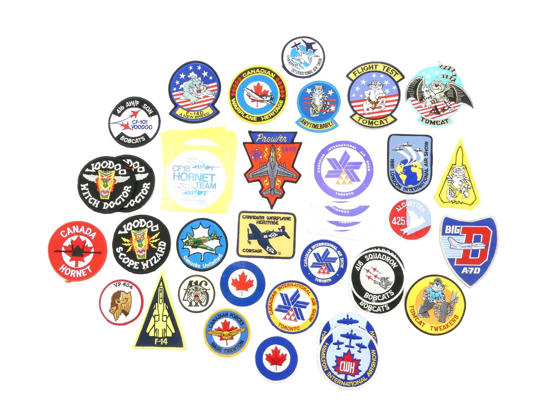 APPROX. (89) PIECES, VARIOUS SIZES / STYLES / COLOURS / MATERIALS, INCLUDES; VARIOUS CANADIAN INTERNATIONAL AIRSHOW TORONTO STICKERS, VARIOUS CF18 HORNET TEAM STICKERS, 416 BOBCAT STICKER, RCAF STICKER, CANUCKS UNLIMITED BADGE, CANADIAN FORCES BASE TRENTON BADGE, CANADIAN WARPLANE HERITAGE CORSAIR BADGE, CANADA HORNET BADGE, VP 404, TOMCAT TWEAKERS, ETC. SEE PHOTOS.