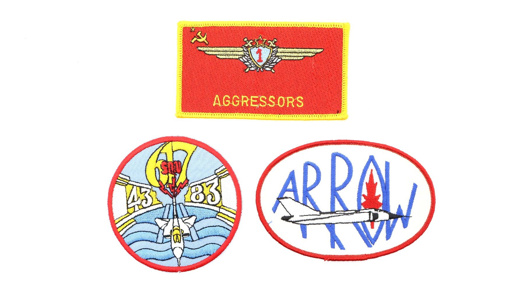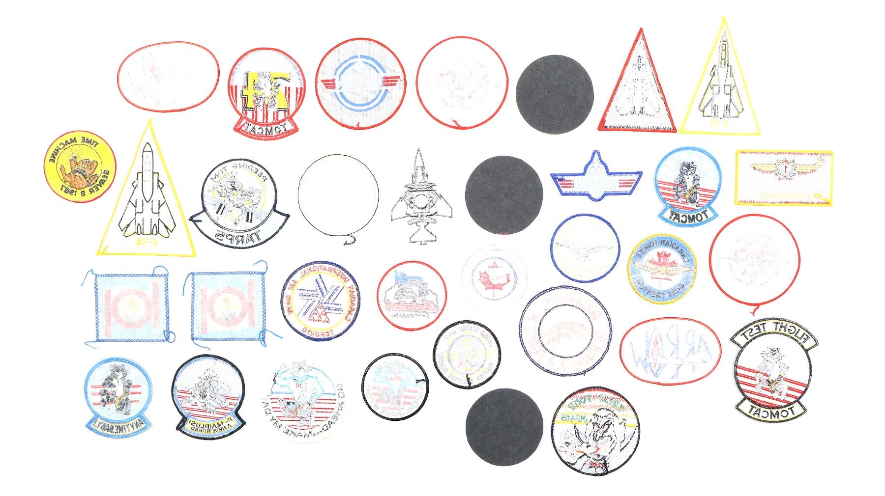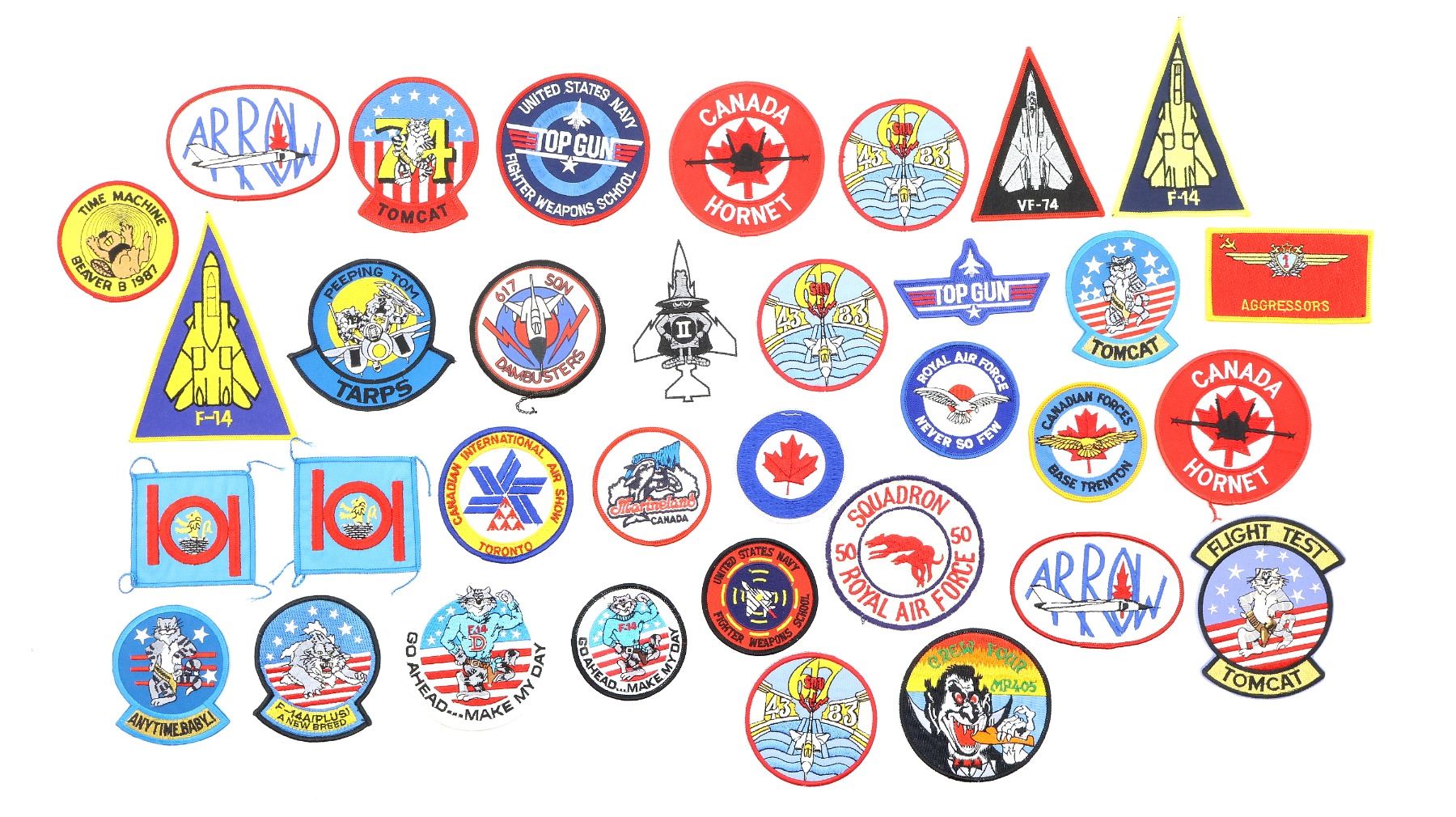 APPROX. (34) PIECES, VARIOUS SIZES / STYLES / COLOURS, U.S. / CANADIAN / BRITISH MILITARY, INCLUDES; FLIGHT TEST TOMCAT, F-14A(PLUS) A NEW BREED, F-14D GO AHEAD MAKE MY DAY, U.S. NAVY FIGHTER WEAPONS SCHOOL, CANADIAN ARROW, CANADA HORNET, CANADIAN INTERNATIONAL AIR SHOW TORONTO, 50 SQUADRON RAF, CREW FOUR MP405, CANADIAN FORCES BASE TRENTON, RAF 101 SQUADRON, ETC. SEE PHOTOS.