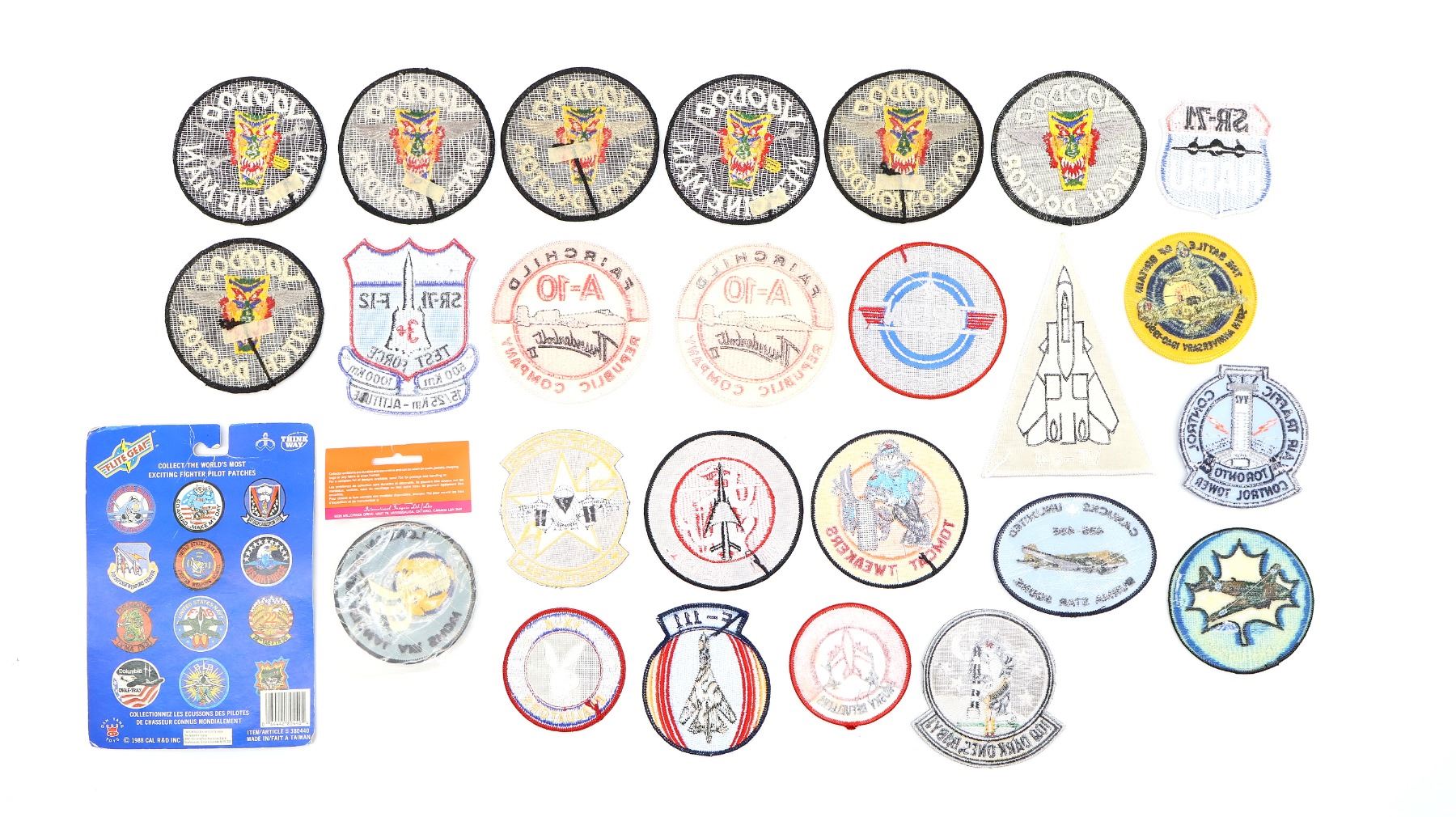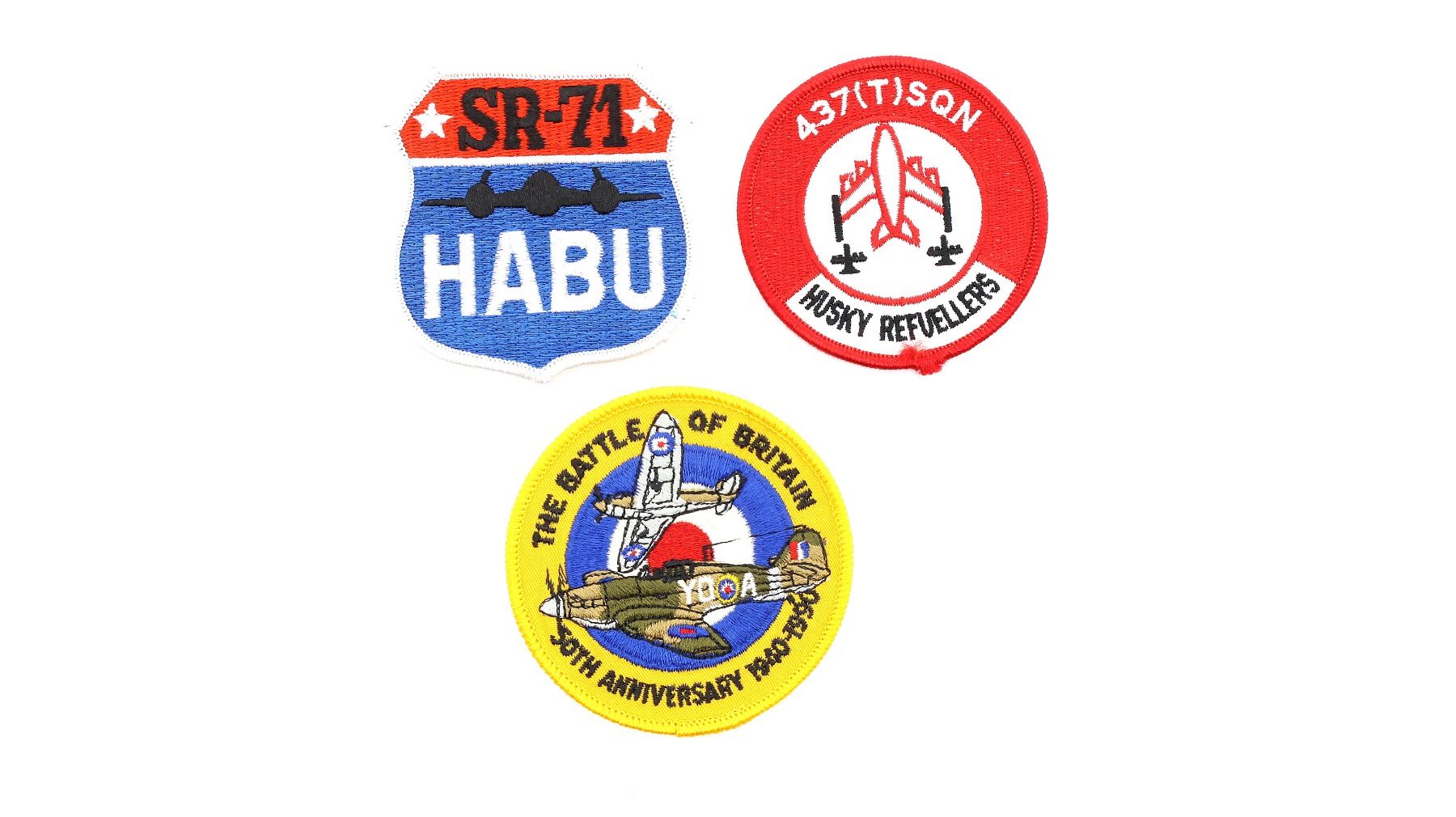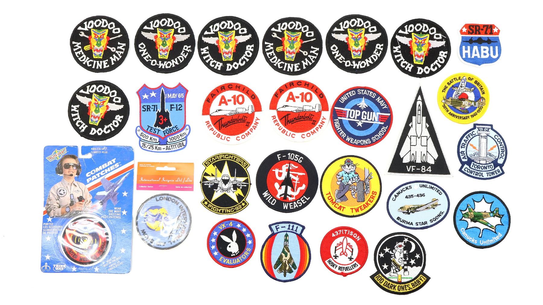 APPROX. (26) PIECES, VARIOUS SIZES / STYLES / COLOURS / MATERIALS, U.S. / CANADIAN / BRITISH MILITARY, INCLUDES; CANUCKS UNLIMITED 435-436 BURMA STAR SQDNS, THE BATTLE OF BRITAIN 50TH ANNIVERSARY 1940-1990, VOODOO WITCH DOCTOR, VOODOO MEDICINE MAN, VX-4 EVALUATORS, STARFIGHTERS FIGHTING 33, LONDON INTERNATIONAL AIRSHOW, SR-71 HABU, F-111, F-105G WILD WEASEL, ETC. SEE PHOTOS.