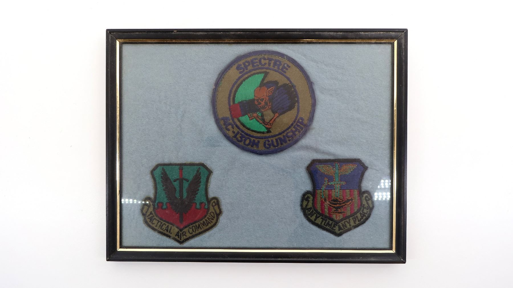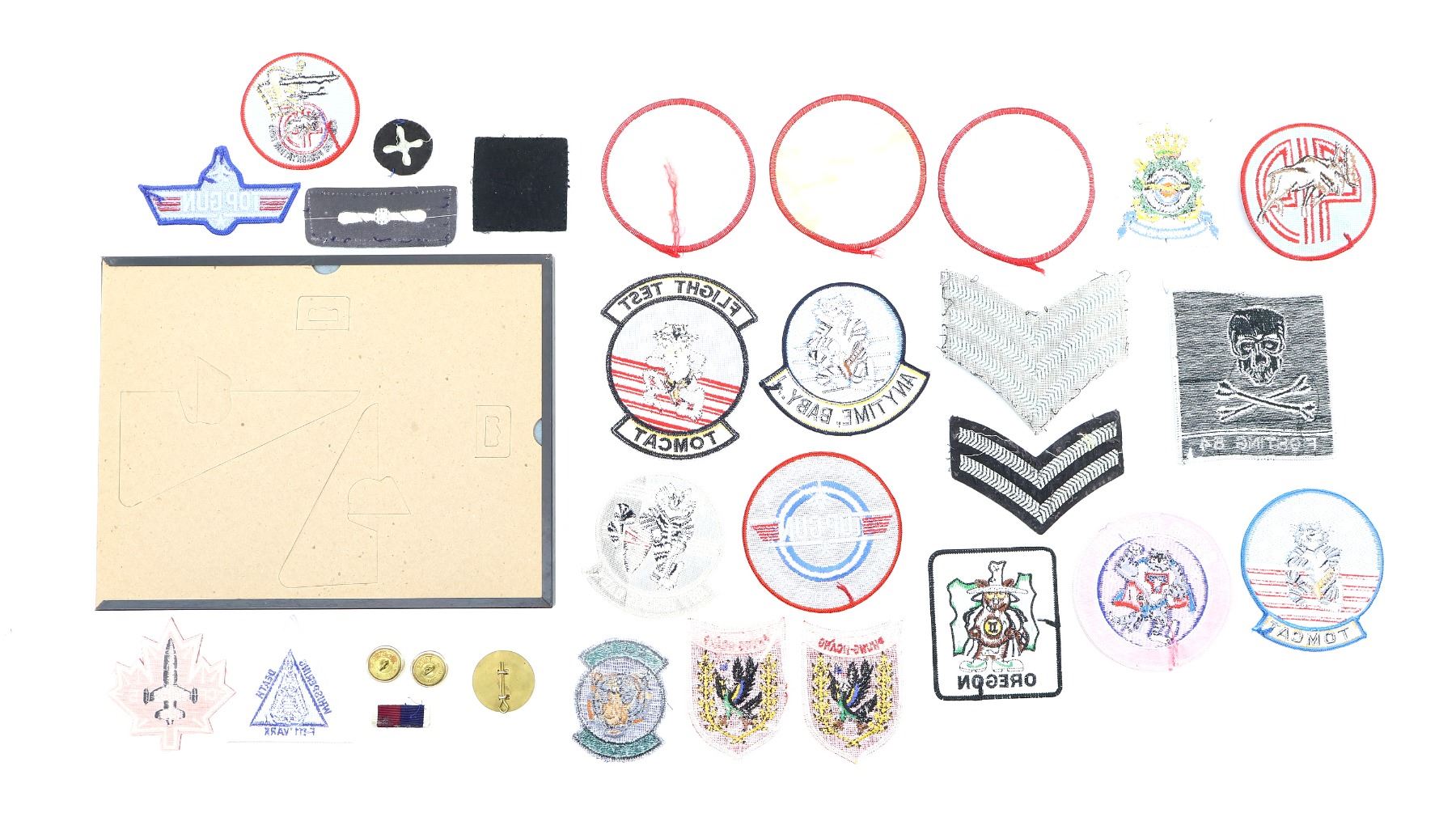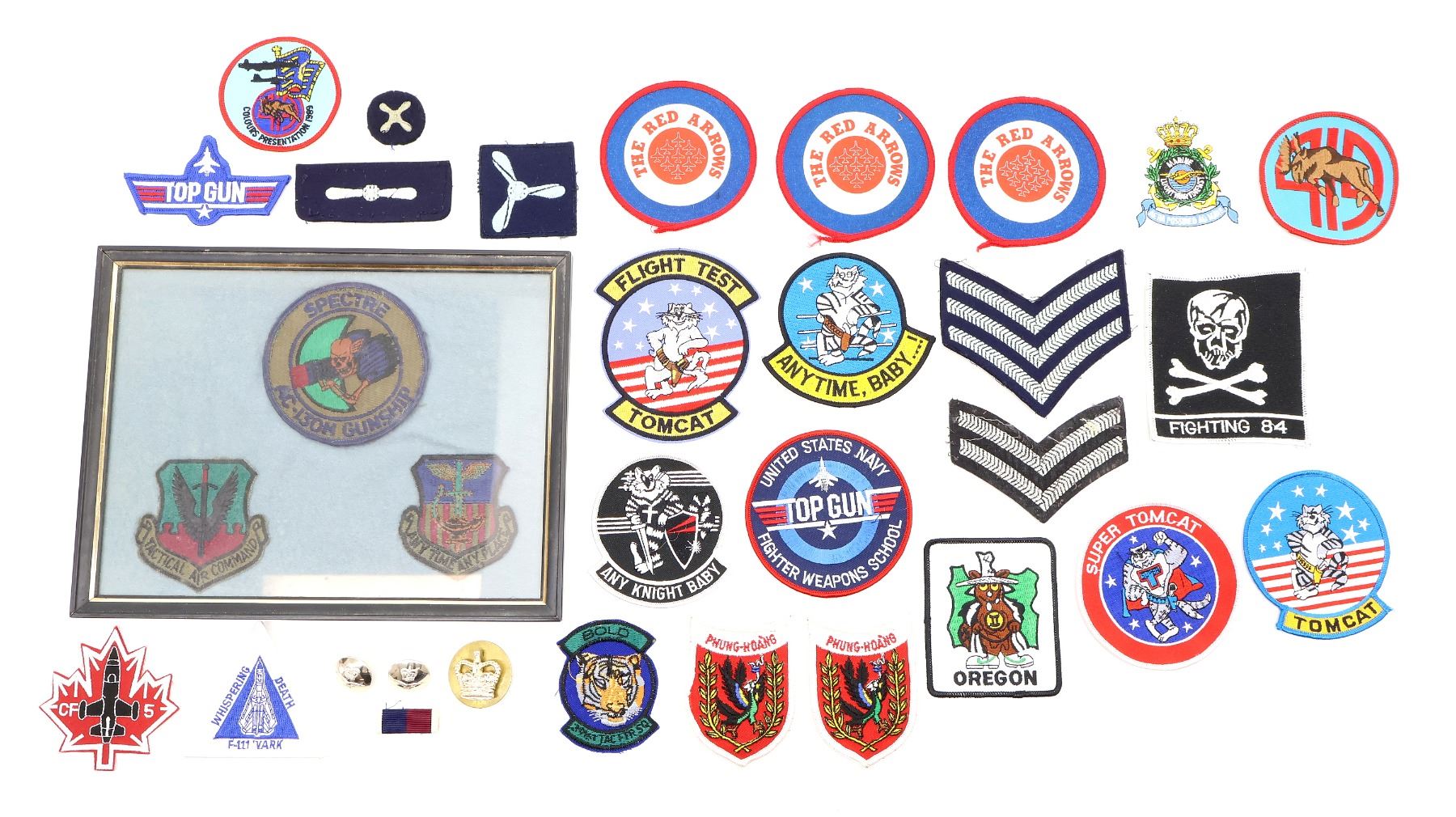 APPROX. (32) PIECES, VARIOUS SIZES / STYLES / COLOURS / MATERIALS, U.S. / CANADIAN / BRITISH / NETHERLANDS MILITARY, INCLUDES; ROYAL NETHERLANDS NAVAL AIR SERVICE BADGE, THE RED ARROWS, PHOENIX PROGRAM BADGES, SUPER TOMCAT, FIGHTING 84, RCAF 419 SQUADRON, FRAMED UNDER GLASS TACTICAL AIR COMMAND BADGE / LOCKHEAD AC-130H SPECTRE GUNSHIP BADGE / 1ST SPECIAL OPERATIONS WING BADGE, APPROX. 11 1/8" X 8 5/8", ETC. SEE PHOTOS. *NO GUARANTEE ON GLASS FOR SHIPPING*