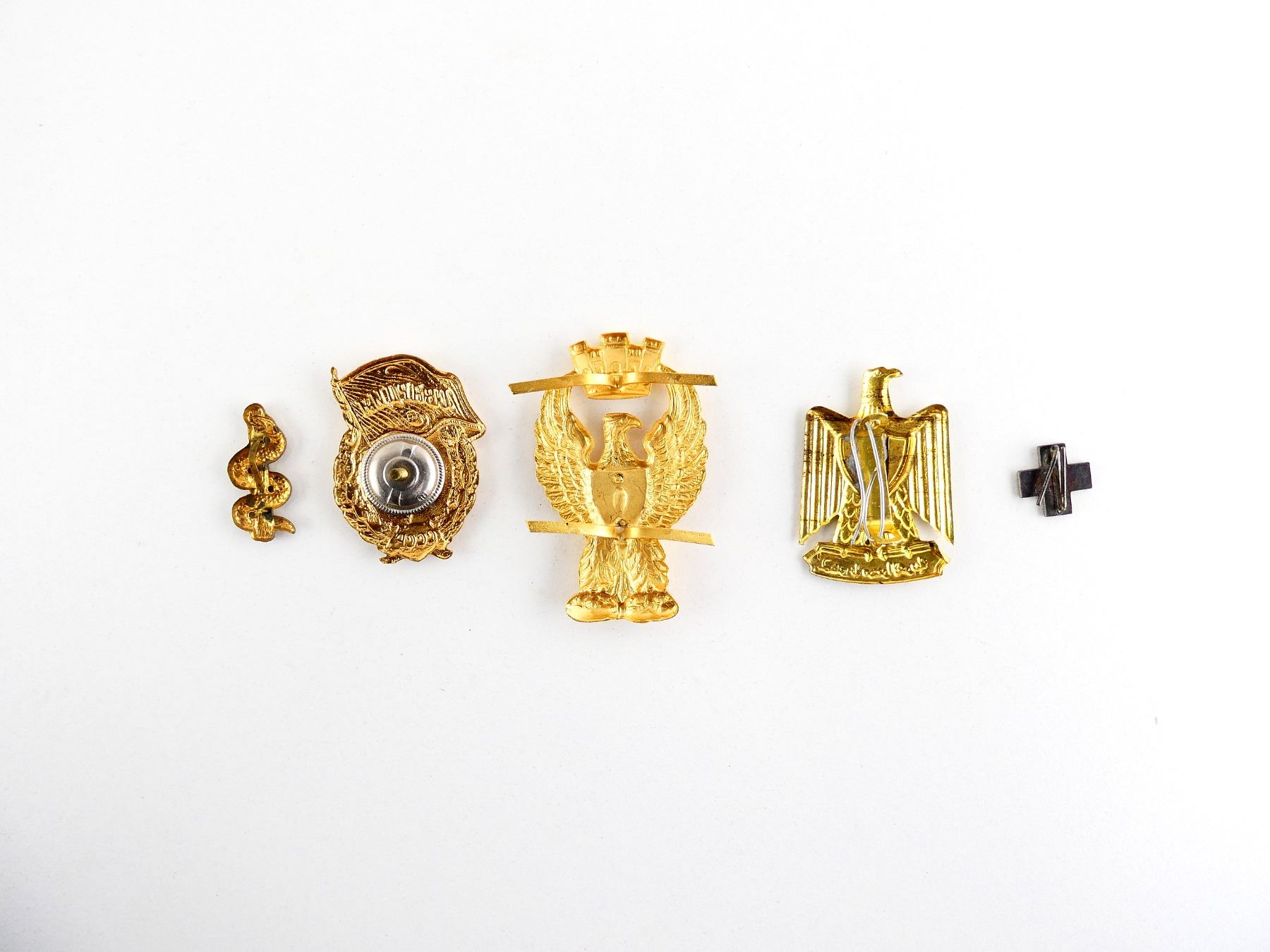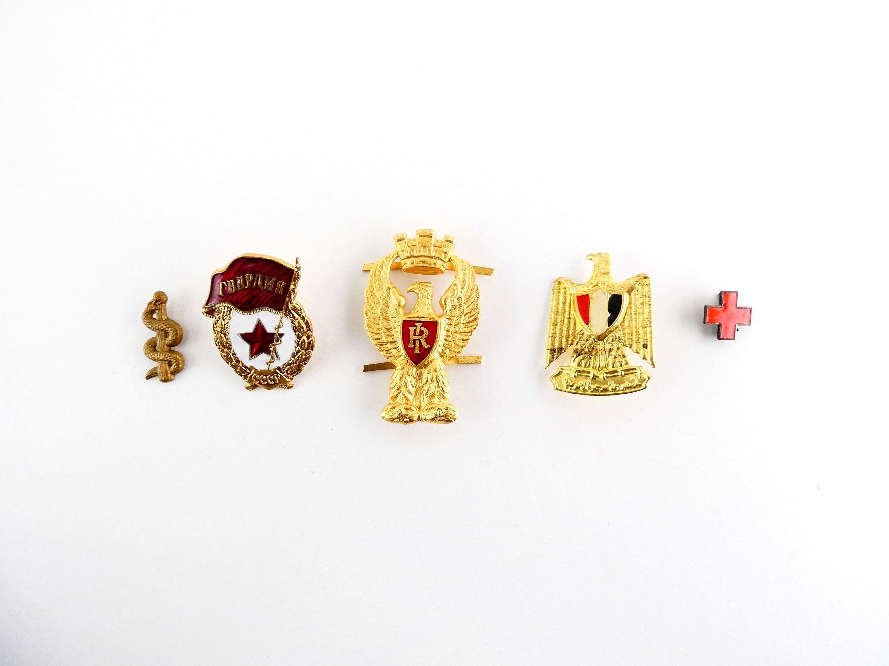 LOT INCLUDES; (1) ITALIAN BRASS POLICE CAP BADGE, PIN BACKING INTACT, (1) EGYPTIAN BRASS EAGLE CAP BADGE WITH ARABIC SCRIPT, (1) RUSSIAN SOVIET GUARDS BADGE, BRASS WITH RED / WHITE ENAMELED FRONT, SCREW BACKING INTACT, (1) POSSIBLY YUGOSLAVIAN BRASS MEDICAL BADGE & (1) RED CROSS BADGE. SEE PHOTOS.