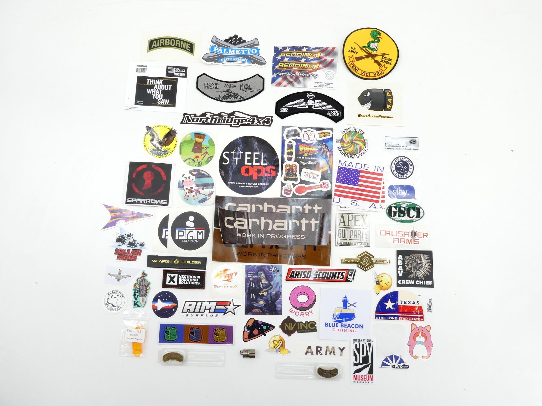 APPROX. (60) PIECES, VARIOUS STICKERS, BADGES, PINS, VARIOUS SIZES / MATERIALS, MILITARY / NON-MILITARY INCLUDES; AIRBORNE STICKER, ARMY STICKER, BRITISH STYLE PARATROOPER STICKER, U.S. ARMY SNIPER SCHOOL BADGE, PALMETTO STATE ARMORY STICKER, U.S. HOLOCAUST MEMORIAL MUSEUM STICKER, REDDING PRECISION RELOADING STICKERS, MADE IN U.S.A. STICKERS, INTERNATIONAL SPY MUSEUM STICKER, ETC. SEE PHOTOS.