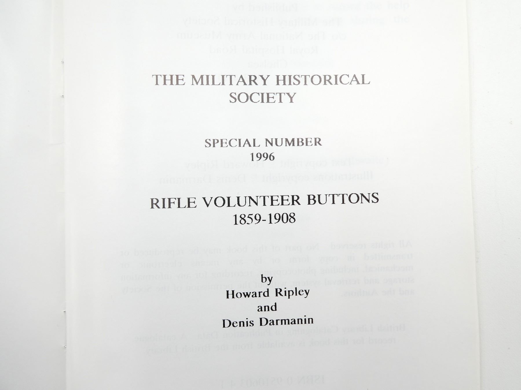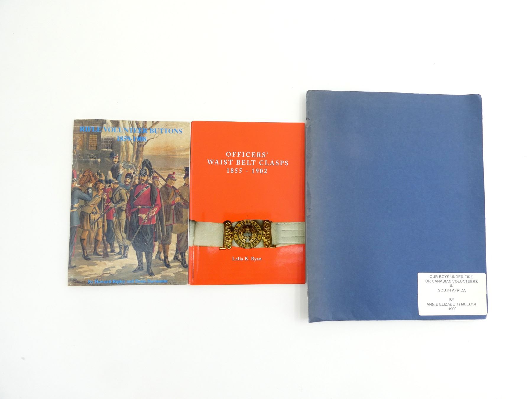 LOT INCLUDES; (1) "RIFLE VOLUNTEER BUTTONS 1859-1908" BOOK BY HOWARD RIPLEY & DENIS DARMANIN, SOFT COVER, ISBN: 0-9510603-4-1, (1) "OFFICERS' WAIST BELT CLASPS 1855-1902" BOOK BY LELIA B. RYAN, SOFT COVER, ISBN: 0-9510603-2-5 & (1) "OUR BOYS UNDER FIRE OR CANADIAN VOLUNTEERS IN SOUTH AFRICA" BOOK, PRINTED COPY & BINDER BOUND, BY ANNIE ELIZABETH MELLISH, SOFT COVER, COPYRIGHT 1900. SEE PHOTOS.