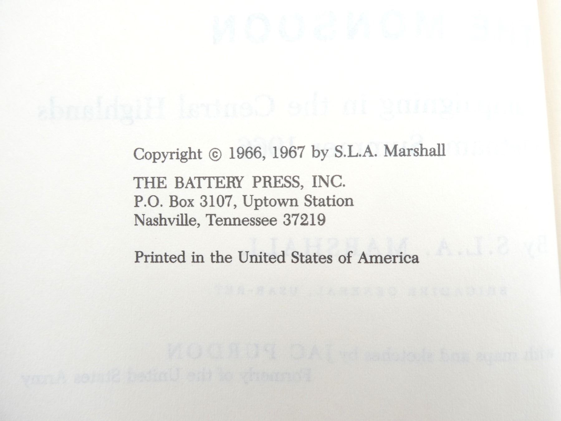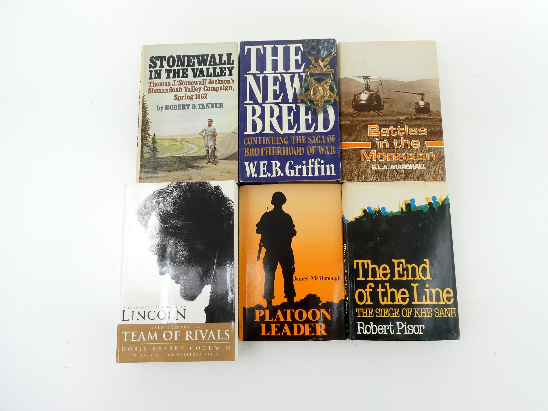 LOT INCLUDES; (1) "TEAM OF RIVALS, THE POLITICAL GENIUS OF ABRAHAM LINCOLN" BOOK BY DORIS KEARNS GOODWIN, SOFT COVER, ISBN: 978-1-4516-8809-2, (1) "STONEWALL IN THE VALLEY, THOMAS J.'STONEWALL' JACKSON'S SHENANDOAH VALLEY CAMPAIGN, SPRING 1862" BOOK BY ROBERT G. TANNER, HARD COVER WITH DUST COVER, COPYRIGHT 1976, (1) "THE NEW BREED, CONTINUING THE SAGA OF BROTHERHOOD OF WAR" BOOK BY W.E.B. GRIFFIN, HARD COVER WITH DUST COVER, COPYRIGHT 1987, (1) "THE END OF THE LINE, THE SIEGE OF KHE SANH" BOOK BY ROBERT PISOR, HARD COVER WITH DUST COVER, COPYRIGHT 1982, (1) "PLATOON LEADER" BOOK BY JAMES MCDONOUGH, HARD COVER WITH DUST COVER, COPYRIGHT 1985 & (1) "BATTLES IN THE MONSOON" BOOK BY S.L.A. MARSHALL, HARD COVER WITH DUST COVER, COPYRIGHT 1967. SEE PHOTOS.