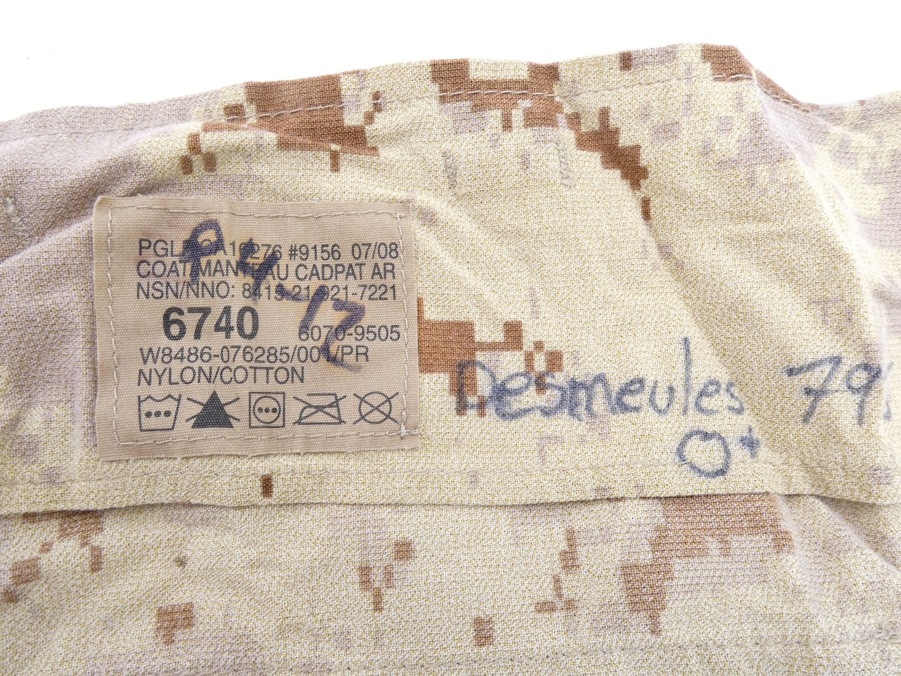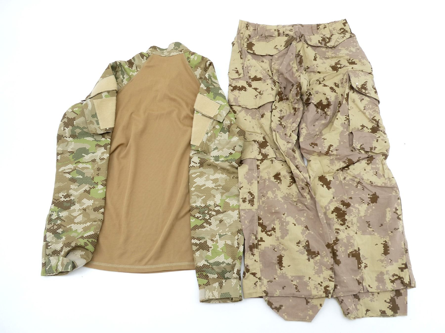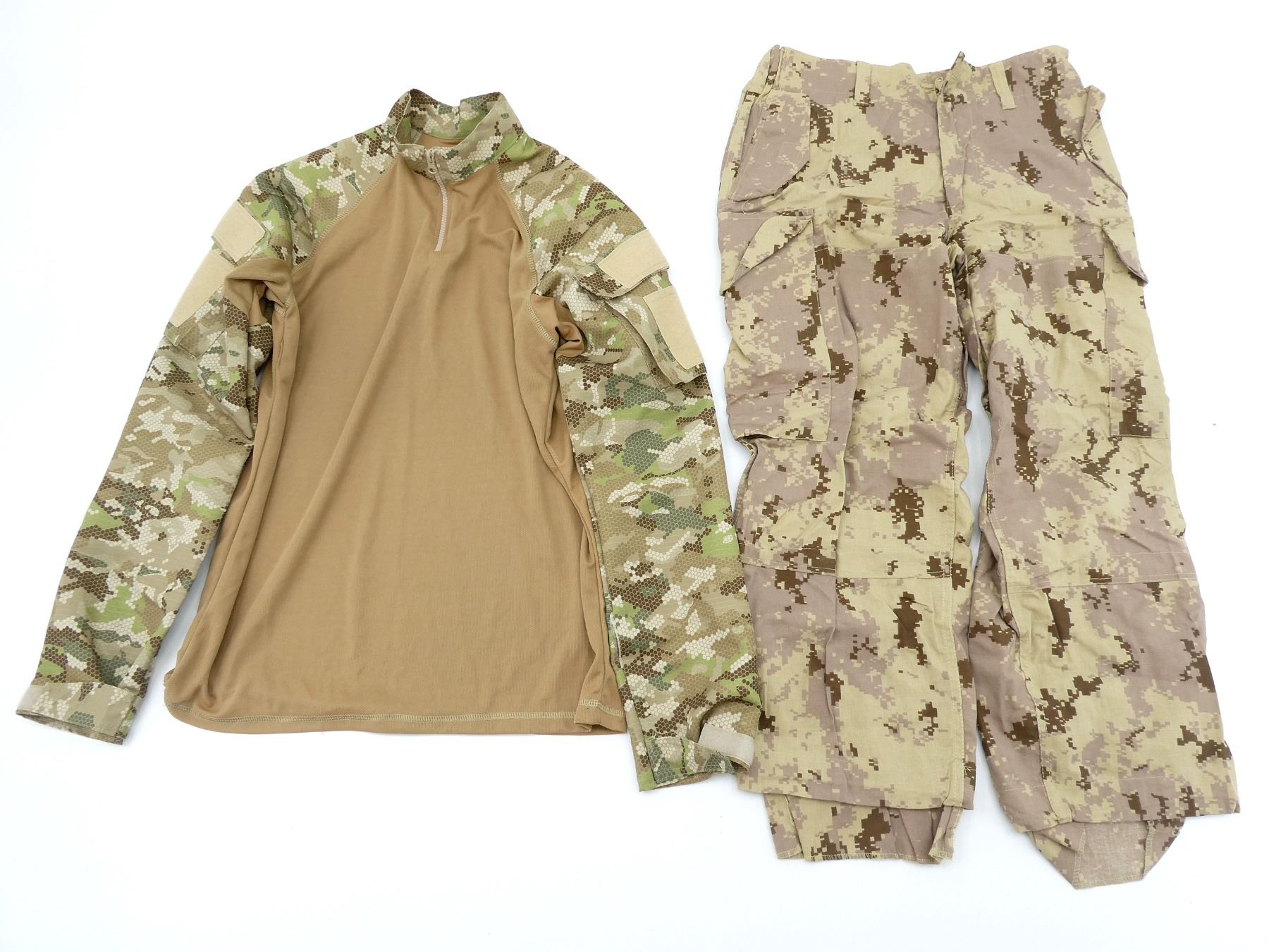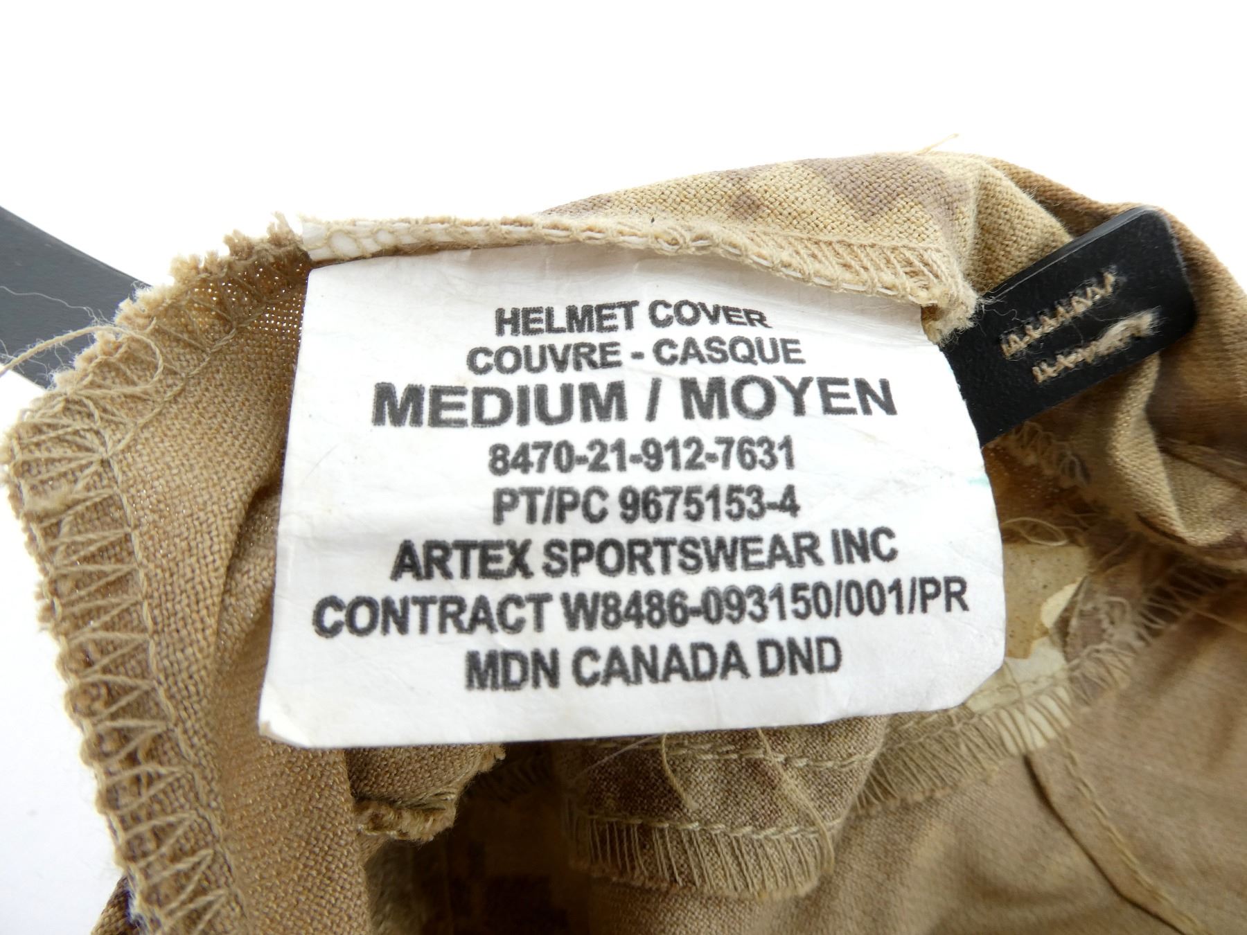 LOT INCLUDES; (2) CANADIAN MILITARY TAN CADPAT AR PANTS, SIZE 6434 (64" HEIGHT, 34" WAIST), CONSIGNOR STATES: "NEVER ISSUED", VARIOUS LABELS / MARKINGS, ZIPPERED-FLY (WORKS), (1) CANADIAN MILITARY TAN CADPAT AR COAT, SIZE 6740 (67" HEIGHT, 40" CHEST), VARIOUS LABELS / MARKINGS, BUTTON-FRONT, SHOWS WEAR, (1) CANADIAN MILITARY BLACK LEATHER BOOTS, SIZE 250-106, MARKED: "912084, 8430-20-006-2523, 250-106, ITEM 1113, 1113" ETC., ONE SHOE LACE, WIDEST PART OF SOLE APPROX. 4", SOLE OVERALL LENGTH APPROX. 11.5", (1) CANADIAN MILITARY TAN CADPAT HELMET COVER, SIZE MEDIUM, VARIOUS LABELS / MARKINGS & (1) COLUMBIAN ARMY MULTI-CAMO SHIRT, SIZE XL, MARKED: "XL", NO OTHER VISIBLE MARKINGS, PARTIALLY ZIPPERED-FRONT (WORKS). SEE PHOTOS.
