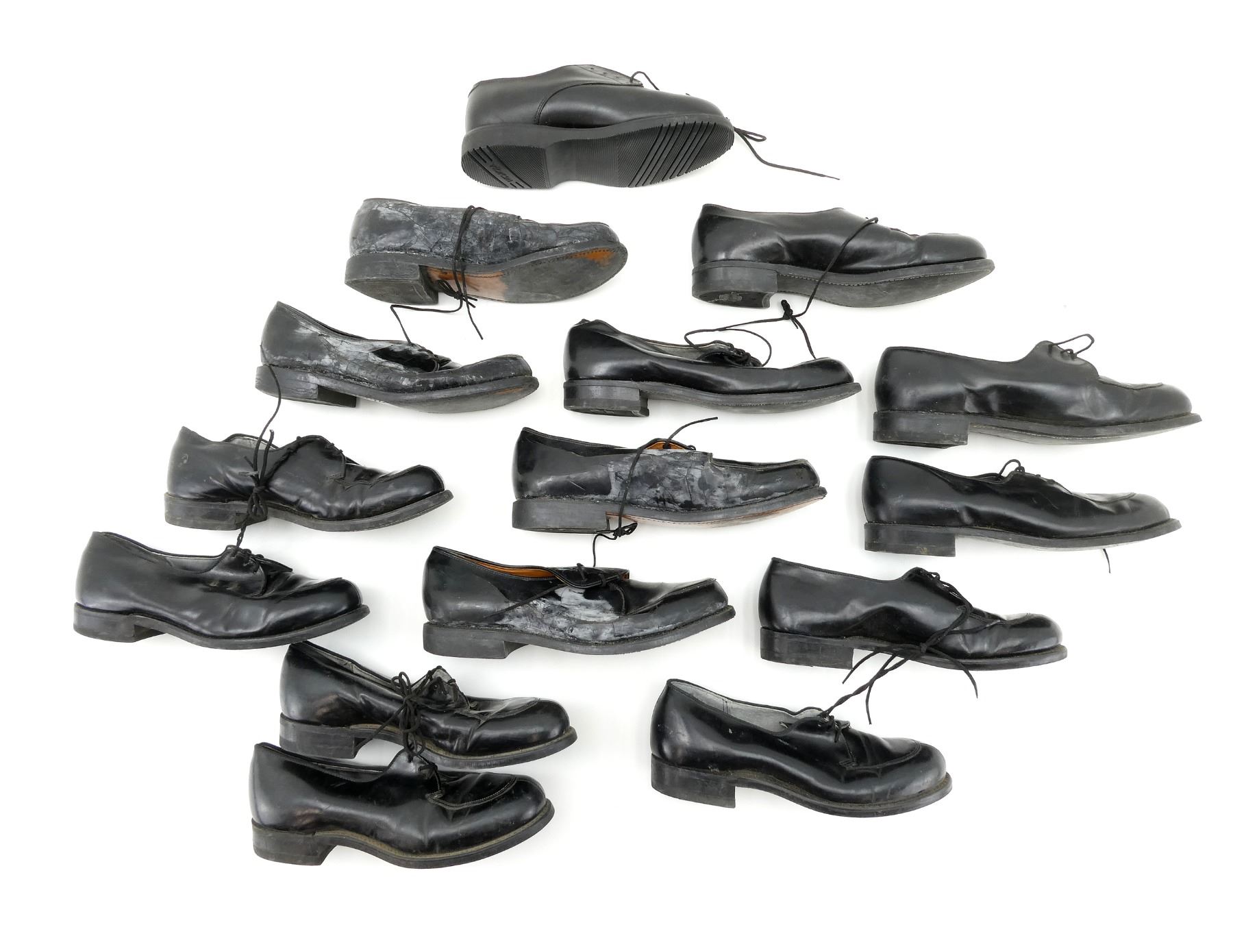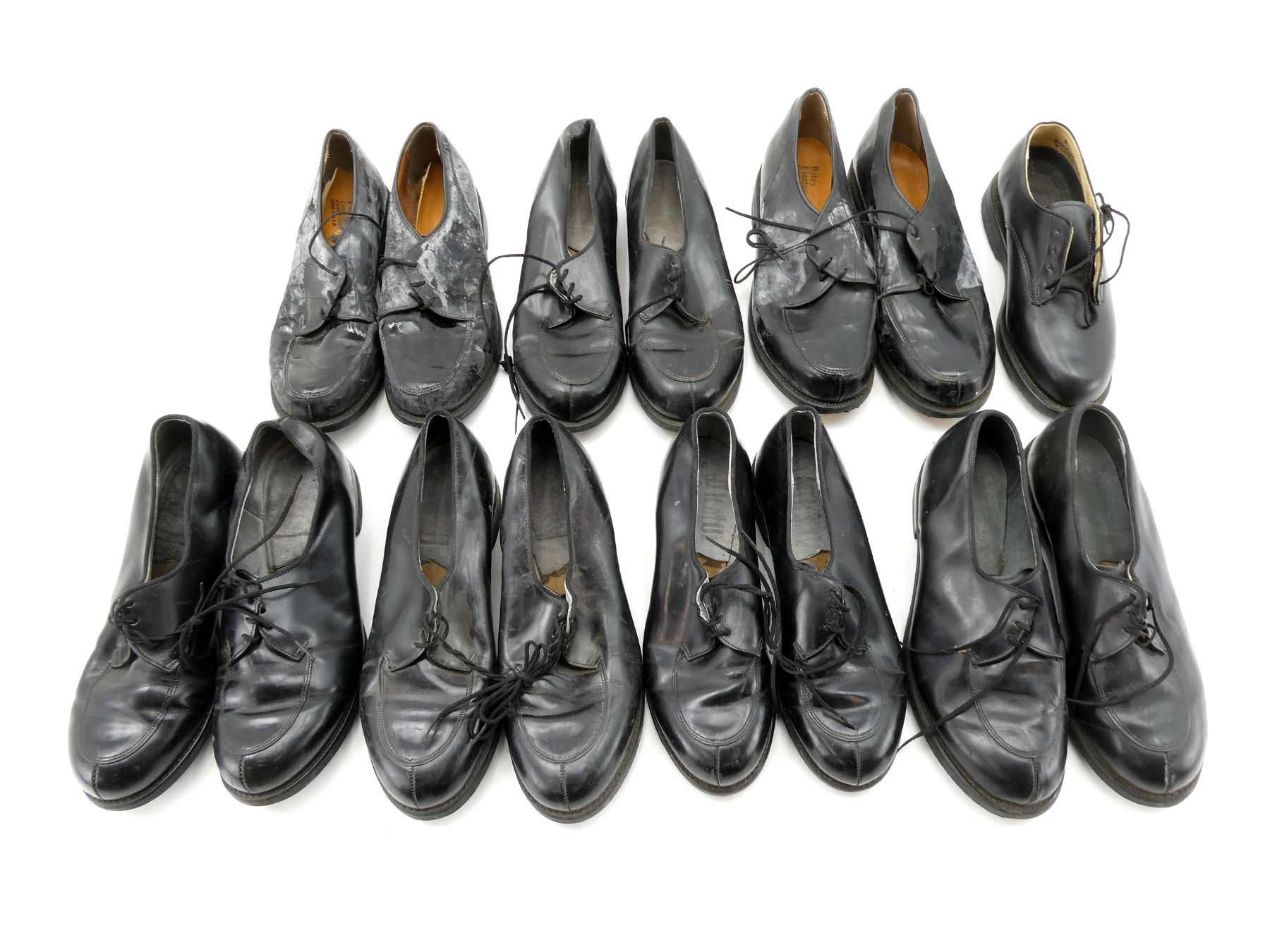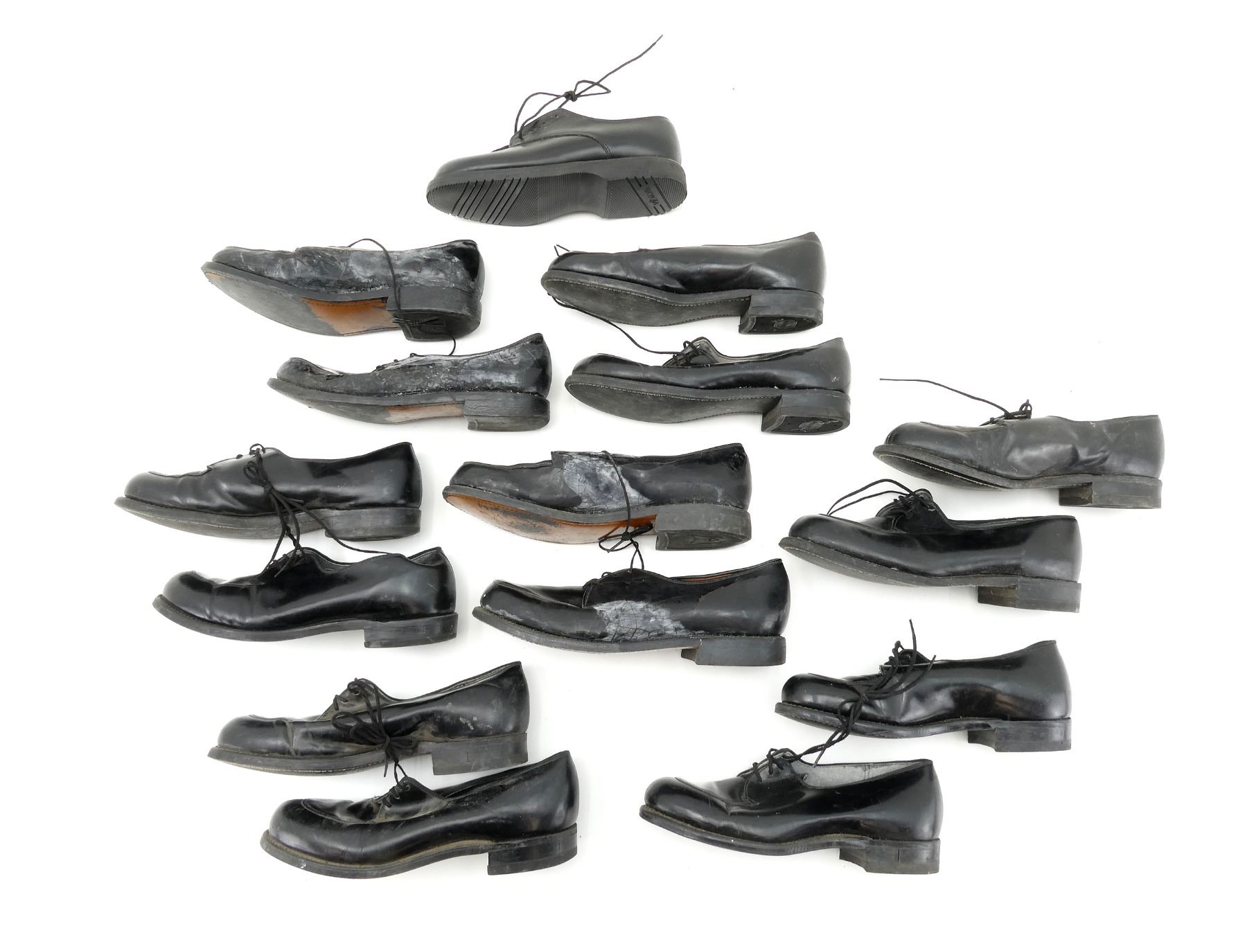 LOT INCLUDES; (4) U.S. MILITARY PAIRS OF BLACK LEATHER DRESS SHOES, SIZES 6.5C & 7.5D, MARKED: "CRADDOCK-TERRY INC." ETC., WITH LACES, SHOWS WEAR / TEAR, (3) UNKNOWN MILITARY PAIRS OF BLACK LEATHER DRESS SHOES, SIZES 7 / 7.5 / 9, VARIOUS MARKINGS, WITH LACES, SHOWS WEAR & (1) CANADIAN MILITARY BLACK LEATHER SHOE, SIZE 5, MISSING MATE, VARIOUS MARKINGS, WITH LACES & SHOWS WEAR. SEE PHOTOS.