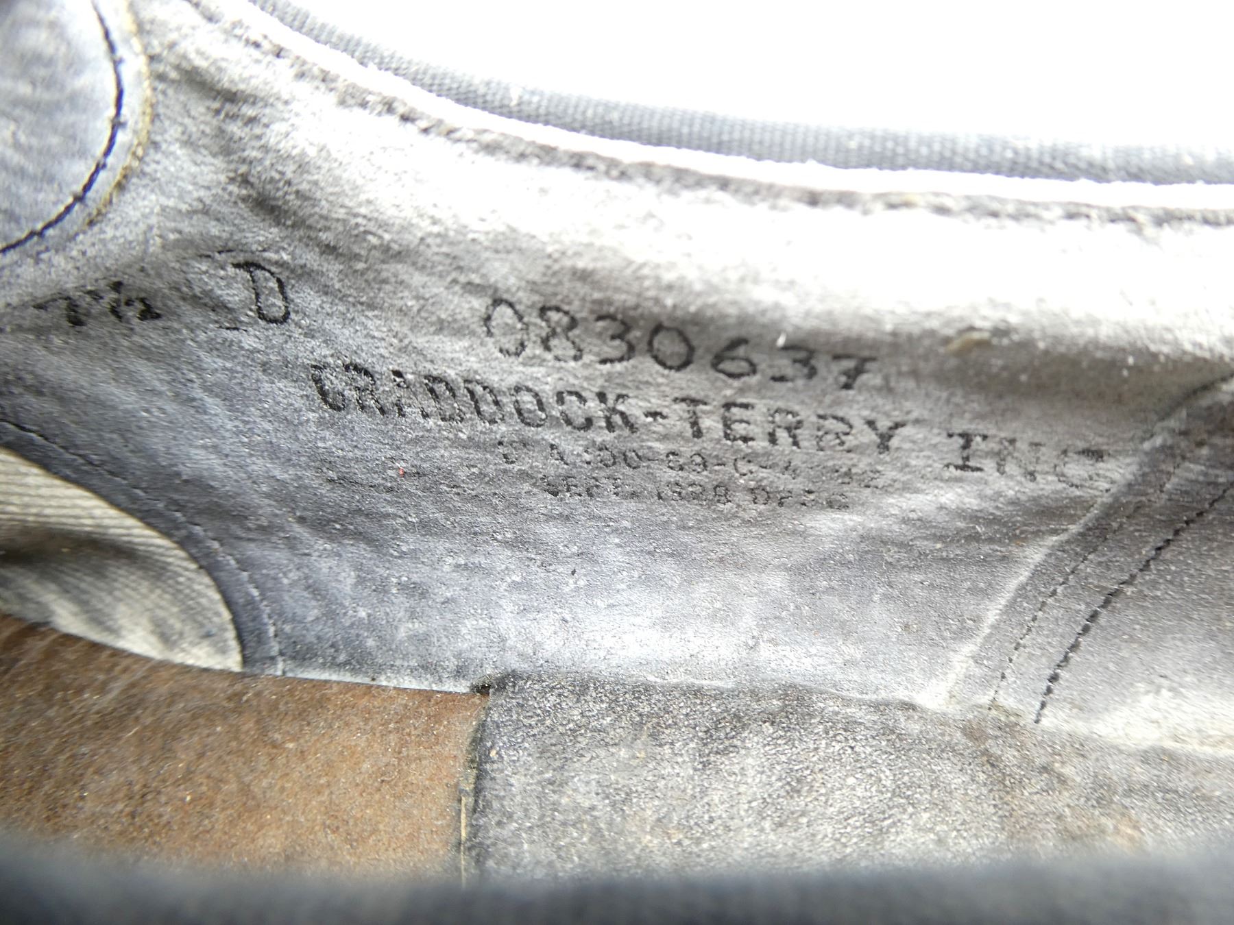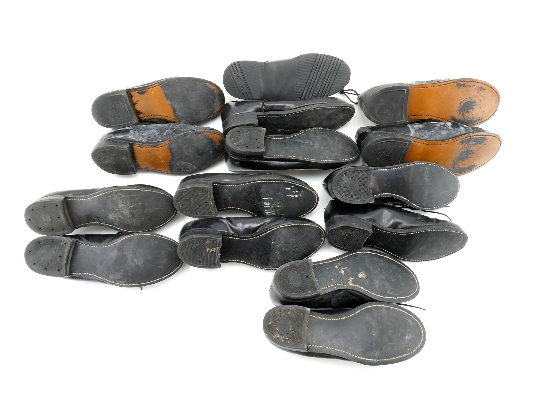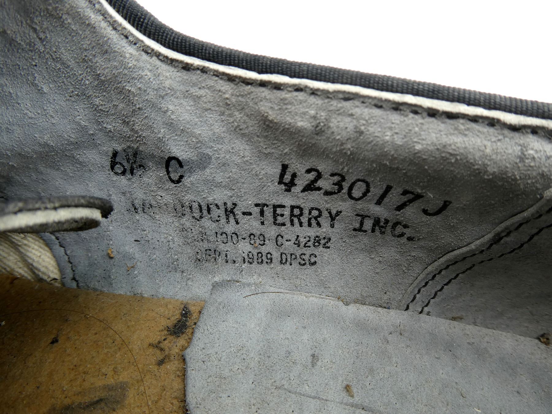 LOT INCLUDES; (4) U.S. MILITARY PAIRS OF BLACK LEATHER DRESS SHOES, SIZES 6.5C & 7.5D, MARKED: "CRADDOCK-TERRY INC." ETC., WITH LACES, SHOWS WEAR / TEAR, (3) UNKNOWN MILITARY PAIRS OF BLACK LEATHER DRESS SHOES, SIZES 7 / 7.5 / 9, VARIOUS MARKINGS, WITH LACES, SHOWS WEAR & (1) CANADIAN MILITARY BLACK LEATHER SHOE, SIZE 5, MISSING MATE, VARIOUS MARKINGS, WITH LACES & SHOWS WEAR. SEE PHOTOS.