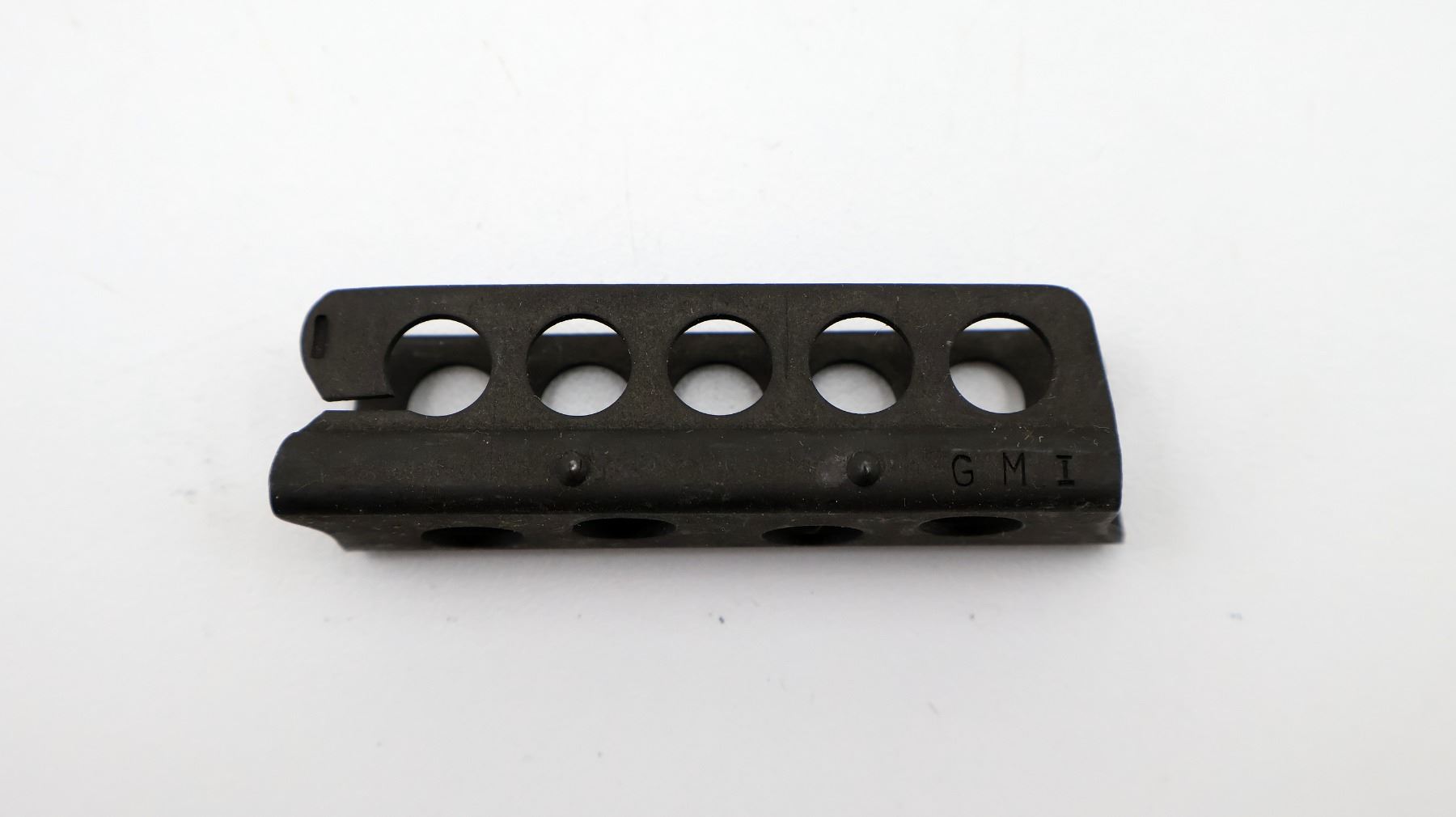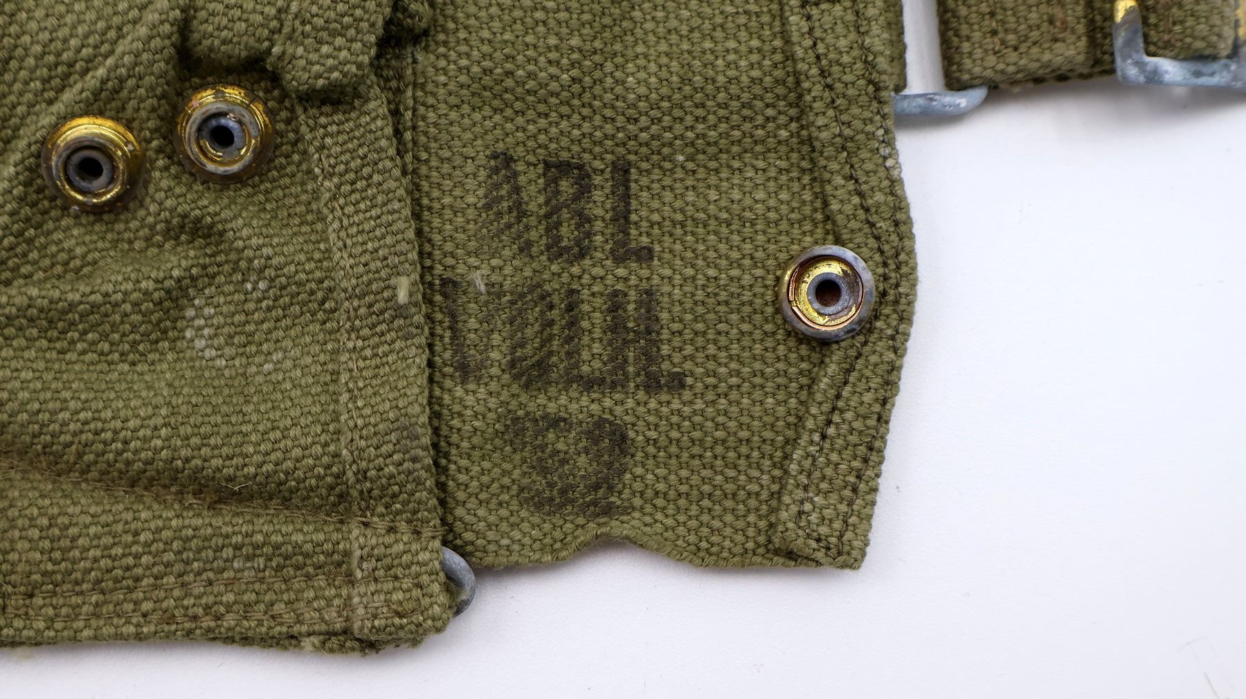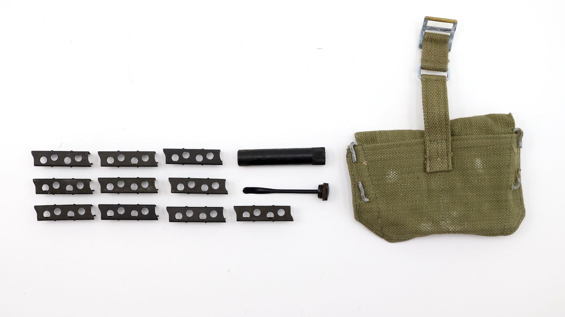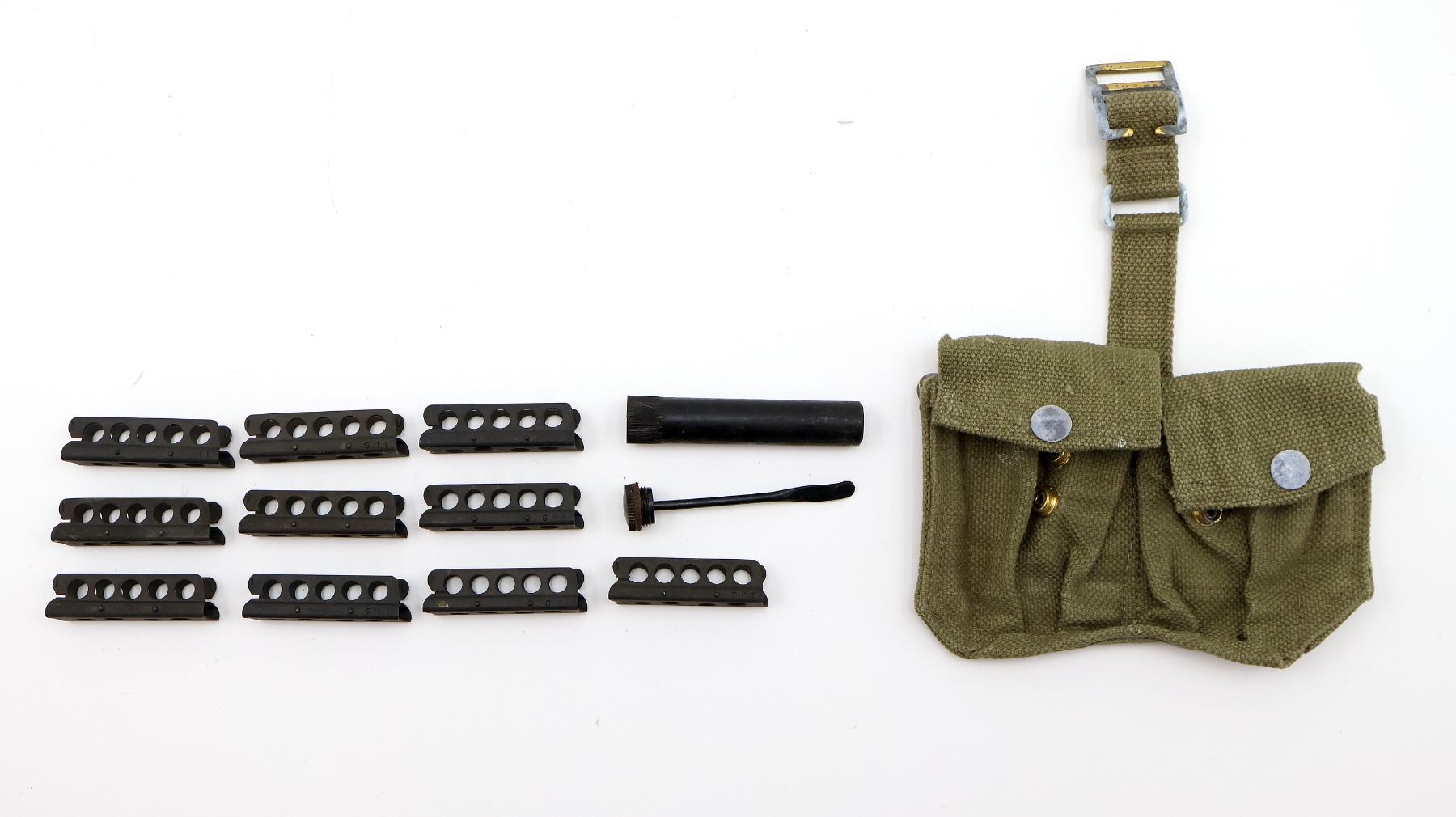 LOT INCLUDES; (1) BELGIAN LEE ENFIELD GREEN CANVAS AMMO POUCH, FAINTLY MARKED: "ABL VOLH. '52", 2-POCKET WITH METAL BELT HOOKS, (1) BLACK POLYMER OILER, SPOON INTACT & (10) .303 BR STRIPPER CLIPS, 5-RND, BLUED STEEL, VARIOUS MARKINGS. SEE PHOTOS.