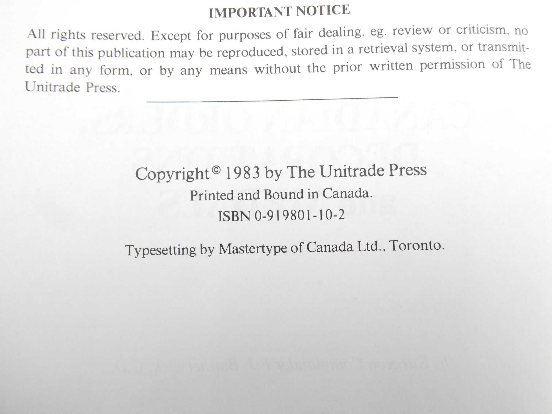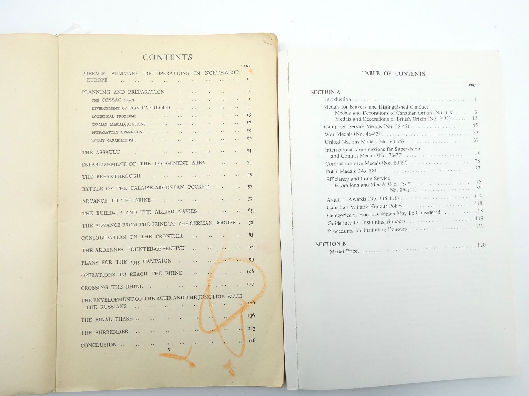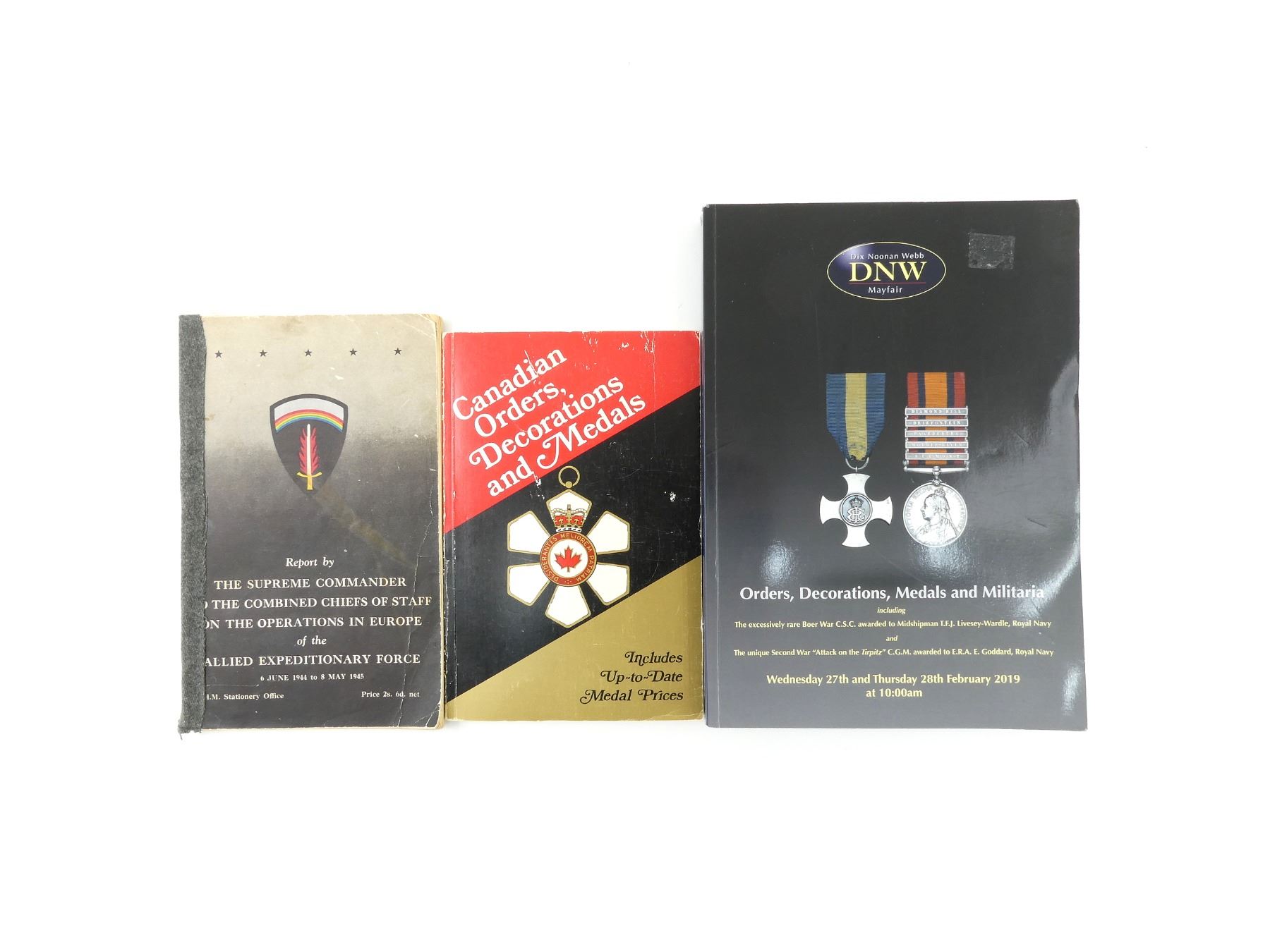 LOT INCLUDES; (1) "CANADIAN ORDERS, DECORATIONS AND MEDALS" BOOK BY SURGEON COMMANDER F.J. BLATHERWICK, C.D., SOFT COVER, ISBN: 0-919801-10-2, (1) "REPORT BY THE SUPREME COMMANDER TO THE COMBINED CHIEFS OF STAFF ON THE OPERATIONS IN EUROPE OF THE ALLIED EXPEDITIONARY FORCE" BOOK, SOFT COVER, 1946 & (1) "DIX NOONAN WEBB ORDERS, DECORATIONS, MEDALS AND MILITARIA" AUCTION CATALOGUE BOOK, SOFT COVER, 2019. SEE PHOTOS.