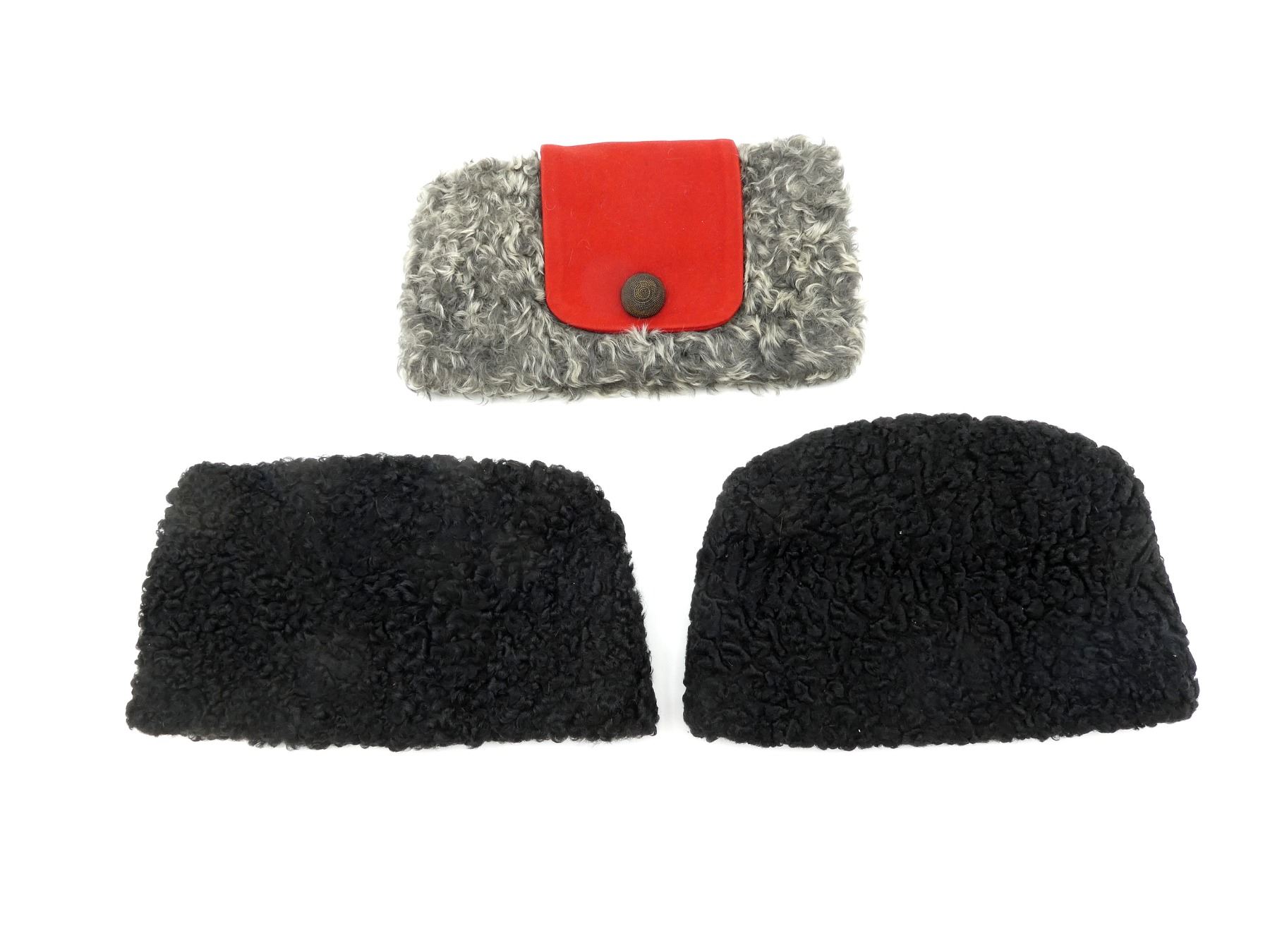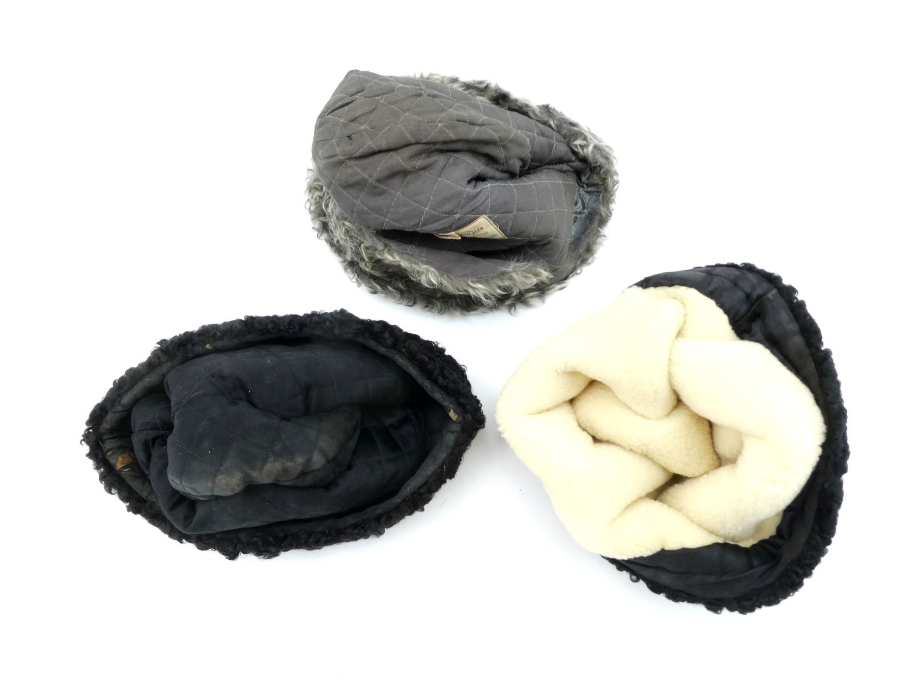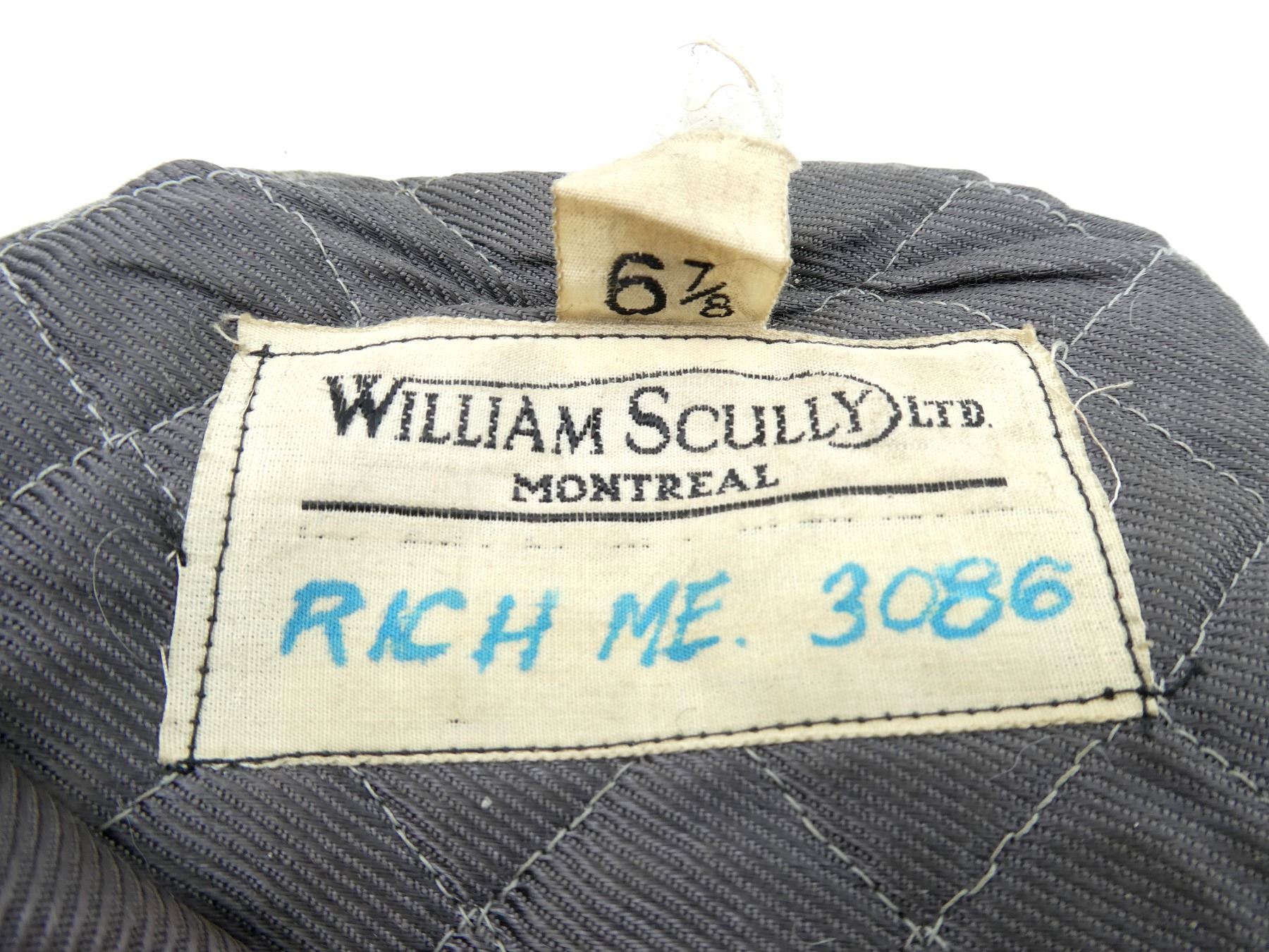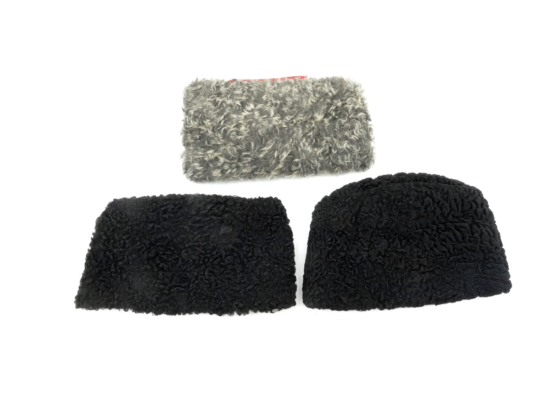 LOT INCLUDES; (2) BLACK WOOL MILITARY STYLE WINTER HATS, NO VISIBLE MARKINGS, ONE IS FLEECE / WOOL LINED, SIZES UNKNOWN, SHOWS AGE / WEAR & (1) CANADIAN MILITARY COLLEGE WOOL HAT, INSIDE MARKED: "WILLIAM SCULLY LTD., MONTREAL, RICH ME. 3086", "6 7/8" (SIZING), SHOWS AGE / WEAR. SEE PHOTOS.