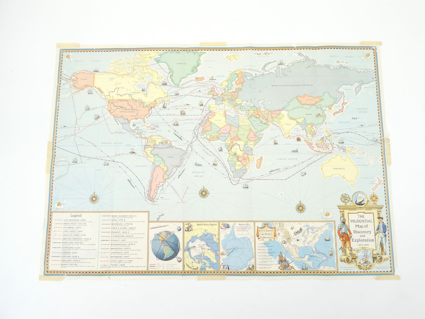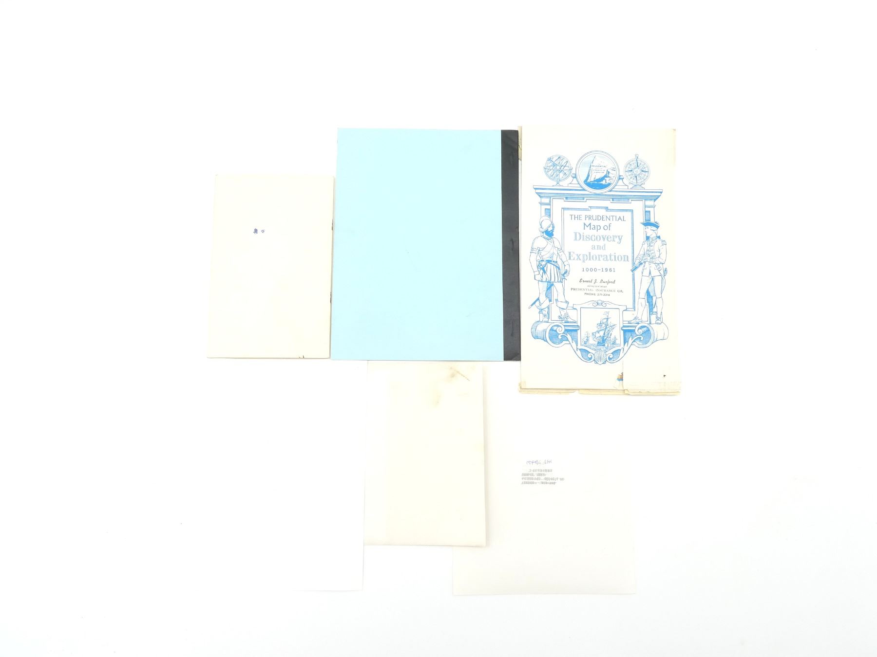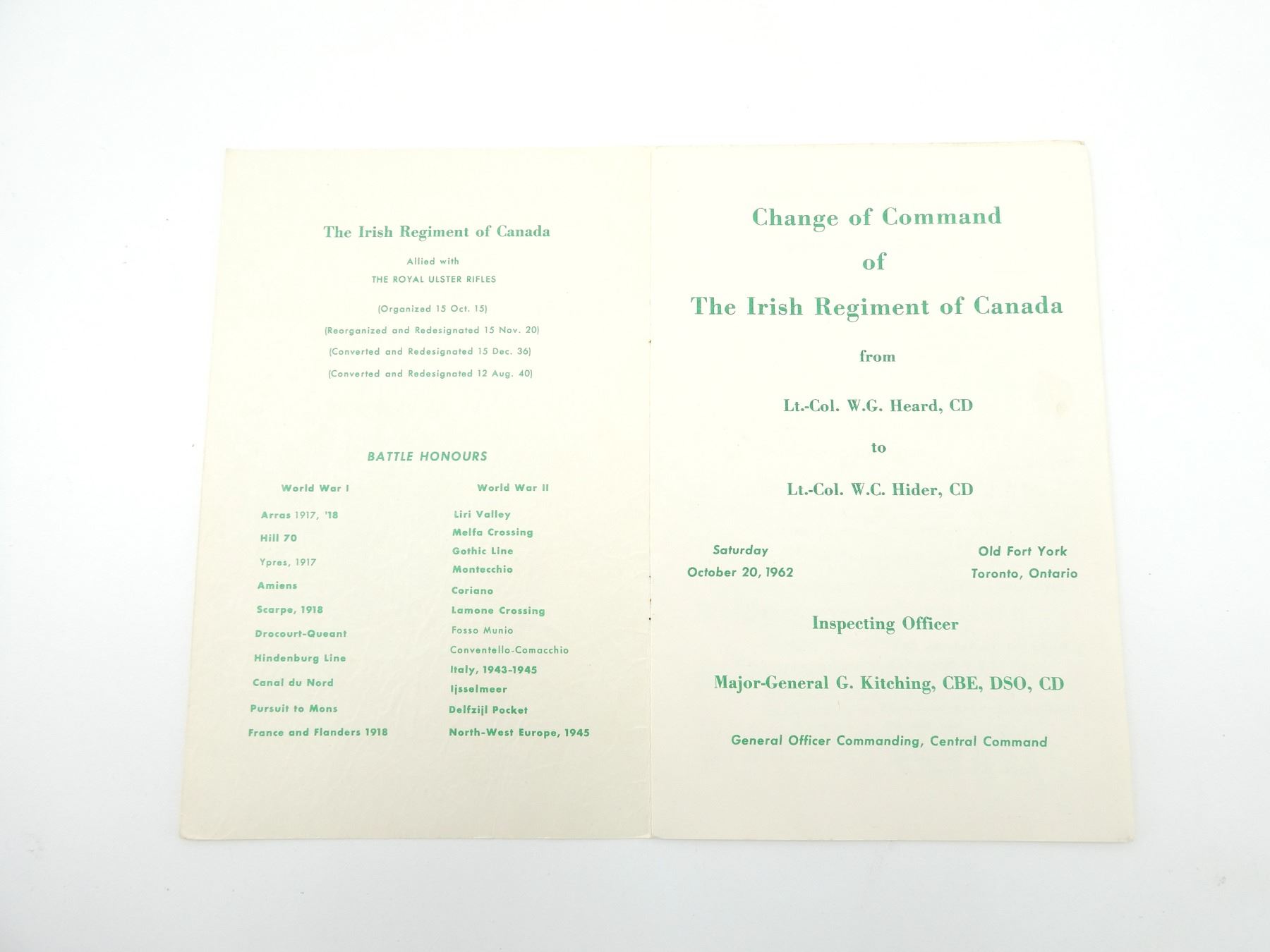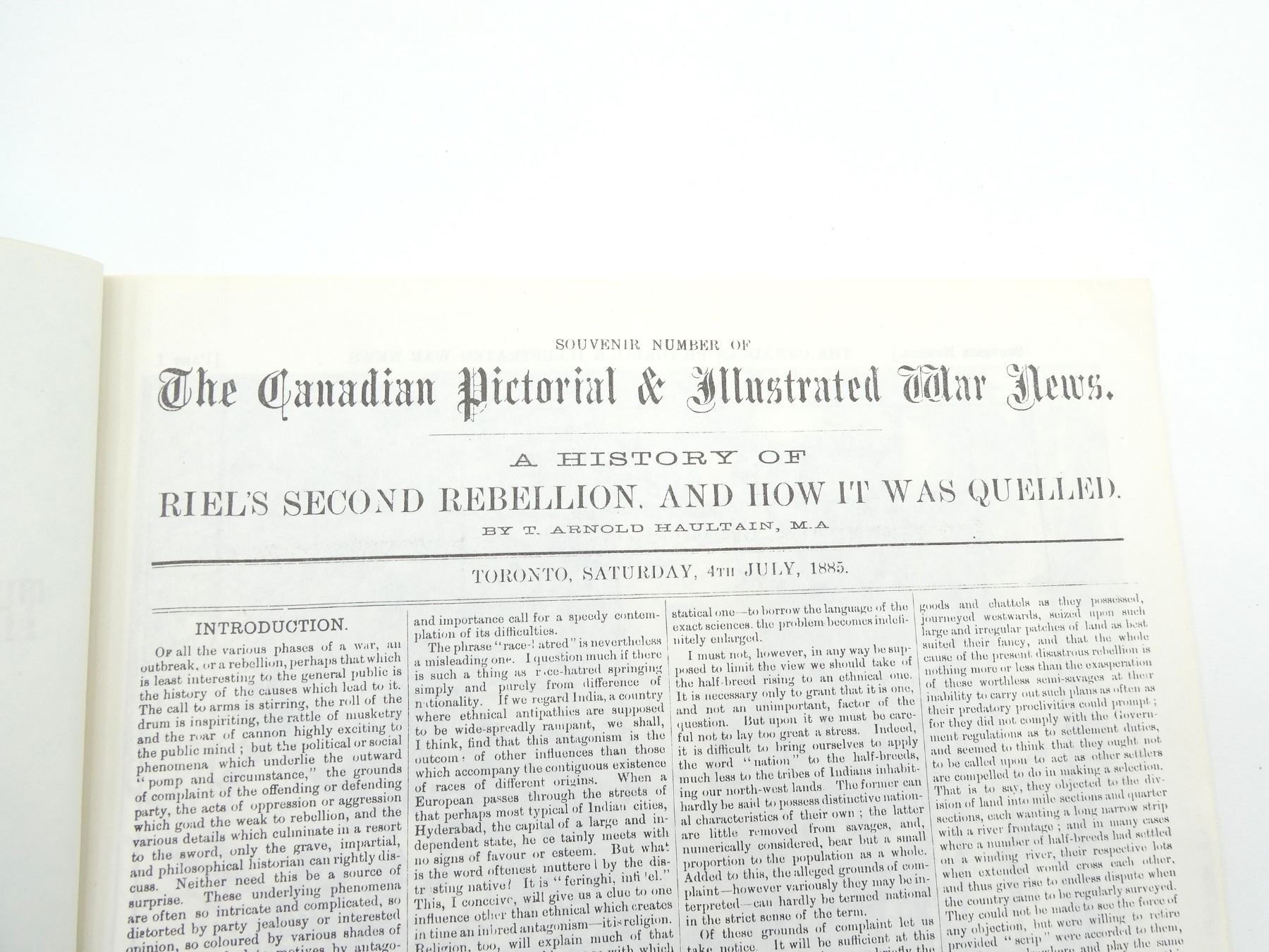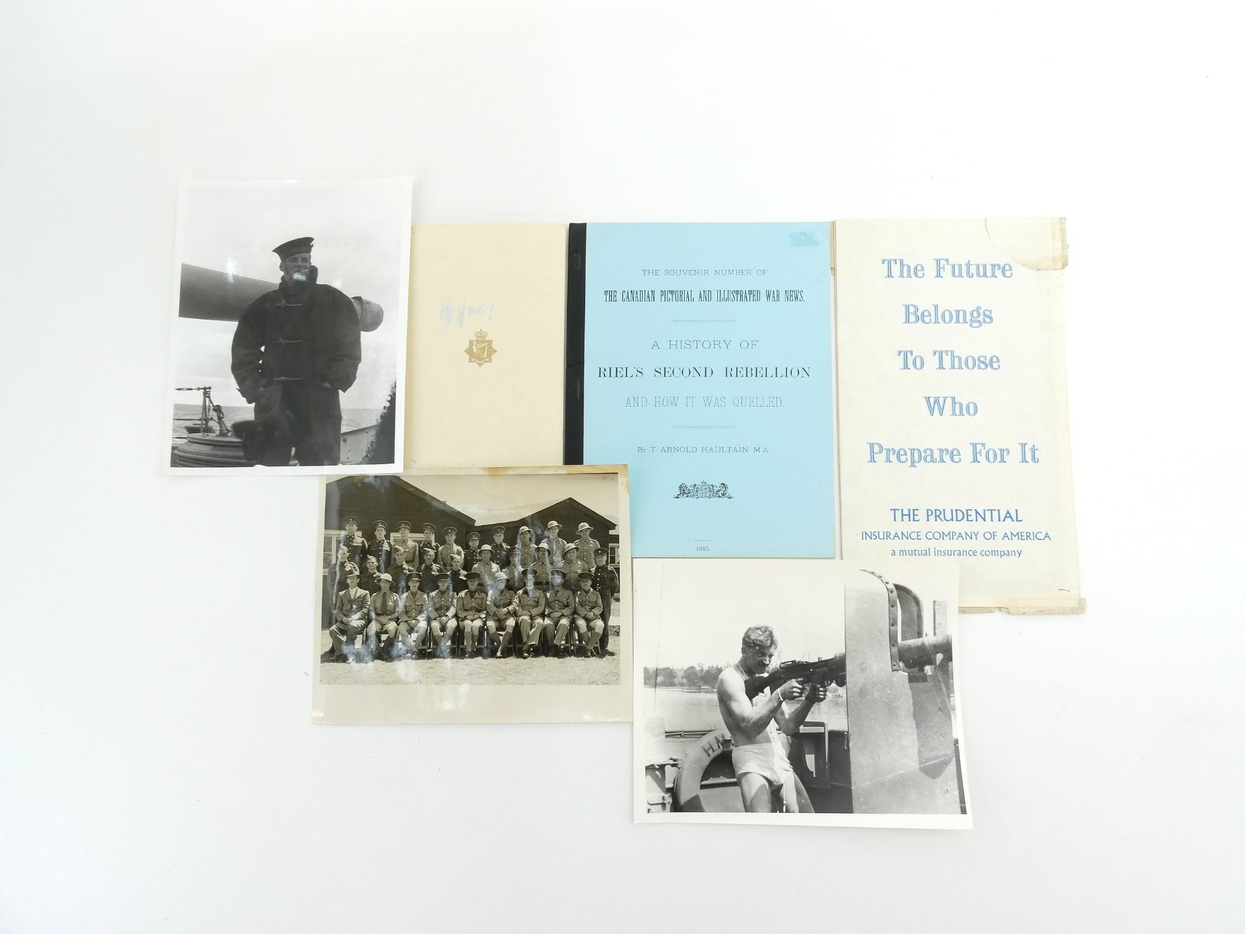 LOT INCLUDES; (3) CANADIAN MILITARY BLACK / WHITE PHOTOS, TWO ARE NAVAL SOLDIERS, ONE IS OF A BATTALION / BRIGADE, UNKNOWN, NO TITLES OR DESCRIPTIONS, (1) "CHANGE OF COMMAND, THE IRISH REGIMENT OF CANADA" PROGRAM PAMPHLET, DATED: "SATURDAY OCTOBER 20, 1962", (1) "THE SOUVENIR NUMBER OF THE CANADIAN PICTORIAL AND ILLUSTRATED WAR NEWS, A HISTORY OF RIEL'S SECOND REBELLION AND HOW IT WAS QUELLED" BOOK BY T. ARNOLD HAULTAIN, M.A., DATED 1885, APPEARS TO BE A BOUND REPRINT / PHOTO COPY & (1) "THE PRUDENTIAL MAP OF DISCOVERY AND EXPLORATION 1000-1961", COPY RIGHT 1961, DETAILING MAJOR EXPLORATIONS WITH LEGEND CORRESPONDING TO EACH EXPLORATION, APPROX. 36" X 25". SEE PHOTOS.